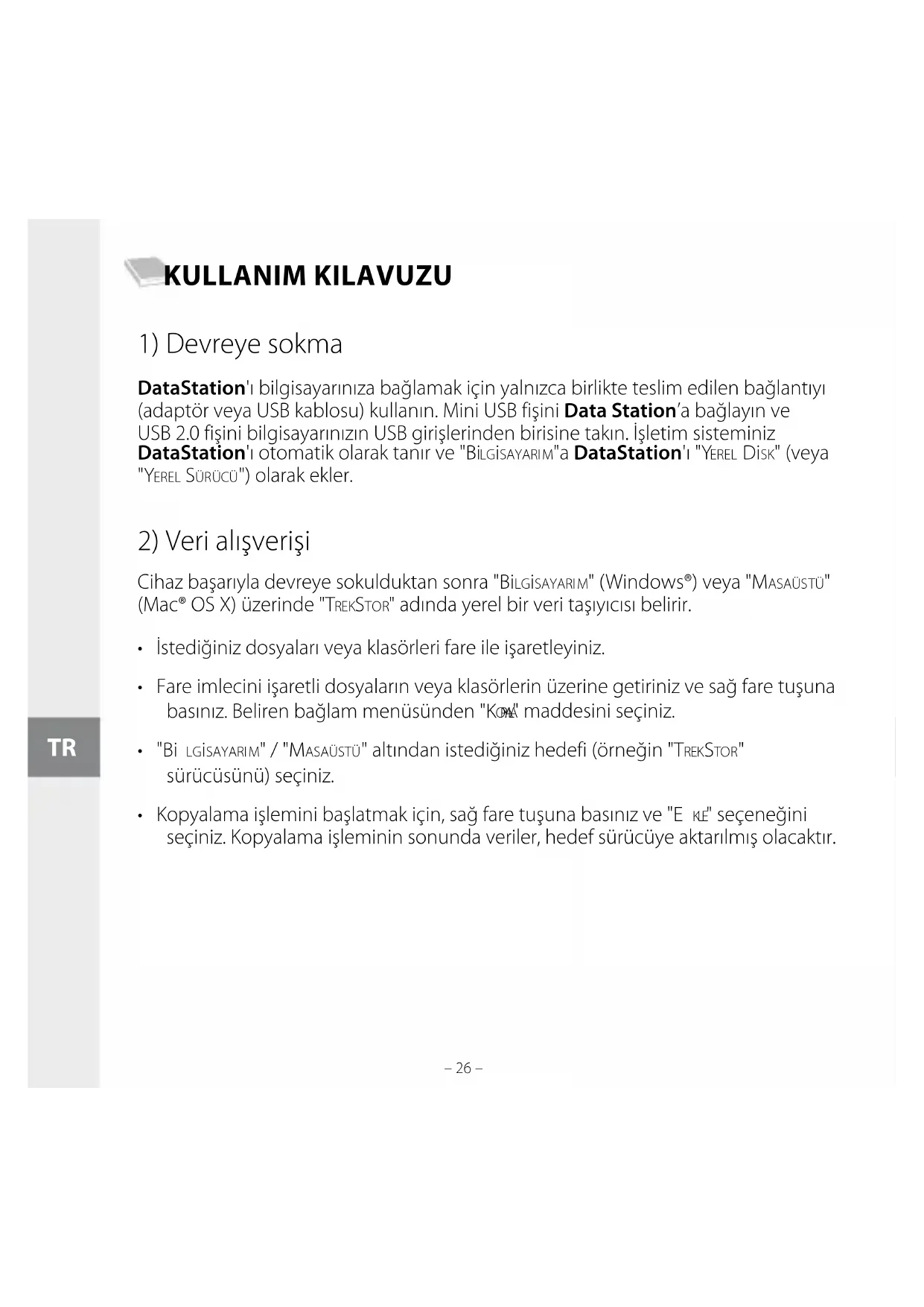 Cihaz başarıyla devreye sokulduktan sonra "bil g is A y A r i M " (Windows®) veya "MA s A ü s t ü " (Mac® OS X) üzerinde "t r e k st o r " adında yerel bir veri taşıyıcısı belirir.