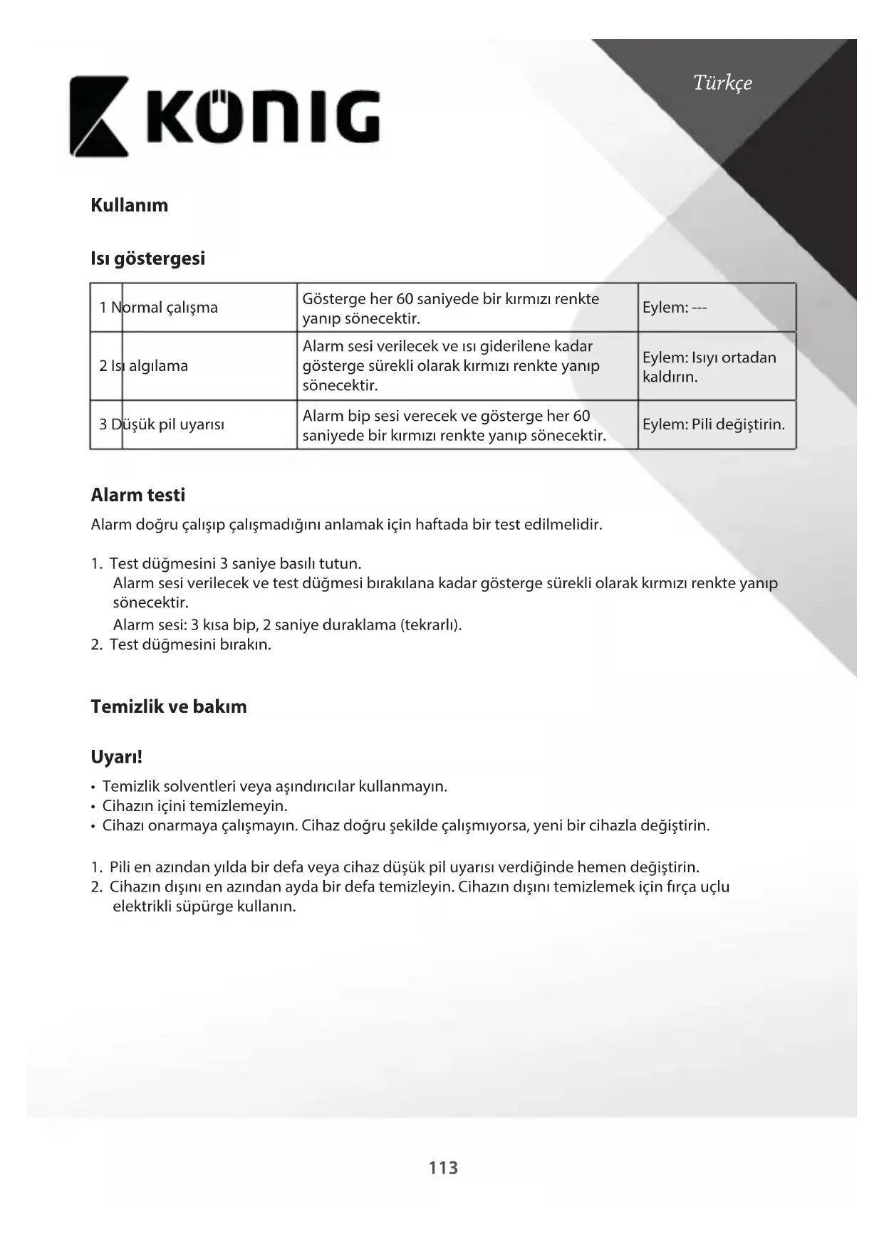 - Cihazı boyamayın. Alan Evet Hayır Oturma odası X Yemek odası X Mutfak X Banyo / Tuvalet X Yatak odası X Koridor X Çatı katı X Bodrum X Garaj X Kazan dairesi X112 Türkçe min.10 cm min.10 cm max. 30 cm 122 cm 90 cm 90 cm 5 mm113 Türkçe Kullanım Isı göstergesi 1 Normal çalışma Gösterge her 60 saniyede bir kırmızı renkte yanıp sönecektir. Eylem: --- 2 Isı algılama Alarm sesi verilecek ve ısı giderilene kadar gösterge sürekli olarak kırmızı renkte yanıp sönecektir. Eylem: Isıyı ortadan kaldırın. 3 Düşük pil uyarısı Alarm bip sesi verecek ve gösterge her 60 saniyede bir kırmızı renkte yanıp sönecektir. Eylem: Pili değiştirin. Alarm testi Alarm doğru çalışıp çalışmadığını anlamak için haftada bir test edilmelidir.