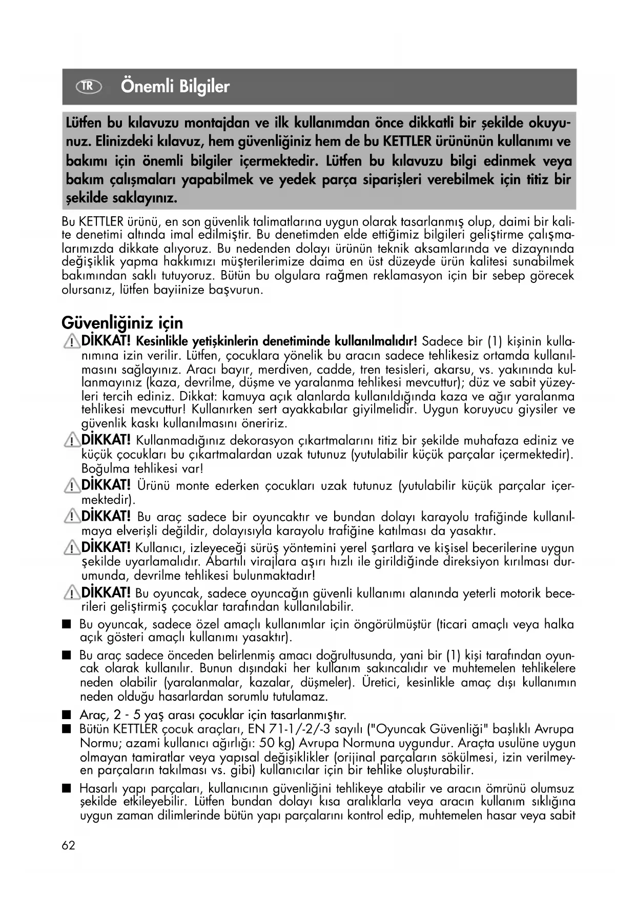 RUSÖnemli Bilgiler Bu KETTLER ürünü, en son güvenlik talimatlarına uygun olarak tasarlanmış olup, daimi bir kali- te denetimi altında imal edilmiştir. Bu denetimden elde ettiğimiz bilgileri geliştirme çalışma- larımızda dikkate alıyoruz. Bu nedenden dolayı ürünün teknik aksamlarında ve dizaynında değişiklik yapma hakkımızı müşterilerimize daima en üst düzeyde ürün kalitesi sunabilmek bakımından saklı tutuyoruz. Bütün bu olgulara rağmen reklamasyon için bir sebep görecek olursanız, lütfen bayiinize başvurun. Güvenliğiniz için DİKKAT! Kesinlikle yetişkinlerin denetiminde kullanılmalıdır! Sadece bir (1) kişinin kulla- nımına izin verilir. Lütfen, çocuklara yönelik bu aracın sadece tehlikesiz ortamda kullanıl- masını sağlayınız. Aracı bayır, merdiven, cadde, tren tesisleri, akarsu, vs. yakınında kul- lanmayınız (kaza, devrilme, düşme ve yaralanma tehlikesi mevcuttur); düz ve sabit yüzey- leri tercih ediniz. Dikkat: kamuya açık alanlarda kullanıldığında kaza ve ağır yaralanma tehlikesi mevcuttur! Kullanırken sert ayakkabılar giyilmelidir. Uygun koruyucu giysiler ve güvenlik kaskı kullanılmasını öneririz. DİKKAT! Kullanmadığınız dekorasyon çıkartmalarını titiz bir şekilde muhafaza ediniz ve küçük çocukları bu çıkartmalardan uzak tutunuz (yutulabilir küçük parçalar içermektedir). Boğulma tehlikesi var! DİKKAT! Ürünü monte ederken çocukları uzak tutunuz (yutulabilir küçük parçalar içer- mektedir). DİKKAT! Bu araç sadece bir oyuncaktır ve bundan dolayı karayolu trafiğinde kullanıl- maya elverişli değildir, dolayısıyla karayolu trafiğine katılması da yasaktır. DİKKAT! Kullanıcı, izleyeceği sürüş yöntemini yerel şartlara ve kişisel becerilerine uygun şekilde uyarlamalıdır. Abartılı virajlara aşırı hızlı ile girildiğinde direksiyon kırılması dur- umunda, devrilme tehlikesi bulunmaktadır! DİKKAT! Bu oyuncak, sadece oyuncağın güvenli kullanımı alanında yeterli motorik bece- rileri geliştirmiş çocuklar tarafından kullanılabilir. ■ Bu oyuncak, sadece özel amaçlı kullanımlar için öngörülmüştür (ticari amaçlı veya halka açık gösteri amaçlı kullanımı yasaktır). ■ Bu araç sadece önceden belirlenmiş amacı doğrultusunda, yani bir (1) kişi tarafından oyun- cak olarak kullanılır. Bunun dışındaki her kullanım sakıncalıdır ve muhtemelen tehlikelere neden olabilir (yaralanmalar, kazalar, düşmeler). Üretici, kesinlikle amaç dışı kullanımın neden olduğu hasarlardan sorumlu tutulamaz. ■ Araç, 2 - 5 yaş arası çocuklar için tasarlanmıştır. ■ Bütün KETTLER çocuk araçları, EN 71-1/-2/-3 sayılı ("Oyuncak Güvenliği" başlıklı Avrupa Normu; azami kullanıcı ağırlığı: 50 kg) Avrupa Normuna uygundur. Araçta usulüne uygun olmayan tamiratlar veya yapısal değişiklikler (orijinal parçaların sökülmesi, izin verilmey- en parçaların takılması vs. gibi) kullanıcılar için bir tehlike oluşturabilir. ■ Hasarlı yapı parçaları, kullanıcının güvenliğini tehlikeye atabilir ve aracın ömrünü olumsuz şekilde etkileyebilir. Lütfen bundan dolayı kısa aralıklarla veya aracın kullanım sıklığına uygun zaman dilimlerinde bütün yapı parçalarını kontrol edip, muhtemelen hasar veya sabit Lütfen bu kılavuzu montajdan ve ilk kullanımdan önce dikkatli bir şekilde okuyu- nuz. Elinizdeki kılavuz, hem güvenliğiniz hem de bu KETTLER ürününün kullanımı ve bakımı için önemli bilgiler içermektedir. Lütfen bu kılavuzu bilgi edinmek veya bakım çalışmaları yapabilmek ve yedek parça siparişleri verebilmek için titiz bir şekilde saklayınız.