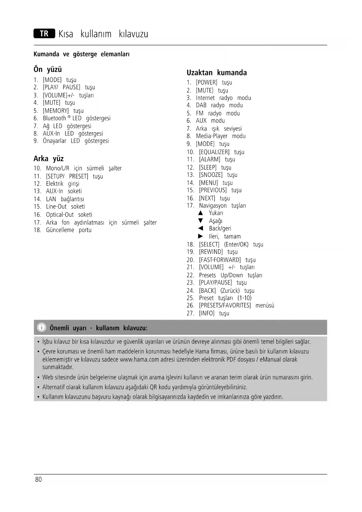 - Çevre koruması ve önemli ham maddelerin korunması hedeyle Hama rması, ürüne basılı bir kullanım kılavuzu eklememiştir ve kılavuzu sadece www.hama.com adresi üzerinden elektronik PDF dosyası / eManual olarak sunmaktadır.