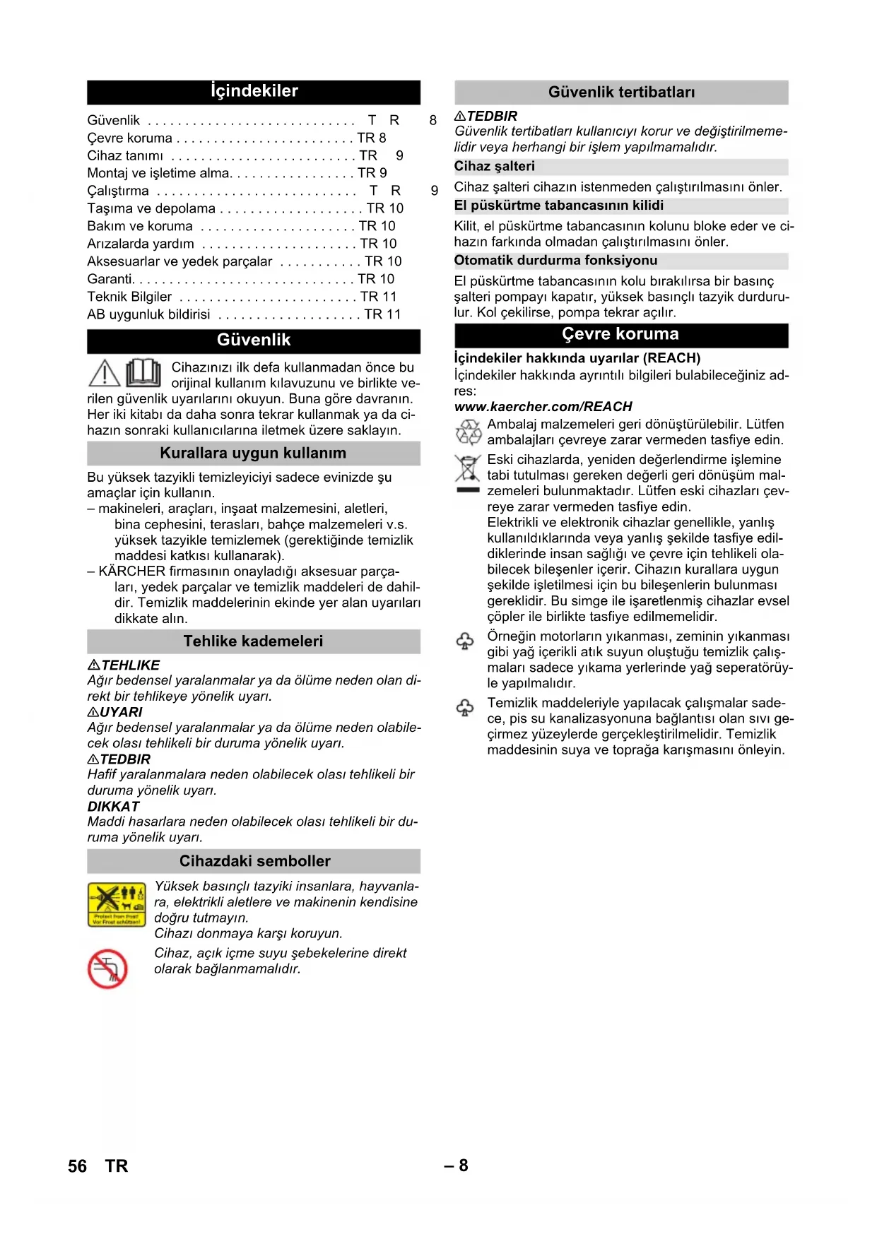 4,7 5,6 5,8 kg Με την επιφύλαξη τεχνικών αλλαγών. Δήλωση Συμμόρφωσης των ΕE Προϊόν: Σύστημα καθαρισμού υψηλής πίεσης Τύπος: 1.673-xxx Σχετικές οδηγίες των ΕE 2000/14/EΚ 2014/30/EE 2006/42/EK (+2009/127/EK) 2011/65/EE Εφαρμοσθέντα εναρμονισμένα πρότυπα EN 50581 EN 55014–1: 2006+A1: 2009+A2: 2011 EN 55014–2: 2015 EN 60335–1 EN 60335–2–79 EN 61000–3–2: 2014 EN 61000–3–3: 2013 EN 62233: 2008 Εφαρμοσθείσα διαδικασία συμμόρφωσης 2000/14/EΚ: Παράρτημα V στάθμη ηχητικής πίεσης dB(A) Μετρημένη: 89 Εγγυημένη: 91 CEO Head of Approbation 55EL– 8 Cihazınızı ilk defa kullanmadan önce bu orijinal kullanım kılavuzunu ve birlikte ve- rilen güvenlik uyarılarını okuyun. Buna göre davranın. Her iki kitabı da daha sonra tekrar kullanmak ya da ci- hazın sonraki kullanıcılarına iletmek üzere saklayın. Bu yüksek tazyikli temizleyiciyi sadece evinizde şu amaçlar için kullanın. – makineleri, araçları, inşaat malzemesini, aletleri, bina cephesini, terasları, bahçe malzemeleri v.s. yüksek tazyikle temizlemek (gerektiğinde temizlik maddesi katkısı kullanarak). – KÄRCHER firmasının onayladığı aksesuar parça- ları, yedek parçalar ve temizlik maddeleri de dahil- dir. Temizlik maddelerinin ekinde yer alan uyarıları dikkate alın. TEHLIKE Ağır bedensel yaralanmalar ya da ölüme neden olan di- rekt bir tehlikeye yönelik uyarı. 몇 UYARI Ağır bedensel yaralanmalar ya da ölüme neden olabile- cek olası tehlikeli bir duruma yönelik uyarı. 몇 TEDBIR Hafif yaralanmalara neden olabilecek olası tehlikeli bir duruma yönelik uyarı. DIKKAT Maddi hasarlara neden olabilecek olası tehlikeli bir du- ruma yönelik uyarı. 몇 TEDBIR Güvenlik tertibatları kullanıcıyı korur ve değiştirilmeme- lidir veya herhangi bir işlem yapılmamalıdır. Cihaz şalteri cihazın istenmeden çalıştırılmasını önler. Kilit, el püskürtme tabancasının kolunu bloke eder ve ci- hazın farkında olmadan çalıştırılmasını önler. El püskürtme tabancasının kolu bırakılırsa bir basınç şalteri pompayı kapatır, yüksek basınçlı tazyik durduru- lur. Kol çekilirse, pompa tekrar açılır. İçindekiler hakkında uyarılar (REACH) İçindekiler hakkında ayrıntılı bilgileri bulabileceğiniz ad- res: www.kaercher.com/REACH İçindekiler Güvenlik . . . . . . . . . . . . . . . . . . . . . . . . . . . .TR 8 Çevre koruma . . . . . . . . . . . . . . . . . . . . . . . . TR 8 Cihaz tanımı . . . . . . . . . . . . . . . . . . . . . . . . . TR9 Montaj ve işletime alma. . . . . . . . . . . . . . . . . TR 9 Çalıştırma . . . . . . . . . . . . . . . . . . . . . . . . . . .TR 9 Taşıma ve depolama . . . . . . . . . . . . . . . . . . . TR 10 Bakım ve koruma . . . . . . . . . . . . . . . . . . . . . TR 10 Arızalarda yardım . . . . . . . . . . . . . . . . . . . . . TR 10 Aksesuarlar ve yedek parçalar . . . . . . . . . . . TR 10 Garanti. . . . . . . . . . . . . . . . . . . . . . . . . . . . . . TR 10 Teknik Bilgiler . . . . . . . . . . . . . . . . . . . . . . . . TR 11 AB uygunluk bildirisi . . . . . . . . . . . . . . . . . . . TR 11 Güvenlik Kurallara uygun kullanım Tehlike kademeleri Cihazdaki semboller Yüksek basınçlı tazyiki insanlara, hayvanla- ra, elektrikli aletlere ve makinenin kendisine doğru tutmayın. Cihazı donmaya karşı koruyun. Cihaz, açık içme suyu şebekelerine direkt olarak bağlanmamalıdır. Güvenlik tertibatları Cihaz şalteri El püskürtme tabancasının kilidi Otomatik durdurma fonksiyonu Çevre koruma Ambalaj malzemeleri geri dönüştürülebilir. Lütfen ambalajları çevreye zarar vermeden tasfiye edin. Eski cihazlarda, yeniden değerlendirme işlemine tabi tutulması gereken değerli geri dönüşüm mal- zemeleri bulunmaktadır. Lütfen eski cihazları çev- reye zarar vermeden tasfiye edin. Elektrikli ve elektronik cihazlar genellikle, yanlış kullanıldıklarında veya yanlış şekilde tasfiye edil- diklerinde insan sağlığı ve çevre için tehlikeli ola- bilecek bileşenler içerir. Cihazın kurallara uygun şekilde işletilmesi için bu bileşenlerin bulunması gereklidir. Bu simge ile işaretlenmiş cihazlar evsel çöpler ile birlikte tasfiye edilmemelidir. Örneğin motorların yıkanması, zeminin yıkanması gibi yağ içerikli atık suyun oluştuğu temizlik çalış- maları sadece yıkama yerlerinde yağ seperatörüy- le yapılmalıdır. Temizlik maddeleriyle yapılacak çalışmalar sade- ce, pis su kanalizasyonuna bağlantısı olan sıvı ge- çirmez yüzeylerde gerçekleştirilmelidir. Temizlik maddesinin suya ve toprağa karışmasını önleyin. 56 TR– 9 Cihazınızın teslimat kapsamı (modele bağlı olarak) am- balajı üzerinde gösterilmiştir. Bu kullanım kılavuzu mümkün olan tüm seçenekleri açıklamaktadır. Şekiller için grafik sayfalarına bakın 1 Yüksek basınç bağlantısı 2 Cihaz şalteri „0/OFF“ / „I/ON“ 3 Saklama kancası 4 Taşıma kolu 5 Taşıma kolu 6 Entegre süzgeçli su bağlantısı 7 Temizlik maddesi filtresi ve kapakla birlikte temizlik maddesi vakum hortumu 8 Temizlik maddesi deposu 9 Su bağlantısının bağlantı parçası 10 Püskürtme borusunun saklama parçası 11 Yüksek basınç tabancasını saklama parçası 12 Elektrik fişiyle birlikte şebeke bağlantı kablosu 13 Taşıma tekerleği 14 Yüksek basınç tabancası 15 El püskürtme tabancasının kilidi 16 Yüksek basınç hortumunun mandalı 17 Yüksek basınç hortumu Şekiller için grafik sayfalarına bakın Şekiller - Cihazla birlikte gelen gevşek parçaları işletime al- madan önce yerine takın. Cihazı düz bir yüzeye koyun. Şekiller - Mandalı yüksek basınç tabancasından dışarı çekin ve yüksek basınç hortumunu el püskürtme ta