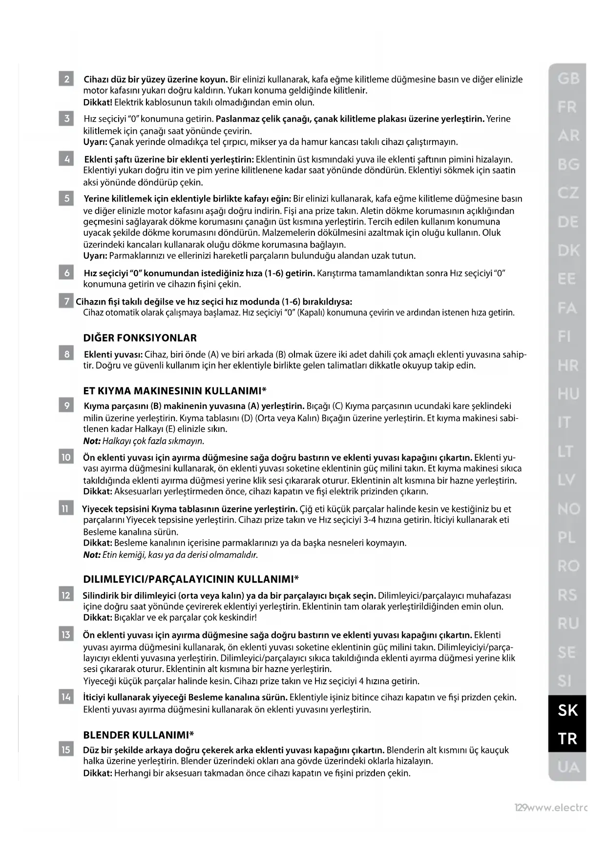 - Yalnızca bazı modeller Resim sayfa 2-3 BAŞLARKEN 1 Cihazınızı ilk defa kullanmadan önce: Gövdeye, çanaklara veya eklentilere yapıştırılabilecek plastikler, levhalar, stikerler veya etiketler gibi tüm ambalaj malzemelerini çıkarın. Cihazı ve aksesuarları temizleyin, talimatlara bakın: “Bakım ve Temizlik”.129www.electrolux.com