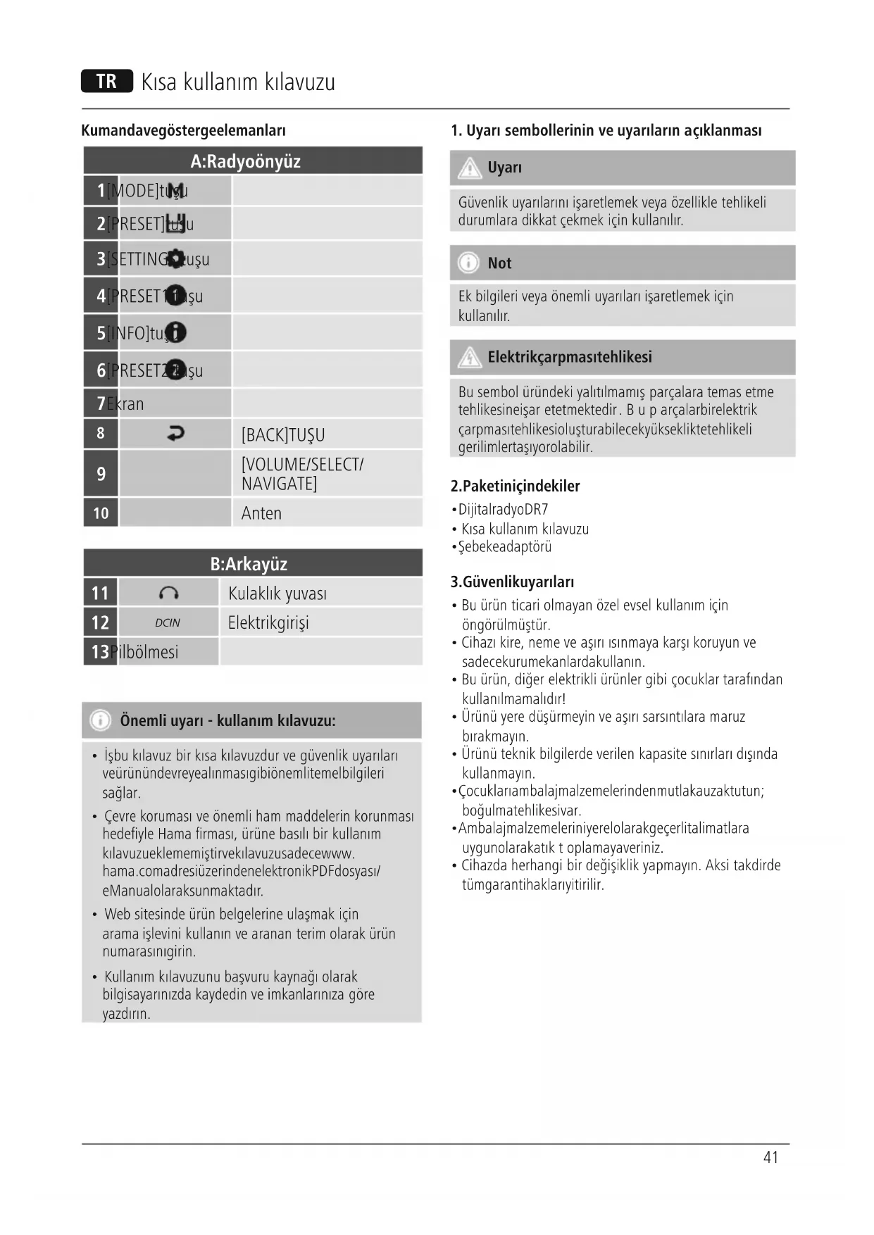 Cihazınız için talimatları indirin Radyo PDF formatında ücretsiz! Kılavuzunuzu bulun DR7 - HAMA ve elektronik cihazınızı yeniden ele alın. Bu sayfada cihazınızın kullanımı için gerekli tüm belgeler yayınlanmaktadır. DR7 markasının HAMA.