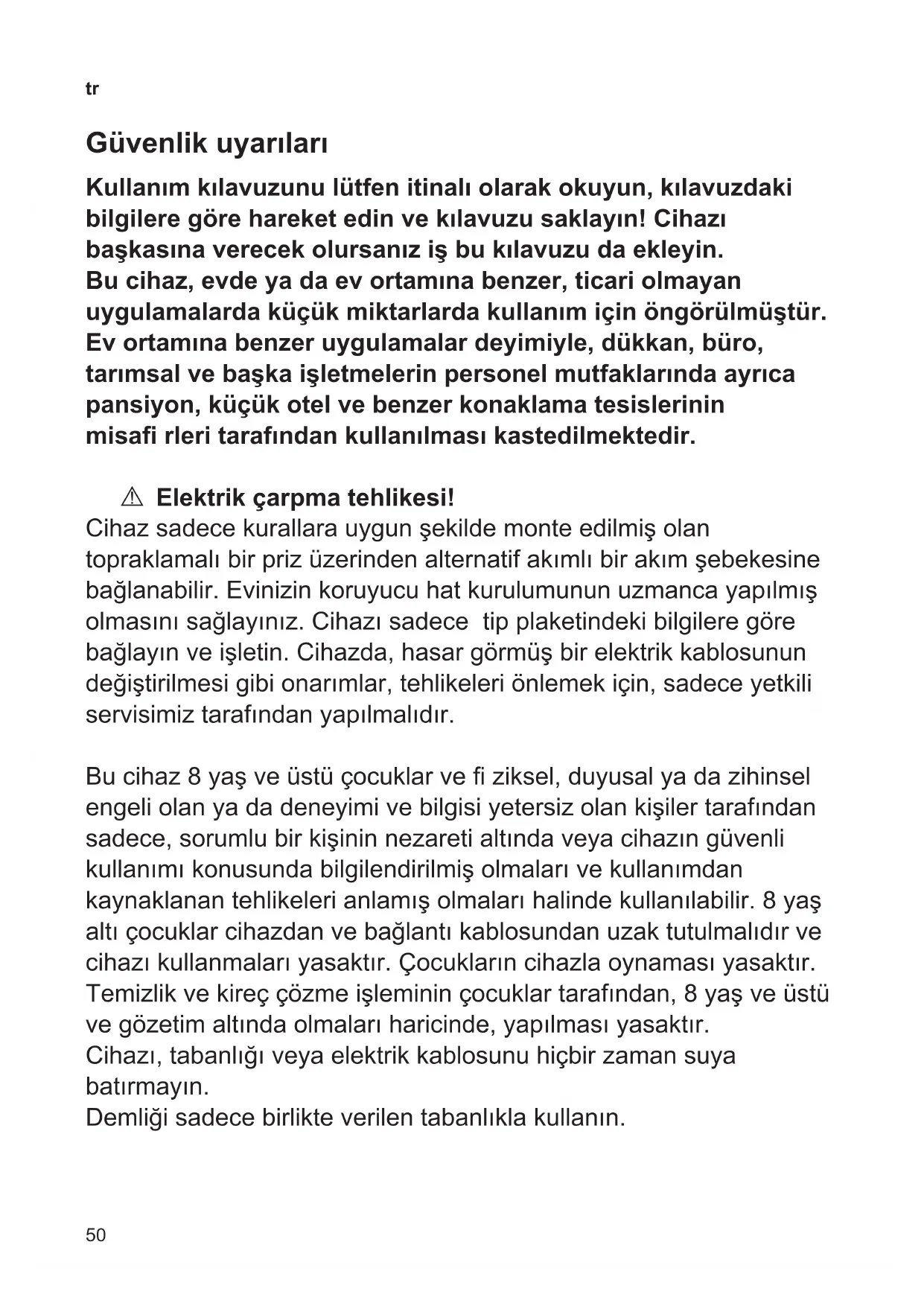 Güvenlik uyarıları Kullanım kılavuzunu lütfen itinalı olarak okuyun, kılavuzdaki bilgilere göre hareket edin ve kılavuzu saklayın! Cihazı başkasına verecek olursanız iş bu kılavuzu da ekleyin. Bu cihaz, evde ya da ev ortamına benzer, ticari olmayan uygulamalarda küçük miktarlarda kullanım için öngörülmüştür. Ev ortamına benzer uygulamalar deyimiyle, dükkan, büro, tarımsal ve başka işletmelerin personel mutfaklarında ayrıca pansiyon, küçük otel ve benzer konaklama tesislerinin misa rleri tarafından kullanılması kastedilmektedir. A Elektrik çarpma tehlikesi! Cihaz sadece kurallara uygun şekilde monte edilmiş olan topraklamalı bir priz üzerinden alternatif akımlı bir akım şebekesine bağlanabilir. Evinizin koruyucu hat kurulumunun uzmanca yapılmış olmasını sağlayınız. Cihazı sadece tip plaketindeki bilgilere göre bağlayın ve işletin. Cihazda, hasar görmüş bir elektrik kablosunun değiştirilmesi gibi onarımlar, tehlikeleri önlemek için, sadece yetkili servisimiz tarafından yapılmalıdır. Bu cihaz 8 yaş ve üstü çocuklar ve ziksel, duyusal ya da zihinsel engeli olan ya da deneyimi ve bilgisi yetersiz olan kişiler tarafından sadece, sorumlu bir kişinin nezareti altında veya cihazın güvenli kullanımı konusunda bilgilendirilmiş olmaları ve kullanımdan kaynaklanan tehlikeleri anlamış olmaları halinde kullanılabilir. 8 yaş altı çocuklar cihazdan ve bağlantı kablosundan uzak tutulmalıdır ve cihazı kullanmaları yasaktır. Çocukların cihazla oynaması yasaktır. Temizlik ve kireç çözme işleminin çocuklar tarafından, 8 yaş ve üstü ve gözetim altında olmaları haricinde, yapılması yasaktır. Cihazı, tabanlığı veya elektrik kablosunu hiçbir zaman suya batırmayın. Demliği sadece birlikte verilen tabanlıkla kullanın.51