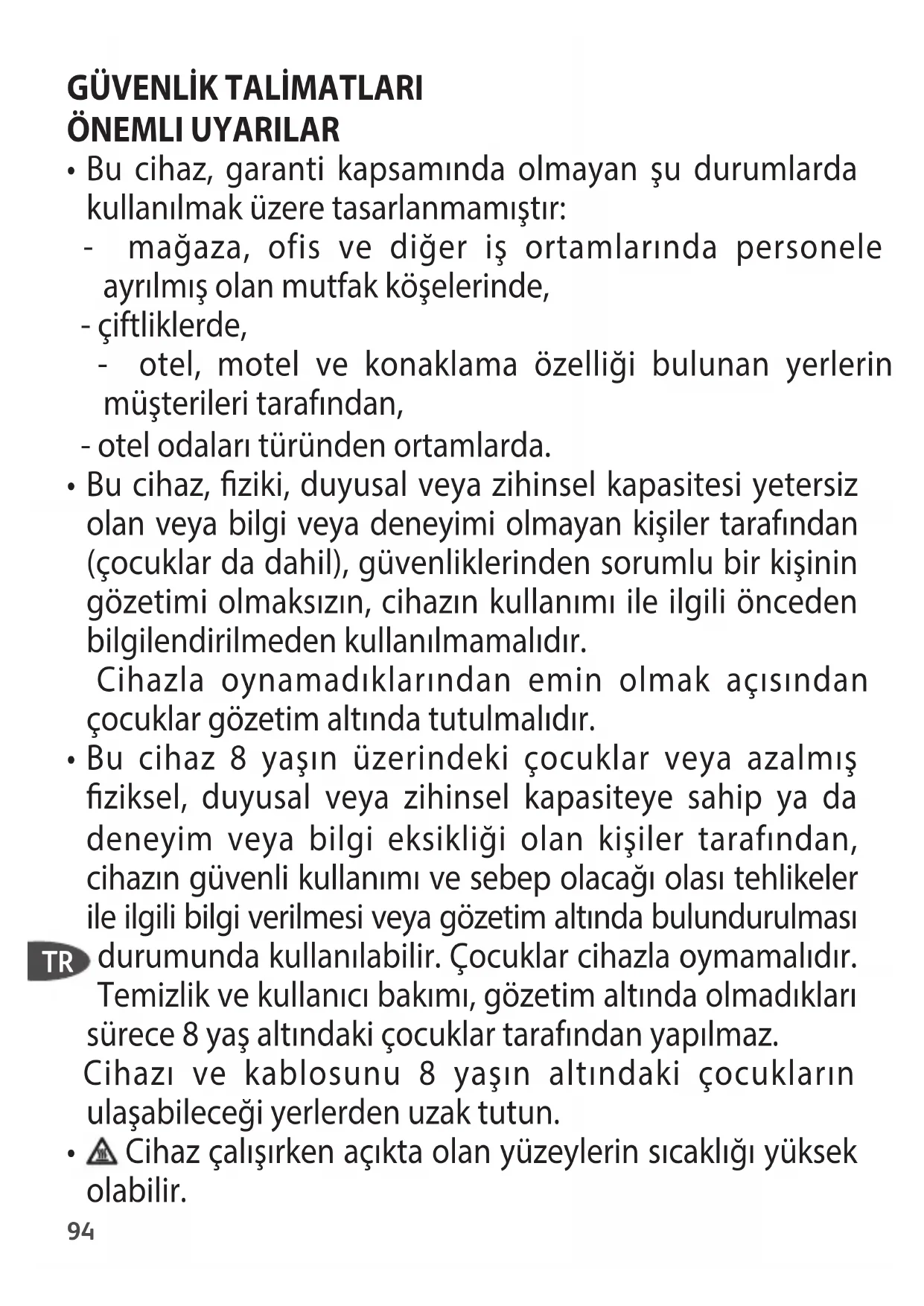 Bu cihaz, ziki, duyusal veya zihinsel kapasitesi yetersiz olan veya bilgi veya deneyimi olmayan kişiler tarafından (çocuklar da dahil), güvenliklerinden sorumlu bir kişinin gözetimi olmaksızın, cihazın kullanımı ile ilgili önceden bilgilendirilmeden kullanılmamalıdır. Cihazla oynamadıklarından emin olmak açısından çocuklar gözetim altında tutulmalıdır.