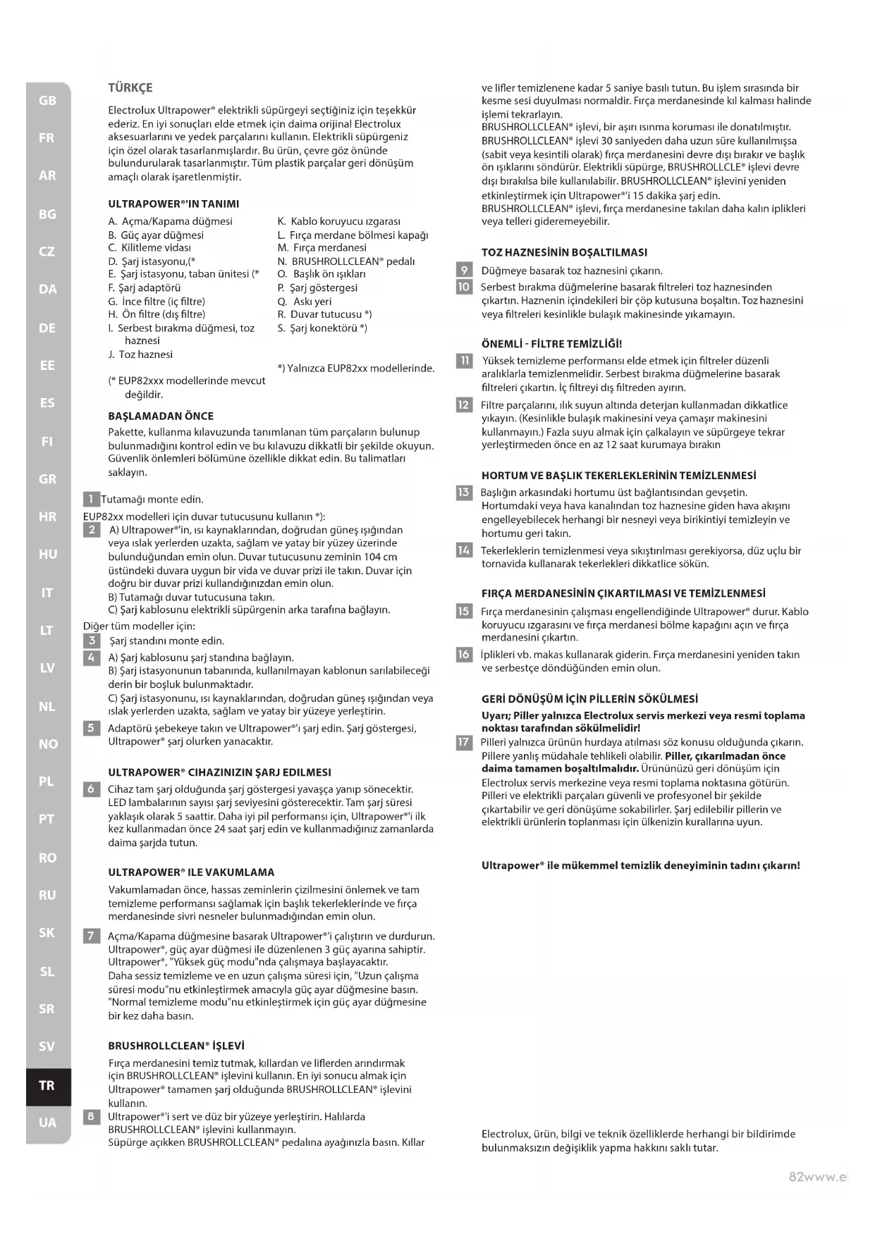 9 Düğmeye basarak toz haznesini çıkarın. 10 Serbest bırakma düğmelerine basarak ltreleri toz haznesinden çıkartın. Haznenin içindekileri bir çöp kutusuna boşaltın. Toz haznesini veya ltreleri kesinlikle bulaşık makinesinde yıkamayın. ÖNEMLİ - FİLTRE TEMİZLİĞİ! 11 Yüksek temizleme performansı elde etmek için ltreler düzenli aralıklarla temizlenmelidir. Serbest bırakma düğmelerine basarak ltreleri çıkartın. İç ltreyi dış ltreden ayırın. 12 Filtre parçalarını, ılık suyun altında deterjan kullanmadan dikkatlice yıkayın. (Kesinlikle bulaşık makinesini veya çamaşır makinesini kullanmayın.) Fazla suyu almak için çalkalayın ve süpürgeye tekrar yerleştirmeden önce en az 12 saat kurumaya bırakın HORTUM VE BAŞLIK TEKERLEKLERİNİN TEMİZLENMESİ 13 Başlığın arkasındaki hortumu üst bağlantısından gevşetin. Hortumdaki veya hava kanalından toz haznesine giden hava akışını engelleyebilecek herhangi bir nesneyi veya birikintiyi temizleyin ve hortumu geri takın. 14 Tekerleklerin temizlenmesi veya sıkıştırılması gerekiyorsa, düz uçlu bir tornavida kullanarak tekerlekleri dikkatlice sökün. FIRÇA MERDANESİNİN ÇIKARTILMASI VE TEMİZLENMESİ 15 Fırça merdanesinin çalışması engellendiğinde Ultrapower® durur. Kablo koruyucu ızgarasını ve fırça merdanesi bölme kapağını açın ve fırça merdanesini çıkartın. 16 İplikleri vb. makas kullanarak giderin. Fırça merdanesini yeniden takın ve serbestçe döndüğünden emin olun. GERİ DÖNÜŞÜM İÇİ N PİLLERİN SÖKÜLMESİ Uyarı; Piller yalnızca Electrolux servis merkezi veya resmi toplama noktası tarafından sökülmelidir! 17 Pilleri yalnızca ürünün hurdaya atılması söz konusu olduğunda çıkarın. Pillere yanlış müdahale tehlikeli olabilir. Piller, çıkarılmadan önce daima tamamen boşaltılmalıdır. Ürününüzü geri dönüşüm için Electrolux servis merkezine veya resmi toplama noktasına götürün. Pilleri ve elektrikli parçaları güvenli ve profesyonel bir şekilde çıkartabilir ve geri dönüşüme sokabilirler. Şarj edilebilir pillerin ve elektrikli ürünlerin toplanması için ülkenizin kurallarına uyun. Ultrapower® ile mükemmel temizlik deneyiminin tadını çıkarın!83www.electrolux.com