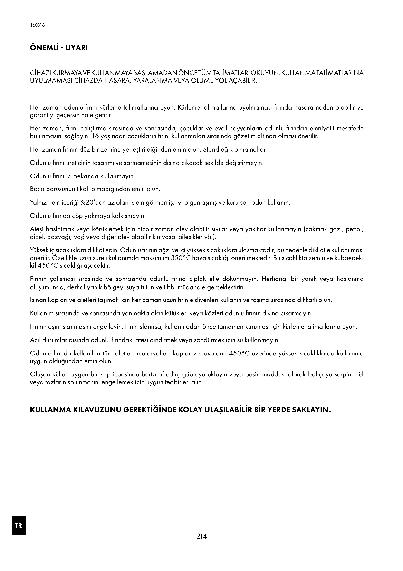 CİHAZI KURMAYA VE KULLANMAYA BAŞLAMADAN ÖNCE TÜM TALİMATLARI OKUYUN KULLANMA TALİMATLARINA UYULMAMASI CİHAZDA HASARA, YARALANMA VEYA ÖLÜME YOL AÇABİLİR Her zaman odunlu fırını kürleme talimatlarına uyun Kürleme talimatlarına uyulmaması fırında hasara neden olabilir ve garantiyi geçersiz hale getirir Her zaman, fırını çalıştırma sırasında ve sonrasında, çocuklar ve evcil hayvanların odunlu fırından emniyetli mesafede bulunmasını sağlayın 16 yaşından çocukların fırını kullanmaları sırasında gözetim altında olması önerilir Her zaman fırının düz bir zemine yerleştirildiğinden emin olun Stand eğik olmamalıdır Odunlu fırını üreticinin tasarımı ve şartnamesinin dışına çıkacak şekilde değiştirmeyin Odunlu fırını iç mekanda kullanmayın Baca borusunun tıkalı olmadığından emin olun Yalnız nem içeriği %20’den az olan işlem görmemiş, iyi olgunlaşmış ve kuru sert odun kullanın Odunlu fırında çöp yakmaya kalkışmayın Ateşi başlatmak veya körüklemek için hiçbir zaman alev alabilir sıvılar veya yakıtlar kullanmayın (çakmak gazı, petrol, dizel, gazyağı, yağ veya diğer alev alabilir kimyasal bileşikler vb) Yüksek iç sıcaklıklara dikkat edin Odunlu fırının ağzı ve içi yüksek sıcaklıklara ulaşmaktadır, bu nedenle dikkatle kullanılması önerilir Özellikle uzun süreli kullanımda maksimum 350°C hava sıcaklığı önerilmektedir Bu sıcaklıkta zemin ve kubbedeki kil 450°C sıcaklığı aşacaktır Fırının çalışması sırasında ve sonrasında odunlu fırına çıplak elle dokunmayın Herhangi bir yanık veya haşlanma oluşumunda, derhal yanık bölgeyi suya tutun ve tıbbi müdahale gerçekleştirin Isınan kapları ve aletleri taşımak için her zaman uzun fırın eldivenleri kullanın ve taşıma sırasında dikkatli olun Kullanım sırasında ve sonrasında yanmakta olan kütükleri veya közleri odunlu fırının dışına çıkarmayın Fırının aşırı ıslanmasını engelleyin Fırın ıslanırsa, kullanmadan önce tamamen kuruması için kürleme talimatlarına uyun Acil durumlar dışında odunlu fırındaki ateşi dindirmek veya söndürmek için su kullanmayın Odunlu fırında kullanılan tüm aletler, materyaller, kaplar ve tavaların 450°C üzerinde yüksek sıcaklıklarda kullanıma uygun olduğundan emin olun Oluşan külleri uygun bir kap içerisinde bertaraf edin, gübreye ekleyin veya besin maddesi olarak bahçeye serpin Kül veya tozların solunmasını engellemek için uygun tedbirleri alın KULLANMA KILAVUZUNU GEREKTİĞİNDE KOLAY ULAŞILABİLİR BİR YERDE SAKLAYIN. 160816TR İÇİNDEKİLER 1 Kutu içeriği 2 Odunlu fırın kurulumu 3 Odunlu fırın kürleme işlemi 4 Odunlu fırın bakımı 5 Ateş yakma 6 Pişirme 7 Faydalı ipuçları