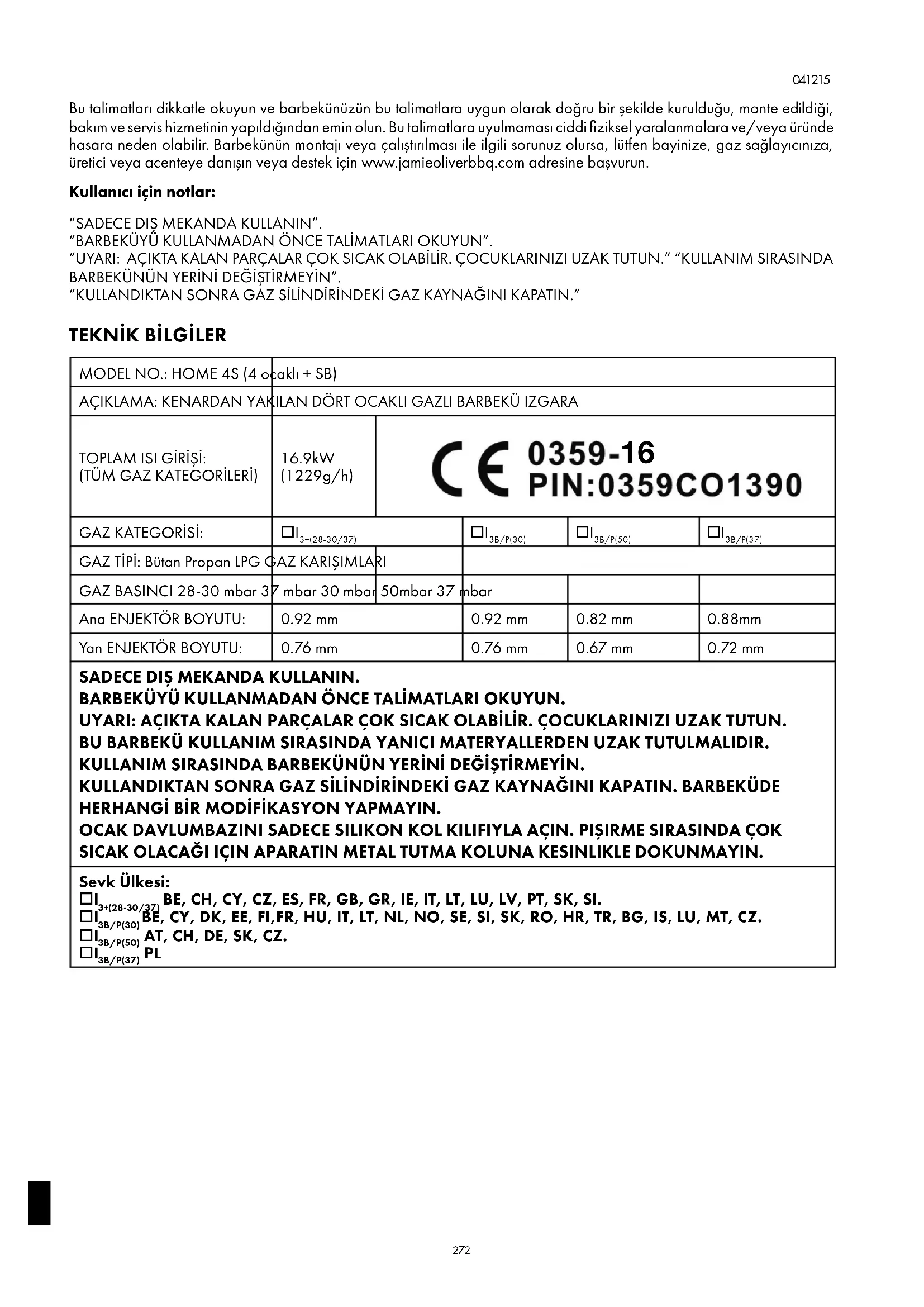 Bu talimatları dikkatle okuyun ve barbekünüzün bu talimatlara uygun olarak doğru bir şekilde kurulduğu, monte edildiği, bakım ve servis hizmetinin yapıldığından emin olun. Bu talimatlara uyulmaması ciddi fiziksel yaralanmalara ve/veya üründe hasara neden olabilir. Barbekünün montajı veya çalıştırılması ile ilgili sorunuz olursa, lütfen bayinize, gaz sağlayıcınıza, üretici veya acenteye danışın veya destek için www.jamieoliverbbq.com adresine başvurun. Kullanıcı için notlar: “SADECE DIŞ MEKANDA KULLANIN”. “BARBEKÜYÜ KULLANMADAN ÖNCE TALİMATLARI OKUYUN”. “UYARI: AÇIKTA KALAN PARÇALAR ÇOK SICAK OLABİLİR. ÇOCUKLARINIZI UZAK TUTUN.” “KULLANIM SIRASINDA BARBEKÜNÜN YERİNİ DEĞİŞTİRMEYİN”. “KULLANDIKTAN SONRA GAZ SİLİNDİRİNDEKİ GAZ KAYNAĞINI KAPATIN.”