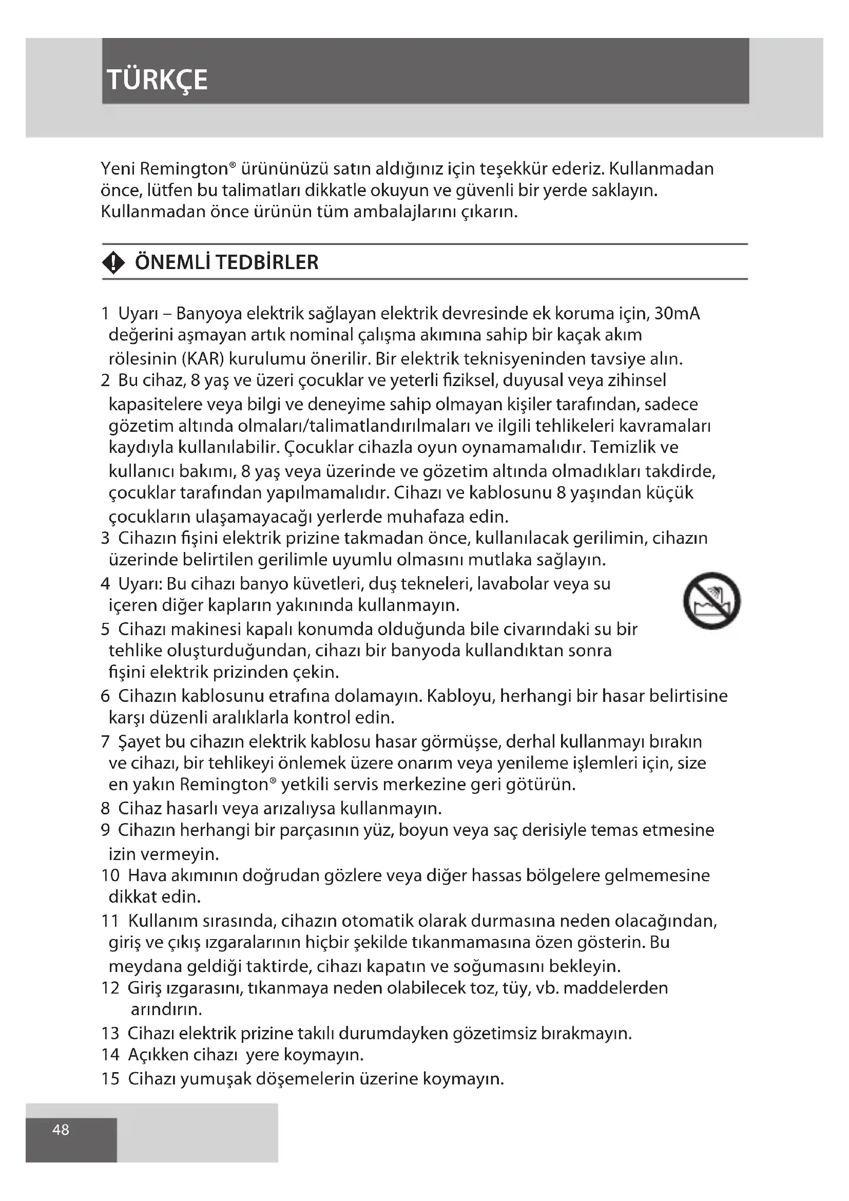 Yeni Remington® urününüz satın aldışınz icin teşekür ederiz. Kullanmadan önce, lüften bu talimatlari dokuyun ve güvenli bir yerde saklayın. Kullanmadan önce urünün:tüm ambalajlarıçınin.