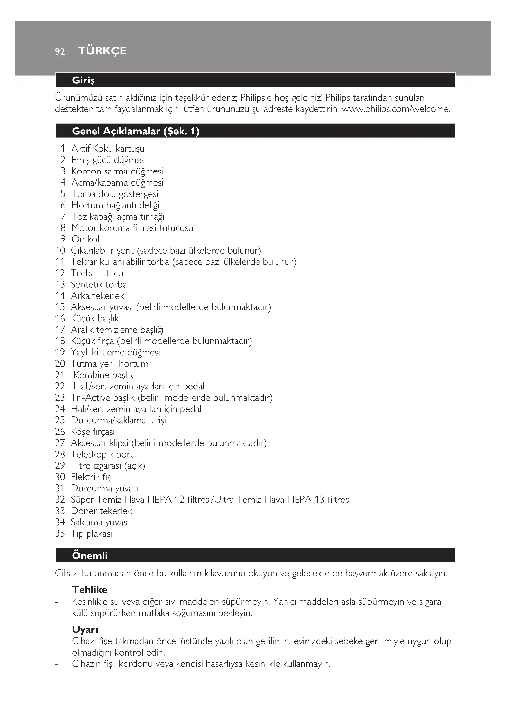 SVENSKA 9192 Giriş Ürünümüzü satın aldığınız için teşekkür ederiz; Philips’e hoş geldiniz! Philips tarafından sunulan destekten tam faydalanmak için lütfen ürününüzü şu adreste kaydettirin: www.philips.com/welcome. Genel Açıklamalar (Şek. 1) 1 Aktif Koku kartuşu 2 Emiş gücü düğmesi 3 Kordon sarma düğmesi 4 Açma/kapama düğmesi 5 Torba dolu göstergesi 6 Hortum bağlantı deliği 7 Toz kapağı açma tırnağı 8 Motor koruma ltresi tutucusu 9 Ön kol 10 Çıkarılabilir şerit (sadece bazı ülkelerde bulunur) 11 Tekrar kullanılabilir torba (sadece bazı ülkelerde bulunur) 12 Torba tutucu 13 Sentetik torba 14 Arka tekerlek 15 Aksesuar yuvası (belirli modellerde bulunmaktadır) 16 Küçük başlık 17 Aralık temizleme başlığı 18 Küçük fırça (belirli modellerde bulunmaktadır) 19 Yaylı kilitleme düğmesi 20 Tutma yerli hortum 21 Kombine başlık 22 Halı/sert zemin ayarları için pedal 23 Tri-Active başlık (belirli modellerde bulunmaktadır) 24 Halı/sert zemin ayarları için pedal 25 Durdurma/saklama kirişi 26 Köşe fırçası 27 Aksesuar klipsi (belirli modellerde bulunmaktadır) 28 Teleskopik boru 29 Filtre ızgarası (açık) 30 Elektrik şi 31 Durdurma yuvası 32 Süper Temiz Hava HEPA 12 ltresi/Ultra Temiz Hava HEPA 13 ltresi 33 Döner tekerlek 34 Saklama yuvası 35 Tip plakası Önemli Cihazı kullanmadan önce bu kullanım kılavuzunu okuyun ve gelecekte de başvurmak üzere saklayın. Tehlike Kesinlikle su veya diğer sıvı maddeleri süpürmeyin. Yanıcı maddeleri asla süpürmeyin ve sigara külü süpürürken mutlaka soğumasını bekleyin. Uyarı Cihazı şe takmadan önce, üstünde yazılı olan gerilimin, evinizdeki şebeke gerilimiyle uygun olup olmadığını kontrol edin. Cihazın şi, kordonu veya kendisi hasarlıysa kesinlikle kullanmayın.