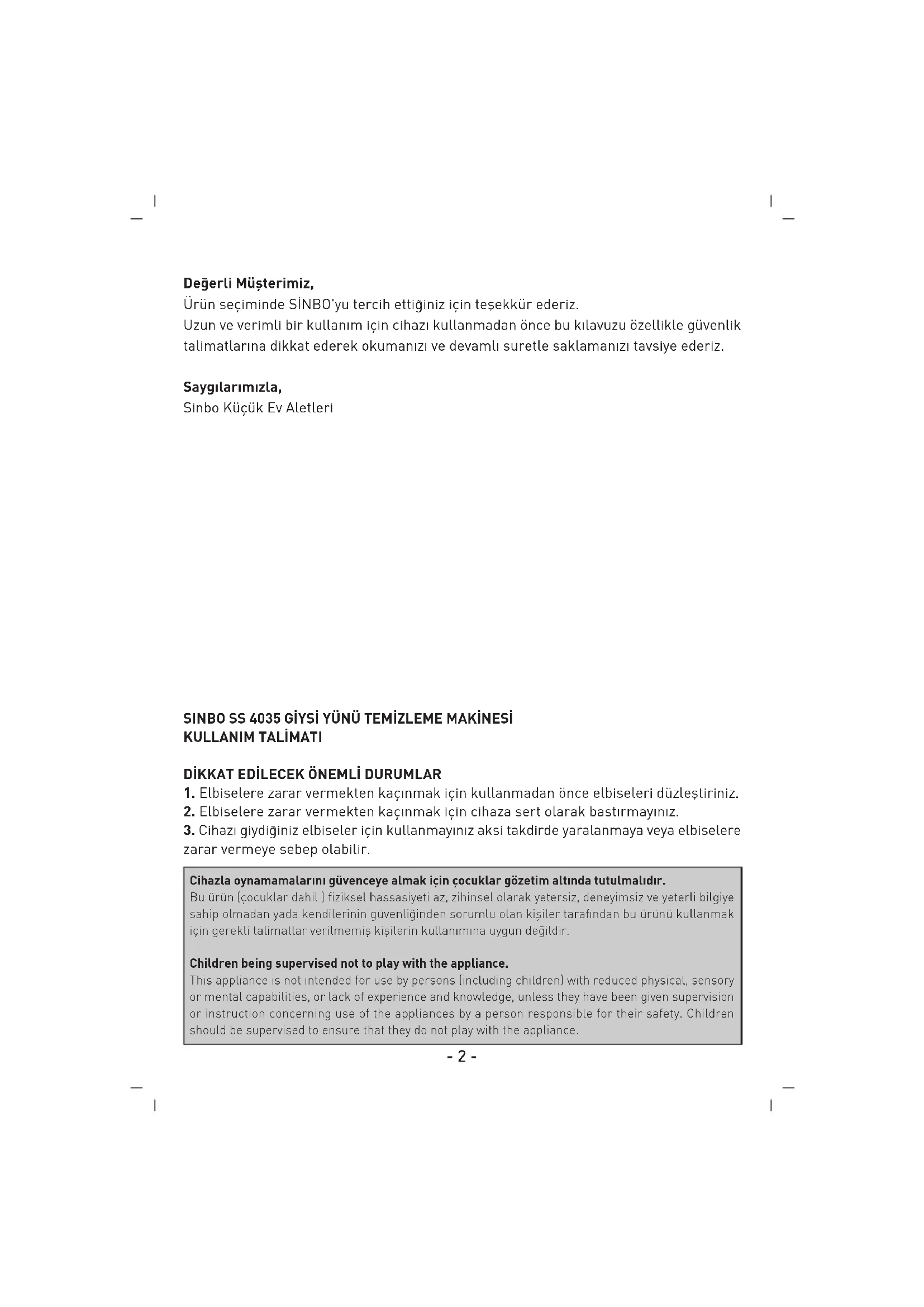 De¤erli Müflterimiz, Ürün seçiminde S‹NBO'yu tercih etti¤iniz için teflekkür ederiz. Uzun ve verimli bir kullan›m için cihaz› kullanmadan önce bu k›lavuzu özellikle güvenlik talimatlar›na dikkat ederek okuman›z› ve devaml› suretle saklaman›z› tavsiye ederiz. Sayg›lar›m›zla, Sinbo Küçük Ev Aletleri Cihazla oynamamalarını güvenceye almak için çocuklar gözetim altında tutulmalıdır. Bu ürün (çocuklar dahil ) fiziksel hassasiyeti az, zihinsel olarak yetersiz, deneyimsiz ve yeterli bilgiye sahip olmadan yada kendilerinin güvenli¤inden sorumlu olan kifliler tarafından bu ürünü kullanmak için gerekli talimatlar verilmemifl kiflilerin kullanımına uygun de¤ildir. Children being supervised not to play with the appliance. This appliance is not intended for use by persons (including children) with reduced physical, sensory or mental capabilities, or lack of experience and knowledge, unless they have been given supervision or instruction concerning use of the appliances by a person responsible for their safety. Children should be supervised to ensure that they do not play with the appliance. SINBO SS 4035 G‹YS‹ YÜNÜ TEM‹ZLEME MAK‹NES‹