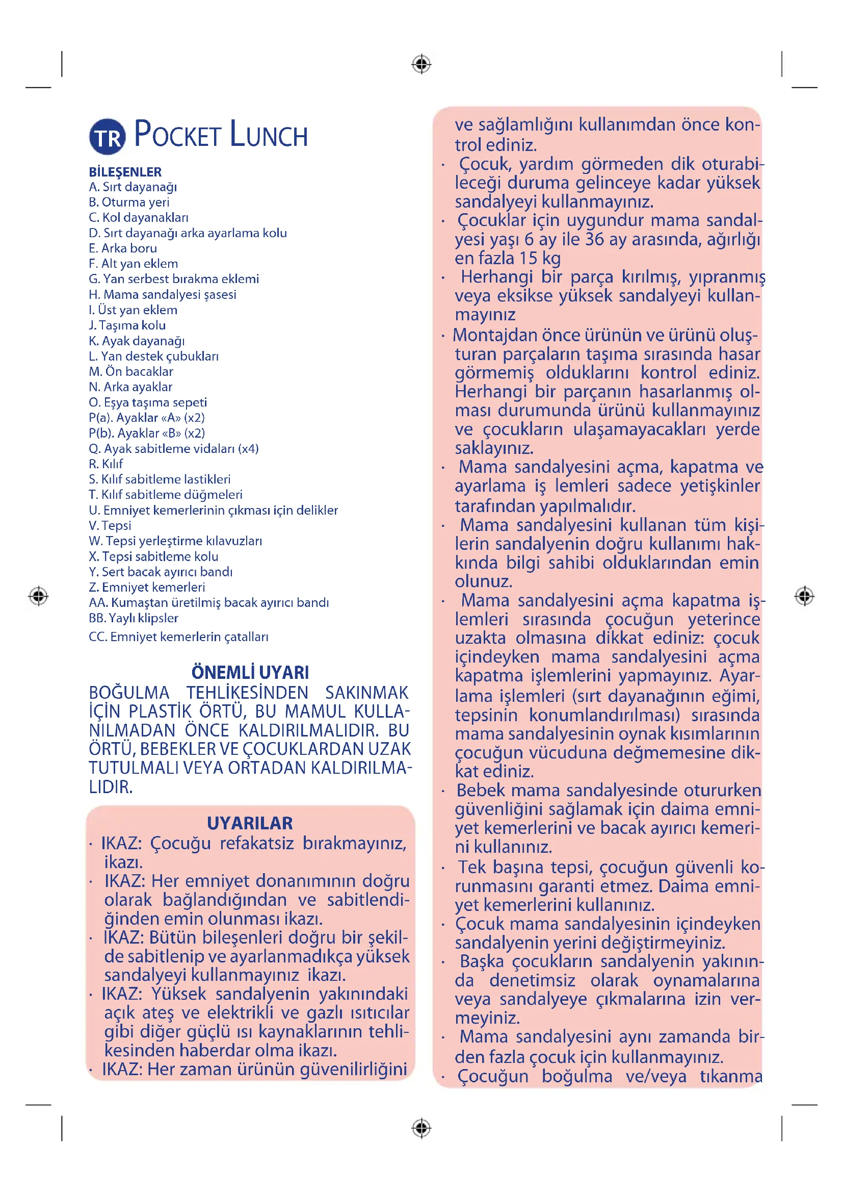 yan eklemi elinize alıp yukarıya doğru kaldırınız ve mama sandalyesini resimde gösterildiği gibi hafifçe öne doğru itiniz. (Resim 15) Kapatma mekanizması serbest bırakıl- dıktan sonra arkada bulunan boruyu elinize alarak mama sandalyesi tamamen kapanana kadar resimde gösterildi- ği gibi çeviriniz. (Resim 16) Mama sandalyesi kapatıldıktan sonra kendiliğinden ayakta durur. Kapatma işlemleri tepsi ve sepeti çıkarmadan gerçekleş- tirilebilir. Mama sandalyesinin kapattığı alanı azaltmak için saat yönünün tersine çevirerek ayak dayanağını ser- best bırakmak mümkündür. DİKKAT: Mama sandalyesini tekrar açtığınız zaman “Mama sandalyesinin montajı / açılması“bölümünde be- lirtilen talimatlara uyarak ayak dayanağını tekrar ilgili konuma getirmeyi unutmayınız. DİKKAT: Mama sandalyesini tekrar açtığınız zaman şase çevirme işlemi sırasında sepetin ayak dayanağını engel- lemediğini kontrol ediniz.Pocket Lunch