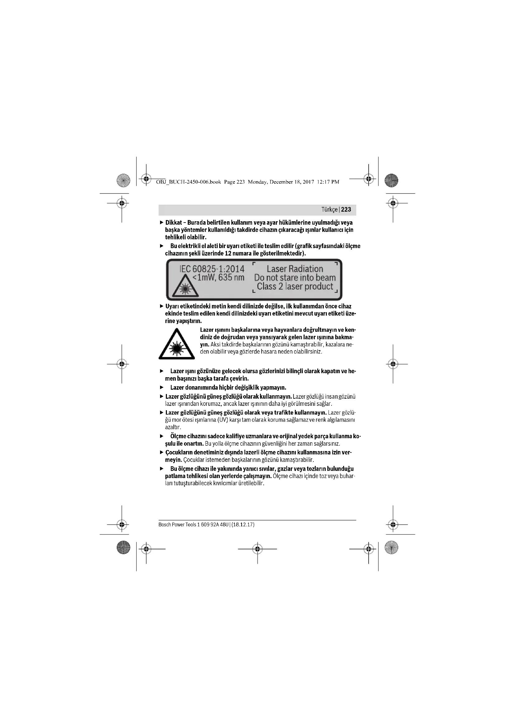 Μόνο για χώρες της ΕΕ: Σύμφωνα με την Κοινοτική Οδηγία 2012/19/EE τα άχρηστα εργαλεία μέτρησης, και σύμφωνα με την Κοινοτική Οδηγία 2006/66/EΚ οι χαλασμένες ή αναλωμένες μπαταρί- ες δεν είναι πλέον υποχρεωτικό να συλλέγονται ξεχωριστά για να ανακυκλωθούν με τρό- πο φιλικό προς το περιβάλλον. Τηρούμε το δικαίωμα αλλαγών. Türkçe Güvenlik Talimatı Ölçme cihazı ile tehlikesiz ve güvenli biçimde çalışabilmek için bütün güvenlik talimatını ve uyarıları okuyun. Ölçme cihazı bu ta- limata göre kullanılmadığı takdirde alete entegre koruma önlem- lerinin işlevi kısıtlanabilir. Ölçme cihazı üzerindeki uyarı etiketle- rini hiçbir zaman görünmez duruma getirmeyin. BU TALİMATLARI İYİ VE GÜVENLİ BİR YERDE SAKLAYIN VE ÖLÇME CİHAZINI BAŞKASINA VERDİ- ĞİNİZDE BUNLARI DA BİRLİKTE VERİN. OBJ_BUCH-2450-006.book Page 222 Monday, December 18, 2017 12:17 PMTürkçe | 223 Bosch Power Tools 1 609 92A 48U | (18.12.17) Dikkat – Burada belirtilen kullanım veya ayar hükümlerine uyulmadığı veya başka yöntemler kullanıldığı takdirde cihazın çıkaracağı ışınlar kullanıcı için tehlikeli olabilir. Bu elektrikli el aleti bir uyarı etiketi ile teslim edilir (grafik sayfasındaki ölçme cihazının şekli üzerinde 12 numara ile gösterilmektedir). Uyarı etiketindeki metin kendi dilinizde değilse, ilk kullanımdan önce cihaz ekinde teslim edilen kendi dilinizdeki uyarı etiketini mevcut uyarı etiketi üze- rine yapıştırın. Lazer ışınını başkalarına veya hayvanlara doğrultmayın ve ken- diniz de doğrudan veya yansıyarak gelen lazer ışınına bakma- yın. Aksi takdirde başkalarının gözünü kamaştırabilir, kazalara ne- den olabilir veya gözlerde hasara neden olabilirsiniz. Lazer ışını gözünüze gelecek olursa gözlerinizi bilinçli olarak kapatın ve he- men başınızı başka tarafa çevirin. Lazer donanımında hiçbir değişiklik yapmayın. Lazer gözlüğünü güneş gözlüğü olarak kullanmayın. Lazer gözlüğü insan gözünü lazer ışınından korumaz, ancak lazer ışınının daha iyi görülmesini sağlar. Lazer gözlüğünü güneş gözlüğü olarak veya trafikte kullanmayın. Lazer gözlü- ğü mor ötesi ışınlarına (UV) karşı tam olarak koruma sağlamaz ve renk algılamasını azaltır. Ölçme cihazını sadece kalifiye uzmanlara ve orijinal yedek parça kullanma ko- şulu ile onartın. Bu yolla ölçme cihazının güvenliğini her zaman sağlarsınız. Çocukların denetiminiz dışında lazerli ölçme cihazını kullanmasına izin ver- meyin. Çocuklar istemeden başkalarının gözünü kamaştırabilir. Bu ölçme cihazı ile yakınında yanıcı sıvılar, gazlar veya tozların bulunduğu patlama tehlikesi olan yerlerde çalışmayın. Ölçme cihazı içinde toz veya buhar- ları tutuşturabilecek kıvılcımlar üretilebilir. OBJ_BUCH-2450-006.book Page 223 Monday, December 18, 2017 12:17 PM224 | Türkçe 1 609 92A 48U | (18.12.17) Bosch Power Tools Dikkat! Ölçme cihazı Bluetooth® ile kullanılırken başka cihaz ve tesislerde, uçaklarda ve tıbbi cihazlarda (örneğin kalp pillerinde, işitme cihazlarında) pa- razite neden olunabilir. Yine aynı şekilde cihaz yakınında bulunan kişeler ve hayvanlarda hasar meydana gelmesi tam olarak önlenemez. Ölçme cihazını Bluetooth® ile tıbbi cihazların, akaryakıt istasyonlarının, kimyasal madde te- sislerinin, patlama tehlikesi bulunan alanların ve patlama işlemlerinin yapıldı- ğı alanların yakınında kullanmayın. Ölçme cihazını Bluetooth® ile uçaklarda kullanmayın. Bedeninize çok yakın uzun süreli işletmeden kaçının. Bluetooth® markası ve simgeler (logolar) Bluetooth SIG, Inc. firmasının tescilli markası ve malıdır. Bu markanın/logoların Robert Bosch Power Tools GmbH ta- rafından her türlü kullanımı lisansa bağlıdır. Ürün ve işlev tanımı Lütfen ölçme cihazının bulunduğu kapağı açın ve kullanım kılavuzunu okuduğunuz sü- rece bu kapağı açık tutun. Usulüne uygun kullanım Bu ölçme cihazı, uzaklıkların, uzunlukların, yüksekliklerin, mesafelerin, eğimlerin öl- çülmesi ve yüzey ve hacimlerin hesaplanması için tasarlanmıştır. Ölçme sonuçları Bluetooth® üzerinden diğer cihazlara aktarılabilir. Teknik veriler Dijital lazerli uzaklıkölçer GLM 50 C Ürün kodu 3601K72C.. Ölçme aralığı (tipik) 0,05–50 m