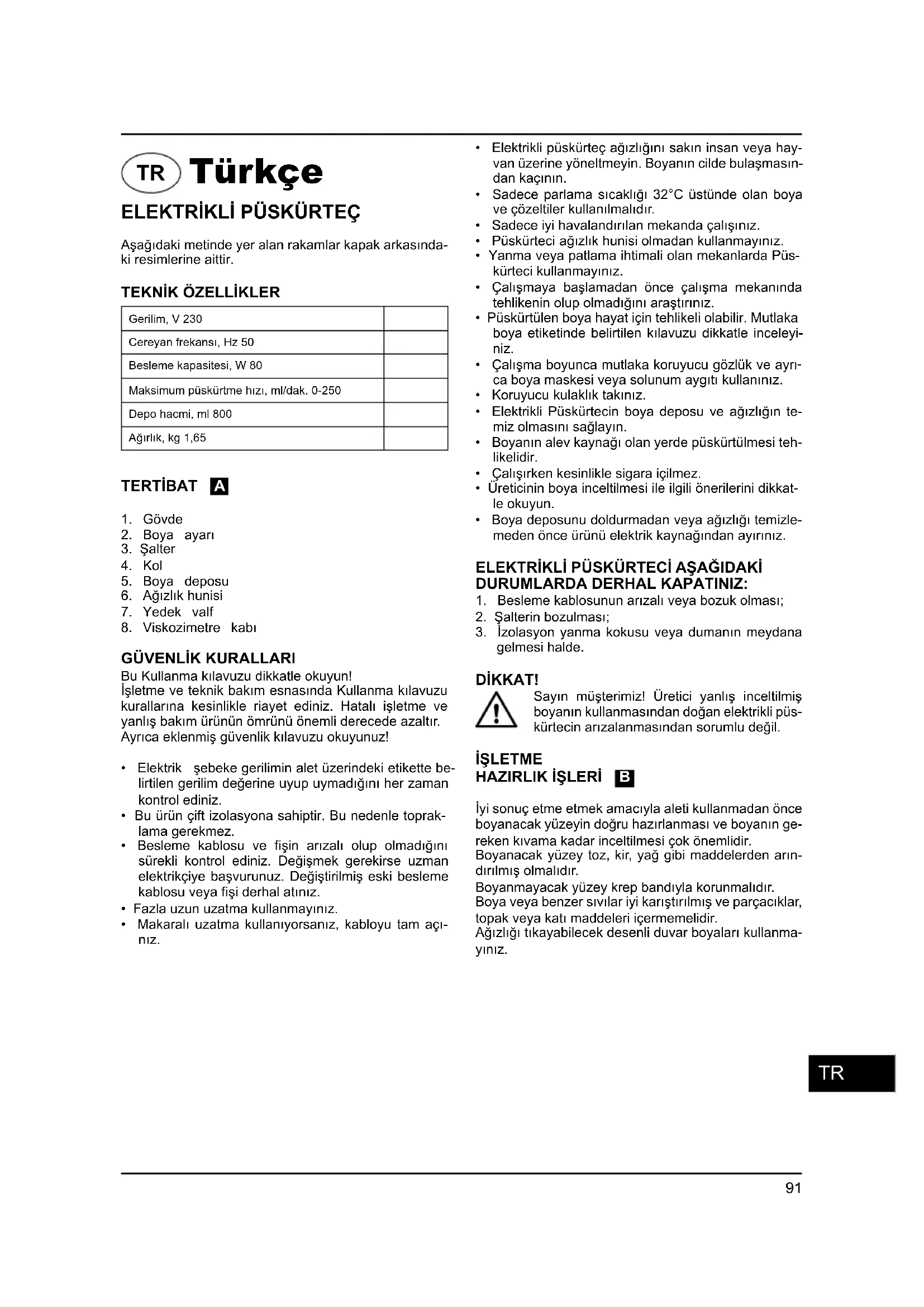 gelmesi halde. DİKKAT! Sayın müşterimiz! Üretici yanlış inceltilmiş boyanın kullanmasından doğan elektrikli püs- kürtecin arızalanmasından sorumlu değil. İŞLETME