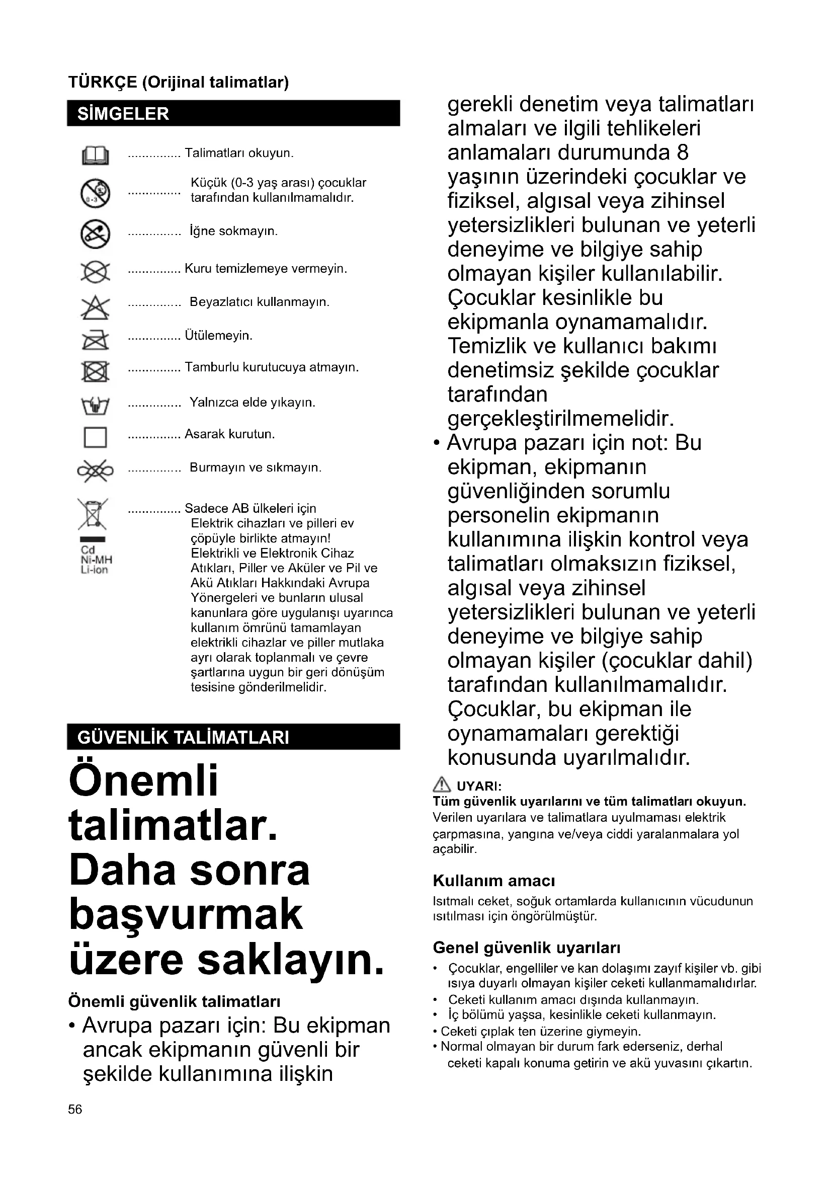 - Avrupa pazarı için not: Bu ekipman, ekipmanın güvenliğinden sorumlu personelin ekipmanın kullanımına ilişkin kontrol veya talimatları olmaksızın fiziksel, algısal veya zihinsel yetersizlikleri bulunan ve yeterli deneyime ve bilgiye sahip olmayan kişiler (çocuklar dahil) tarafından kullanılmamalıdır. Çocuklar, bu ekipman ile oynamamaları gerektiği konusunda uyarılmalıdır. UYARI: Tüm güvenlik uyarılarını ve tüm talimatları okuyun. Verilen uyarılara ve talimatlara uyulmaması elektrik çarpmasına, yangına ve/veya ciddi yaralanmalara yol açabilir. Kullanım amacı Isıtmalı ceket, soğuk ortamlarda kullanıcının vücudunun ısıtılması için öngörülmüştür. Genel güvenlik uyarıları