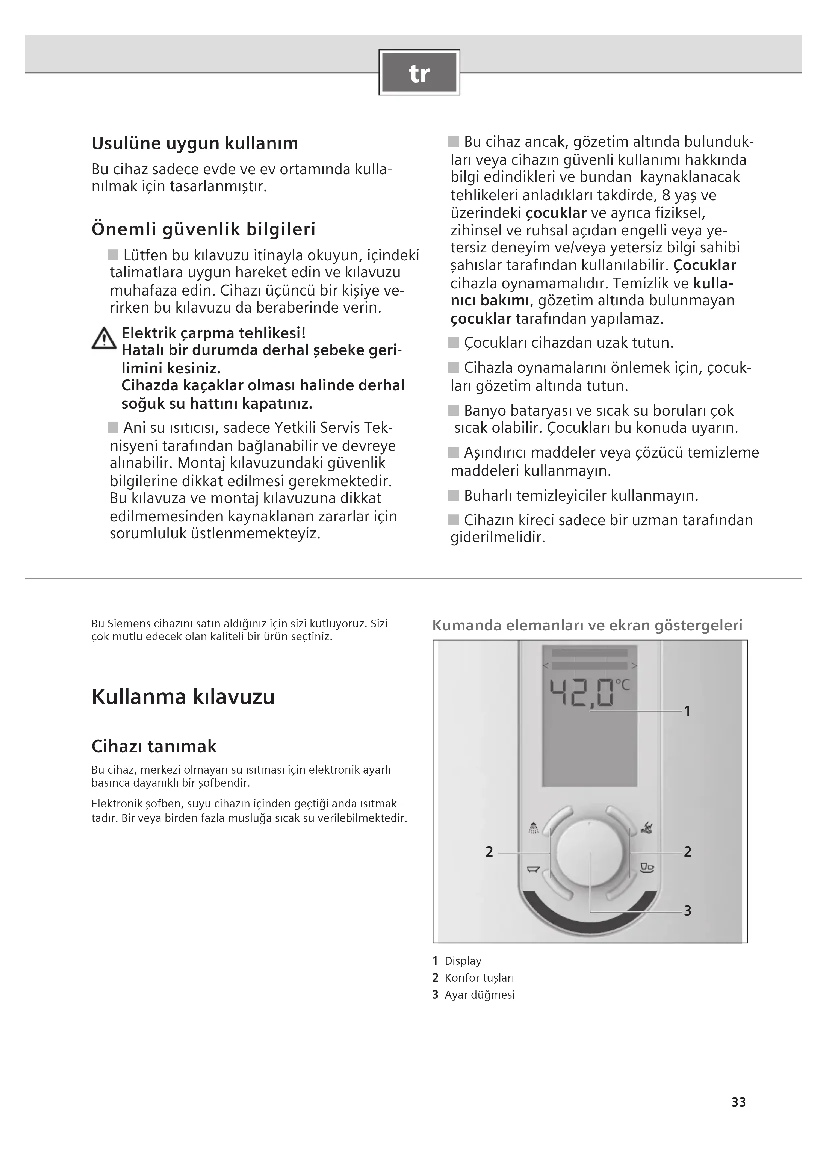Usulüne uygun kullanım Bu cihaz sadece evde ve ev ortamında kulla- nılmak için tasarlanmıştır. Önemli güvenlik bilgileri ■ Lütfen bu kılavuzu itinayla okuyun, içindeki talimatlara uygun hareket edin ve kılavuzu muhafaza edin. Cihazı üçüncü bir kişiye ve- rirken bu kılavuzu da beraberinde verin. Elektrik çarpma tehlikesi! Hatalı bir durumda derhal şebeke geri- limini kesiniz. Cihazda kaçaklar olması halinde derhal soğuk su hattını kapatınız. ■ Ani su ısıtıcısı, sadece Yetkili Servis Tek- nisyeni tarafından bağlanabilir ve devreye alınabilir. Montaj kılavuzundaki güvenlik bilgilerine dikkat edilmesi gerekmektedir. Bu kılavuza ve montaj kılavuzuna dikkat edilmemesinden kaynaklanan zararlar için sorumluluk üstlenmemekteyiz. ■ Bu cihaz ancak, gözetim altında bulunduk- ları veya cihazın güvenli kullanımı hakkında bilgi edindikleri ve bundan kaynaklanacak tehlikeleri anladıkları takdirde, 8 yaş ve üzerindeki çocuklar ve ayrıca fiziksel, zihinsel ve ruhsal açıdan engelli veya ye- tersiz deneyim ve/veya yetersiz bilgi sahibi şahıslar tarafından kullanılabilir. Çocuklar cihazla oynamamalıdır. Temizlik ve kulla- nıcı bakımı, gözetim altında bulunmayan çocuklar tarafından yapılamaz. ■ Çocukları cihazdan uzak tutun. ■ Cihazla oynamalarını önlemek için, çocuk- ları gözetim altında tutun. ■ Banyo bataryası ve sıcak su boruları çok sıcak olabilir. Çocukları bu konuda uyarın. ■ Aşındırıcı maddeler veya çözücü temizleme maddeleri kullanmayın. ■ Buharlı temizleyiciler kullanmayın. ■ Cihazın kireci sadece bir uzman tarafından giderilmelidir. Bu Siemens cihazını satın aldığınız için sizi kutluyoruz. Sizi çok mutlu edecek olan kaliteli bir ürün seçtiniz. Kullanma kılavuzu Cihazı tanımak Bu cihaz, merkezi olmayan su ısıtması için elektronik ayarlı basınca dayanıklı bir şofbendir.Elektronik şofben, suyu cihazın içinden geçtiği anda ısıtmak-tadır. Bir veya birden fazla musluğa sıcak su verilebilmektedir. Kumanda elemanları ve ekran göstergeleri