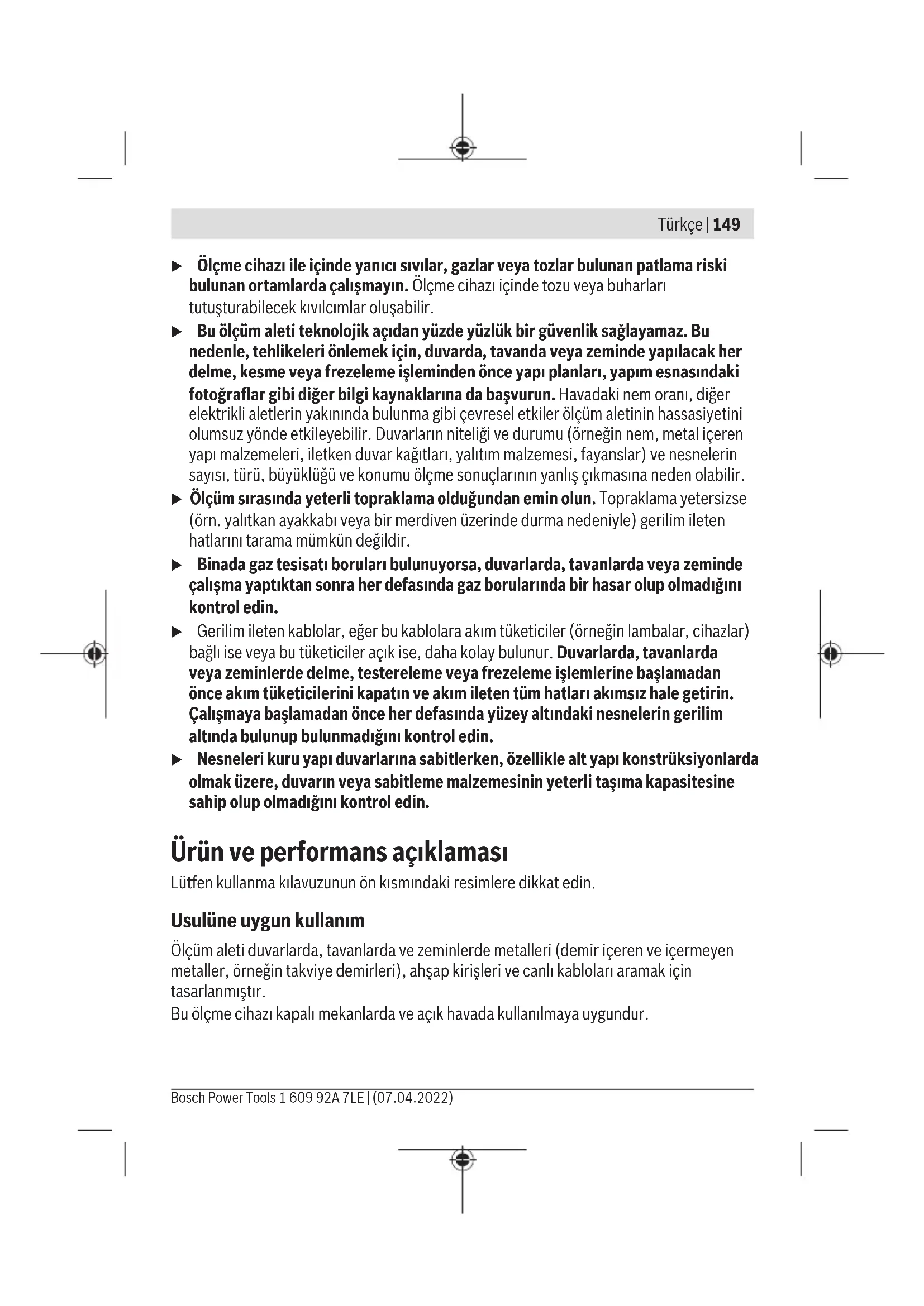 Τα όργανα μέτρησης, τα εξαρτήματα και οι συσκευασίες πρέπει να ανακυκλώνονται με τρόπο φιλικό προς το περιβάλλον. Μη ρίχνετε τα όργανα μέτρησης και τις μπαταρίες στα οικιακά απορρίμματα! Μόνο για χώρες τηςΕΕ: Σύμφωνα με την Ευρωπαϊκή οδηγία 2012/19/ΕΕ σχετικά με τις παλιές ηλεκτρικές και ηλε- κτρονικές συσκευές και τη μεταφορά της οδηγίας αυτής σε εθνικό δίκαιο τα άχρηστα όργα- να μέτρησης και σύμφωνα με την Ευρωπαϊκή οδηγία 2006/66/ΕΚ οι χαλασμένες ή χρησι- μοποιημένες μπαταρίες πρέπει να συλλέγονται ξεχωριστά, για να ανακυκλωθούν με τρόπο φιλικό προς το περιβάλλον. Σε περίπτωση μη ενδεδειγμένης απόσυρσης οι ηλεκτρικές και ηλεκτρονικές συσκευές λόγω ενδεχομένης παρουσίας επικίνδυνων ουσιών μπορούν να έχουν επιβλαβείς επιπτώσεις στο περιβάλλον και στην ανθρώπινη υγεία. Türkçe Güvenlik talimatı Bütün talimat ve uyarılar okunmalı ve bunlara uyulmalıdır. Ölçme cihazı bu güvenlik talimatına uygun olarak kullanılmazsa, ölçme cihazına entegre koruyucu donanımların işlevi kısıtlanabilir. BU TALİMATI İYİ VE GÜVENLİ BİR YERDE SAKLAYIN. u Ölçme cihazının sadece kalifiye uzman personel tarafından ve orijinal yedek parçalarla onarılmasını sağlayın. Bu sayede ölçme cihazının güvenliğini sağlarsınız. 1 609 92A 7LE | (07.04.2022) Bosch Power ToolsTürkçe | 149 u Ölçme cihazı ile içinde yanıcı sıvılar, gazlar veya tozlar bulunan patlama riski bulunan ortamlarda çalışmayın. Ölçme cihazı içinde tozu veya buharları tutuşturabilecek kıvılcımlar oluşabilir. u Bu ölçüm aleti teknolojik açıdan yüzde yüzlük bir güvenlik sağlayamaz. Bu nedenle, tehlikeleri önlemek için, duvarda, tavanda veya zeminde yapılacak her delme, kesme veya frezeleme işleminden önce yapı planları, yapım esnasındaki fotoğraflar gibi diğer bilgi kaynaklarına da başvurun. Havadaki nem oranı, diğer elektrikli aletlerin yakınında bulunma gibi çevresel etkiler ölçüm aletinin hassasiyetini olumsuz yönde etkileyebilir. Duvarların niteliği ve durumu (örneğin nem, metal içeren yapı malzemeleri, iletken duvar kağıtları, yalıtım malzemesi, fayanslar) ve nesnelerin sayısı, türü, büyüklüğü ve konumu ölçme sonuçlarının yanlış çıkmasına neden olabilir. u Ölçüm sırasında yeterli topraklama olduğundan emin olun. Topraklama yetersizse (örn. yalıtkan ayakkabı veya bir merdiven üzerinde durma nedeniyle) gerilim ileten hatlarını tarama mümkün değildir. u Binada gaz tesisatı boruları bulunuyorsa, duvarlarda, tavanlarda veya zeminde çalışma yaptıktan sonra her defasında gaz borularında bir hasar olup olmadığını kontrol edin. u Gerilim ileten kablolar, eğer bu kablolara akım tüketiciler (örneğin lambalar, cihazlar) bağlı ise veya bu tüketiciler açık ise, daha kolay bulunur. Duvarlarda, tavanlarda veya zeminlerde delme, testereleme veya frezeleme işlemlerine başlamadan önce akım tüketicilerini kapatın ve akım ileten tüm hatları akımsız hale getirin. Çalışmaya başlamadan önce her defasında yüzey altındaki nesnelerin gerilim altında bulunup bulunmadığını kontrol edin. u Nesneleri kuru yapı duvarlarına sabitlerken, özellikle alt yapı konstrüksiyonlarda olmak üzere, duvarın veya sabitleme malzemesinin yeterli taşıma kapasitesine sahip olup olmadığını kontrol edin. Ürün ve performans açıklaması Lütfen kullanma kılavuzunun ön kısmındaki resimlere dikkat edin. Usulüne uygun kullanım Ölçüm aleti duvarlarda, tavanlarda ve zeminlerde metalleri (demir içeren ve içermeyen metaller, örneğin takviye demirleri), ahşap kirişleri ve canlı kabloları aramak için tasarlanmıştır. Bu ölçme cihazı kapalı mekanlarda ve açık havada kullanılmaya uygundur. Bosch Power Tools 1 609 92A 7LE | (07.04.2022)150 | Türkçe Şekli gösterilen elemanlar Şekli gösterilen elemanların numaraları ile grafik sayfasındaki ölçme cihazı resmindeki numaralar aynıdır. (1) Işıklı halka (2) İşaretleme deliği (3) Ekran (4) İşletim türü göstergesi (5) Açma/kapama tuşu (6) Ekran aydınlatma tuşu (7) Sinyal sesi tuşu (8) Kavrama yüzeyi (9) Akım kablosu işletim türü tuşu (10) Metal işletim türü tuşu (11) Alçıpan işletim türü tuşu (12) Kaydırıcı (13) Sensör alanı (14) Seri numarası (15) Pil haznesi kapağı (16) Pil haznesi kapağı kilidi (17) Taşıma askısı bağlantı yeri (18) Taşıma askısı (19) Koruma çantası Gösterge elemanları (bkz.ResimA) (a) Sinyal sesi göstergesi (b) Uyarı göstergesi (c) Metal olmayan cisimler göstergesi (d) Manyetik olmayan metaller göstergesi (e) Manyetik metaller göstergesi (f) Gerilim ileten hatlar göstergesi (g) Sıcaklık denetimi göstergesi (h) Pil göstergesi 1 609 92A 7LE | (07.04.2022) Bosch Power ToolsTürkçe | 151 (i) Ölçüm göstergesi (j) Hassas skala (k) Cisim merkezi göstergesiCENTER Teknik veriler Dijital tarama cihazı GMS 120 Malzeme numarası 3601K810.. Maks. tespit derinliği