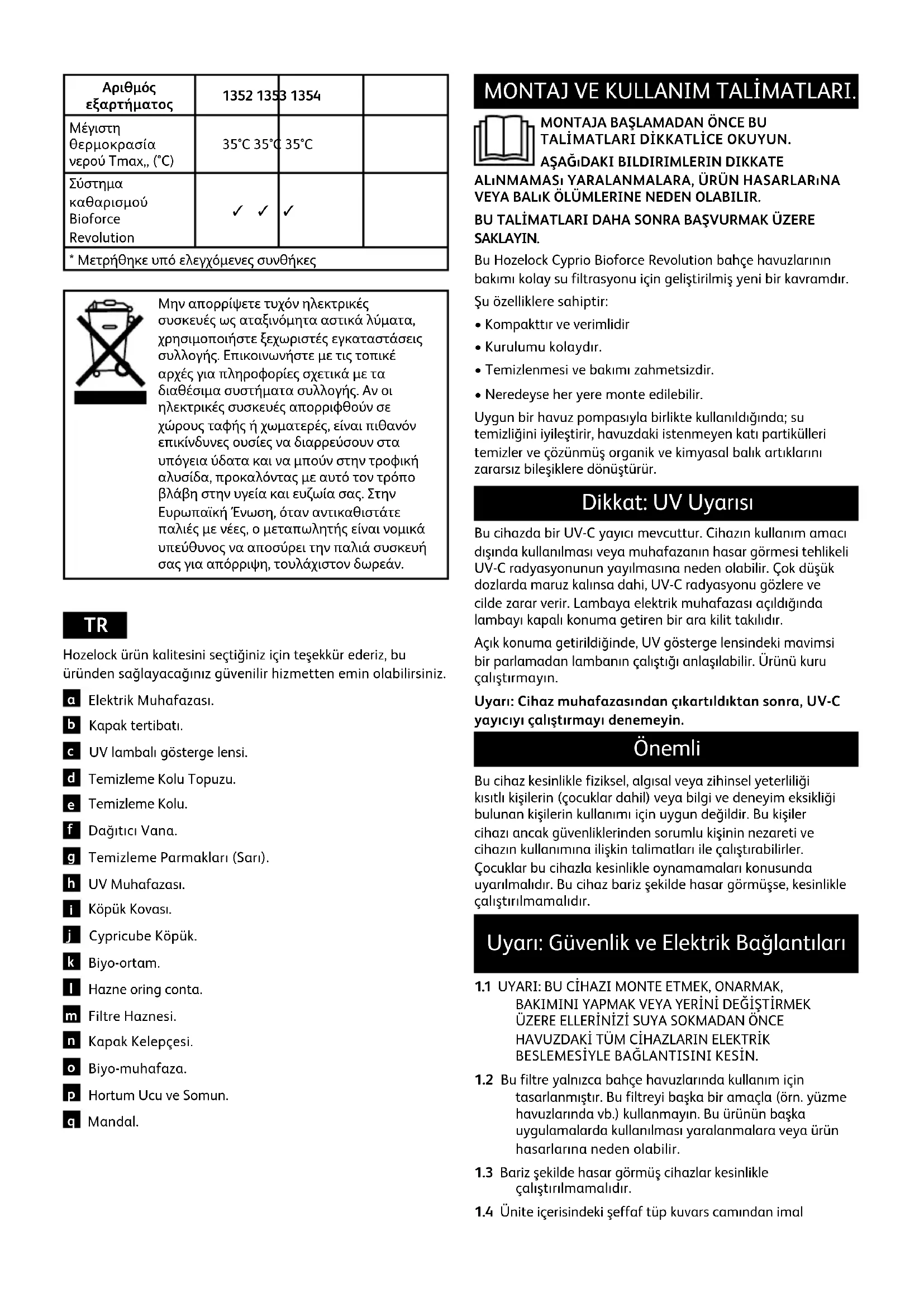 TALİMATLARI DİKKATLİCE OKUYUN. AŞAĞıDAKI BILDIRIMLERIN DIKKATE ALıNMAMASı YARALANMALARA, ÜRÜN HASARLARıNA VEYA BALıK ÖLÜMLERINE NEDEN OLABILIR. BU TALİMATLARI DAHA SONRA BAŞVURMAK ÜZERE SAKLAYIN. Bu Hozelock Cyprio Bioforce Revolution bahçe havuzlarının bakımı kolay su filtrasyonu için geliştirilmiş yeni bir kavramdır. Şu özelliklere sahiptir:
