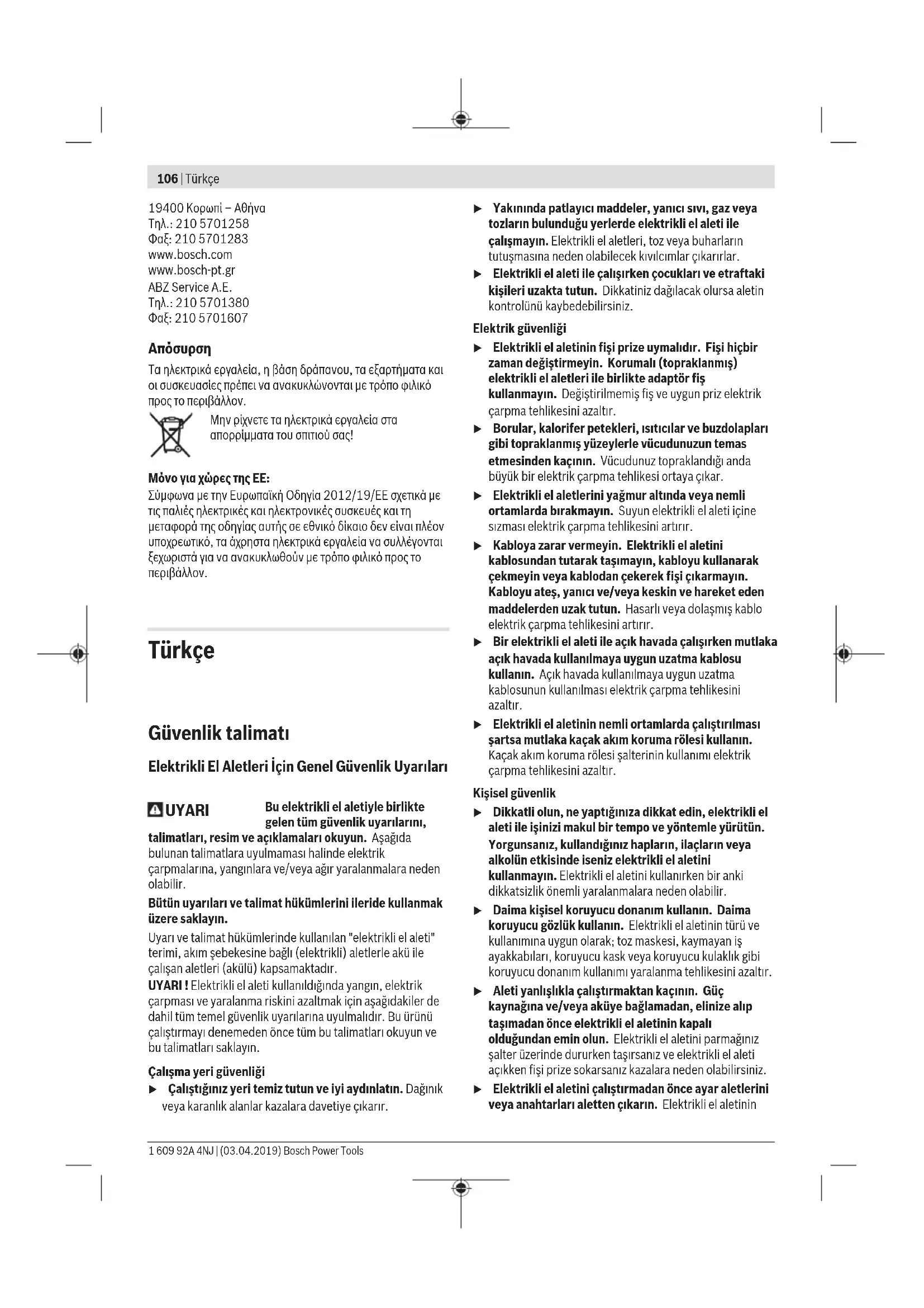Τα ηλεκτρικά εργαλεία, η βάση δράπανου, τα εξαρτήματα και οι συσκευασίες πρέπει να ανακυκλώνονται με τρόπο φιλικό προς το περιβάλλον. Μην ρίχνετε τα ηλεκτρικά εργαλεία στα απορρίμματα του σπιτιού σας! Μόνο για χώρες τηςΕΕ: Σύμφωνα με την Ευρωπαϊκή Οδηγία 2012/19/ΕΕ σχετικά με τις παλιές ηλεκτρικές και ηλεκτρονικές συσκευές και τη μεταφορά της οδηγίας αυτής σε εθνικό δίκαιο δεν είναι πλέον υποχρεωτικό, τα άχρηστα ηλεκτρικά εργαλεία να συλλέγονται ξεχωριστά για να ανακυκλωθούν με τρόπο φιλικό προς το περιβάλλον. Türkçe Güvenlik talimatı Elektrikli El Aletleri İçin Genel Güvenlik Uyarıları UYARI Bu elektrikli el aletiyle birlikte gelen tüm güvenlik uyarılarını, talimatları, resim ve açıklamaları okuyun. Aşağıda bulunan talimatlara uyulmaması halinde elektrik çarpmalarına, yangınlara ve/veya ağır yaralanmalara neden olabilir. Bütün uyarıları ve talimat hükümlerini ileride kullanmak üzere saklayın. Uyarı ve talimat hükümlerinde kullanılan "elektrikli el aleti" terimi, akım şebekesine bağlı (elektrikli) aletlerle akü ile çalışan aletleri (akülü) kapsamaktadır. UYARI ! Elektrikli el aleti kullanıldığında yangın, elektrik çarpması ve yaralanma riskini azaltmak için aşağıdakiler de dahil tüm temel güvenlik uyarılarına uyulmalıdır. Bu ürünü çalıştırmayı denemeden önce tüm bu talimatları okuyun ve bu talimatları saklayın. Çalışma yeri güvenliği u Çalıştığınız yeri temiz tutun ve iyi aydınlatın. Dağınık veya karanlık alanlar kazalara davetiye çıkarır. u Yakınında patlayıcı maddeler, yanıcı sıvı, gaz veya tozların bulunduğu yerlerde elektrikli el aleti ile çalışmayın. Elektrikli el aletleri, toz veya buharların tutuşmasına neden olabilecek kıvılcımlar çıkarırlar. u Elektrikli el aleti ile çalışırken çocukları ve etraftaki kişileri uzakta tutun. Dikkatiniz dağılacak olursa aletin kontrolünü kaybedebilirsiniz. Elektrik güvenliği u Elektrikli el aletinin fişi prize uymalıdır. Fişi hiçbir zaman değiştirmeyin. Korumalı (topraklanmış) elektrikli el aletleri ile birlikte adaptör fiş kullanmayın. Değiştirilmemiş fiş ve uygun priz elektrik çarpma tehlikesini azaltır. u Borular, kalorifer petekleri, ısıtıcılar ve buzdolapları gibi topraklanmış yüzeylerle vücudunuzun temas etmesinden kaçının. Vücudunuz topraklandığı anda büyük bir elektrik çarpma tehlikesi ortaya çıkar. u Elektrikli el aletlerini yağmur altında veya nemli ortamlarda bırakmayın. Suyun elektrikli el aleti içine sızması elektrik çarpma tehlikesini artırır. u Kabloya zarar vermeyin. Elektrikli el aletini kablosundan tutarak taşımayın, kabloyu kullanarak çekmeyin veya kablodan çekerek fişi çıkarmayın. Kabloyu ateş, yanıcı ve/veya keskin ve hareket eden maddelerden uzak tutun. Hasarlı veya dolaşmış kablo elektrik çarpma tehlikesini artırır. u Bir elektrikli el aleti ile açık havada çalışırken mutlaka açık havada kullanılmaya uygun uzatma kablosu kullanın. Açık havada kullanılmaya uygun uzatma kablosunun kullanılması elektrik çarpma tehlikesini azaltır. u Elektrikli el aletinin nemli ortamlarda çalıştırılması şartsa mutlaka kaçak akım koruma rölesi kullanın. Kaçak akım koruma rölesi şalterinin kullanımı elektrik çarpma tehlikesini azaltır. Kişisel güvenlik u Dikkatli olun, ne yaptığınıza dikkat edin, elektrikli el aleti ile işinizi makul bir tempo ve yöntemle yürütün. Yorgunsanız, kullandığınız hapların, ilaçların veya alkolün etkisinde iseniz elektrikli el aletini kullanmayın. Elektrikli el aletini kullanırken bir anki dikkatsizlik önemli yaralanmalara neden olabilir. u Daima kişisel koruyucu donanım kullanın. Daima koruyucu gözlük kullanın. Elektrikli el aletinin türü ve kullanımına uygun olarak; toz maskesi, kaymayan iş ayakkabıları, koruyucu kask veya koruyucu kulaklık gibi koruyucu donanım kullanımı yaralanma tehlikesini azaltır. u Aleti yanlışlıkla çalıştırmaktan kaçının. Güç kaynağına ve/veya aküye bağlamadan, elinize alıp taşımadan önce elektrikli el aletinin kapalı olduğundan emin olun. Elektrikli el aletini parmağınız şalter üzerinde dururken taşırsanız ve elektrikli el aleti açıkken fişi prize sokarsanız kazalara neden olabilirsiniz. u Elektrikli el aletini çalıştırmadan önce ayar aletlerini veya anahtarları aletten çıkarın. Elektrikli el aletinin 1 609 92A 4NJ | (03.04.2019) Bosch Power ToolsTürkçe | 107 dönen parçaları içinde bulunabilecek bir yardımcı alet yaralanmalara neden olabilir. u Çalışırken vücudunuz anormal durumda olmasın. Çalışırken duruşunuz güvenli olsun ve dengenizi her zaman koruyun. Bu sayede elektrikli el aletini beklenmedik durumlarda daha iyi kontrol edebilirsiniz. u Uygun iş elbiseleri giyin. Geniş giysiler giymeyin ve takı takmayın. Saçlarınızı ve giysileriniz aletin hareketli parçalarından uzak tutun. Bol giysiler, uzun saçlar veya takılar aletin hareketli parçaları tarafından tutulabilir. u Toz emme donanımı veya toz tutma tertibatı kullanırken, bunların bağlı olduğundan ve doğru kullanıldığından emin olun. Toz emme donanımının kullanımı tozdan kaynalanabilecek tehlikeleri azaltır. u Aletleri sık kullanmanız sebebiyle onlara alışmış olmanız, güvenlik prensiplerine uymanızı önlememelidir. Dikkatsiz bir hareket, bir anda ciddi yaralanmalara yol açabilir. Elektrikli el aletlerinin kullanımı ve bakımı u Elektrikli 