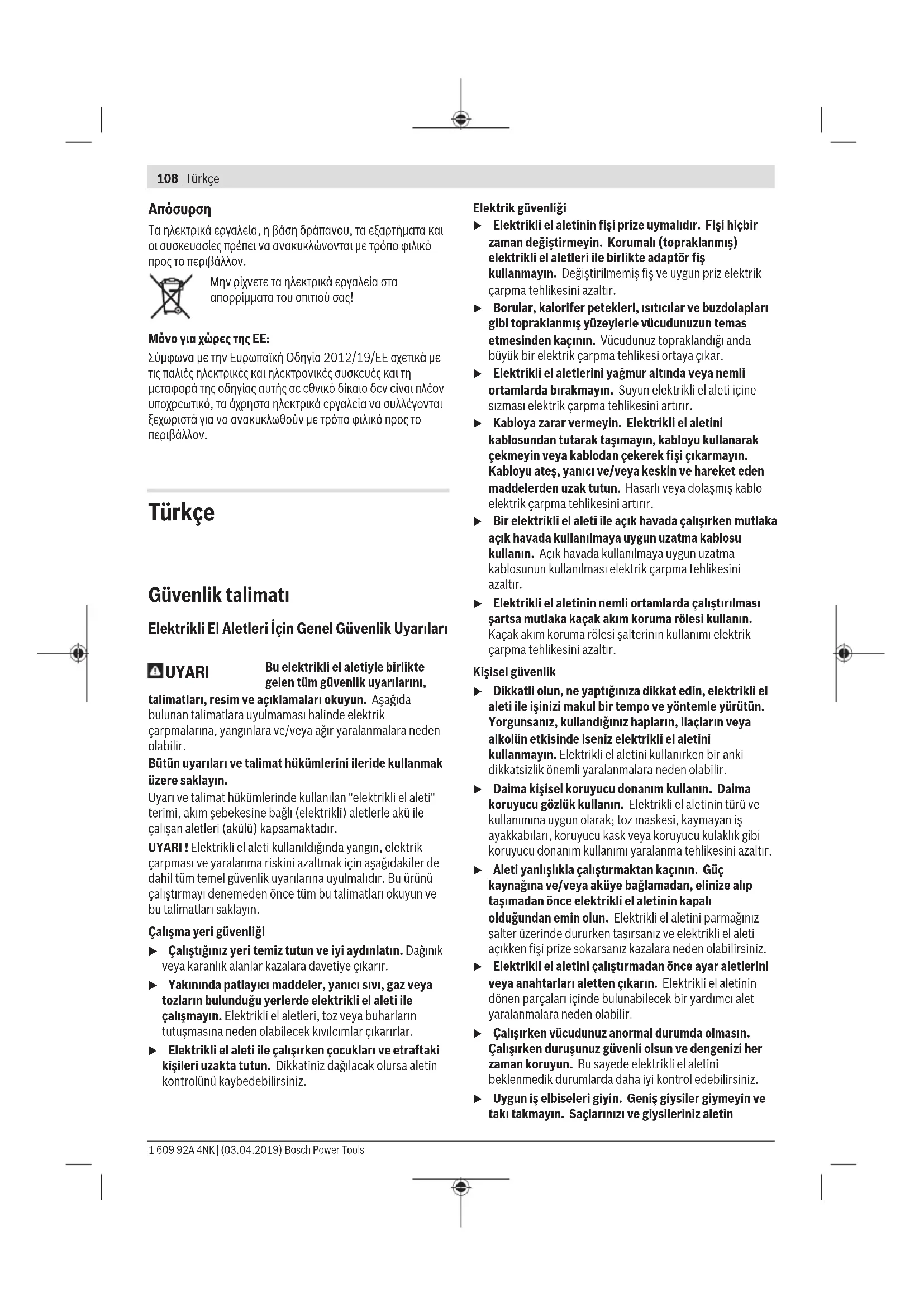 Τα ηλεκτρικά εργαλεία, η βάση δράπανου, τα εξαρτήματα και οι συσκευασίες πρέπει να ανακυκλώνονται με τρόπο φιλικό προς το περιβάλλον. Μην ρίχνετε τα ηλεκτρικά εργαλεία στα απορρίμματα του σπιτιού σας! Μόνο για χώρες τηςΕΕ: Σύμφωνα με την Ευρωπαϊκή Οδηγία 2012/19/ΕΕ σχετικά με τις παλιές ηλεκτρικές και ηλεκτρονικές συσκευές και τη μεταφορά της οδηγίας αυτής σε εθνικό δίκαιο δεν είναι πλέον υποχρεωτικό, τα άχρηστα ηλεκτρικά εργαλεία να συλλέγονται ξεχωριστά για να ανακυκλωθούν με τρόπο φιλικό προς το περιβάλλον. Türkçe Güvenlik talimatı Elektrikli El Aletleri İçin Genel Güvenlik Uyarıları UYARI Bu elektrikli el aletiyle birlikte gelen tüm güvenlik uyarılarını, talimatları, resim ve açıklamaları okuyun. Aşağıda bulunan talimatlara uyulmaması halinde elektrik çarpmalarına, yangınlara ve/veya ağır yaralanmalara neden olabilir. Bütün uyarıları ve talimat hükümlerini ileride kullanmak üzere saklayın. Uyarı ve talimat hükümlerinde kullanılan "elektrikli el aleti" terimi, akım şebekesine bağlı (elektrikli) aletlerle akü ile çalışan aletleri (akülü) kapsamaktadır. UYARI ! Elektrikli el aleti kullanıldığında yangın, elektrik çarpması ve yaralanma riskini azaltmak için aşağıdakiler de dahil tüm temel güvenlik uyarılarına uyulmalıdır. Bu ürünü çalıştırmayı denemeden önce tüm bu talimatları okuyun ve bu talimatları saklayın. Çalışma yeri güvenliği u Çalıştığınız yeri temiz tutun ve iyi aydınlatın. Dağınık veya karanlık alanlar kazalara davetiye çıkarır. u Yakınında patlayıcı maddeler, yanıcı sıvı, gaz veya tozların bulunduğu yerlerde elektrikli el aleti ile çalışmayın. Elektrikli el aletleri, toz veya buharların tutuşmasına neden olabilecek kıvılcımlar çıkarırlar. u Elektrikli el aleti ile çalışırken çocukları ve etraftaki kişileri uzakta tutun. Dikkatiniz dağılacak olursa aletin kontrolünü kaybedebilirsiniz. Elektrik güvenliği u Elektrikli el aletinin fişi prize uymalıdır. Fişi hiçbir zaman değiştirmeyin. Korumalı (topraklanmış) elektrikli el aletleri ile birlikte adaptör fiş kullanmayın. Değiştirilmemiş fiş ve uygun priz elektrik çarpma tehlikesini azaltır. u Borular, kalorifer petekleri, ısıtıcılar ve buzdolapları gibi topraklanmış yüzeylerle vücudunuzun temas etmesinden kaçının. Vücudunuz topraklandığı anda büyük bir elektrik çarpma tehlikesi ortaya çıkar. u Elektrikli el aletlerini yağmur altında veya nemli ortamlarda bırakmayın. Suyun elektrikli el aleti içine sızması elektrik çarpma tehlikesini artırır. u Kabloya zarar vermeyin. Elektrikli el aletini kablosundan tutarak taşımayın, kabloyu kullanarak çekmeyin veya kablodan çekerek fişi çıkarmayın. Kabloyu ateş, yanıcı ve/veya keskin ve hareket eden maddelerden uzak tutun. Hasarlı veya dolaşmış kablo elektrik çarpma tehlikesini artırır. u Bir elektrikli el aleti ile açık havada çalışırken mutlaka açık havada kullanılmaya uygun uzatma kablosu kullanın. Açık havada kullanılmaya uygun uzatma kablosunun kullanılması elektrik çarpma tehlikesini azaltır. u Elektrikli el aletinin nemli ortamlarda çalıştırılması şartsa mutlaka kaçak akım koruma rölesi kullanın. Kaçak akım koruma rölesi şalterinin kullanımı elektrik çarpma tehlikesini azaltır. Kişisel güvenlik u Dikkatli olun, ne yaptığınıza dikkat edin, elektrikli el aleti ile işinizi makul bir tempo ve yöntemle yürütün. Yorgunsanız, kullandığınız hapların, ilaçların veya alkolün etkisinde iseniz elektrikli el aletini kullanmayın. Elektrikli el aletini kullanırken bir anki dikkatsizlik önemli yaralanmalara neden olabilir. u Daima kişisel koruyucu donanım kullanın. Daima koruyucu gözlük kullanın. Elektrikli el aletinin türü ve kullanımına uygun olarak; toz maskesi, kaymayan iş ayakkabıları, koruyucu kask veya koruyucu kulaklık gibi koruyucu donanım kullanımı yaralanma tehlikesini azaltır. u Aleti yanlışlıkla çalıştırmaktan kaçının. Güç kaynağına ve/veya aküye bağlamadan, elinize alıp taşımadan önce elektrikli el aletinin kapalı olduğundan emin olun. Elektrikli el aletini parmağınız şalter üzerinde dururken taşırsanız ve elektrikli el aleti açıkken fişi prize sokarsanız kazalara neden olabilirsiniz. u Elektrikli el aletini çalıştırmadan önce ayar aletlerini veya anahtarları aletten çıkarın. Elektrikli el aletinin dönen parçaları içinde bulunabilecek bir yardımcı alet yaralanmalara neden olabilir. u Çalışırken vücudunuz anormal durumda olmasın. Çalışırken duruşunuz güvenli olsun ve dengenizi her zaman koruyun. Bu sayede elektrikli el aletini beklenmedik durumlarda daha iyi kontrol edebilirsiniz. u Uygun iş elbiseleri giyin. Geniş giysiler giymeyin ve takı takmayın. Saçlarınızı ve giysileriniz aletin 1 609 92A 4NK | (03.04.2019) Bosch Power ToolsTürkçe | 109 hareketli parçalarından uzak tutun. Bol giysiler, uzun saçlar veya takılar aletin hareketli parçaları tarafından tutulabilir. u Toz emme donanımı veya toz tutma tertibatı kullanırken, bunların bağlı olduğundan ve doğru kullanıldığından emin olun. Toz emme donanımının kullanımı tozdan kaynalanabilecek tehlikeleri azaltır. u Aletleri sık kullanmanız sebebiyle onlara alışmış olmanız, güvenlik prensiplerine uymanızı önlememelidir. Dikkatsiz bir hareket, bir anda ciddi yaralanmalara yol açabilir. Elektrikli el aletlerinin kullanımı ve bakımı u Elektrikli 