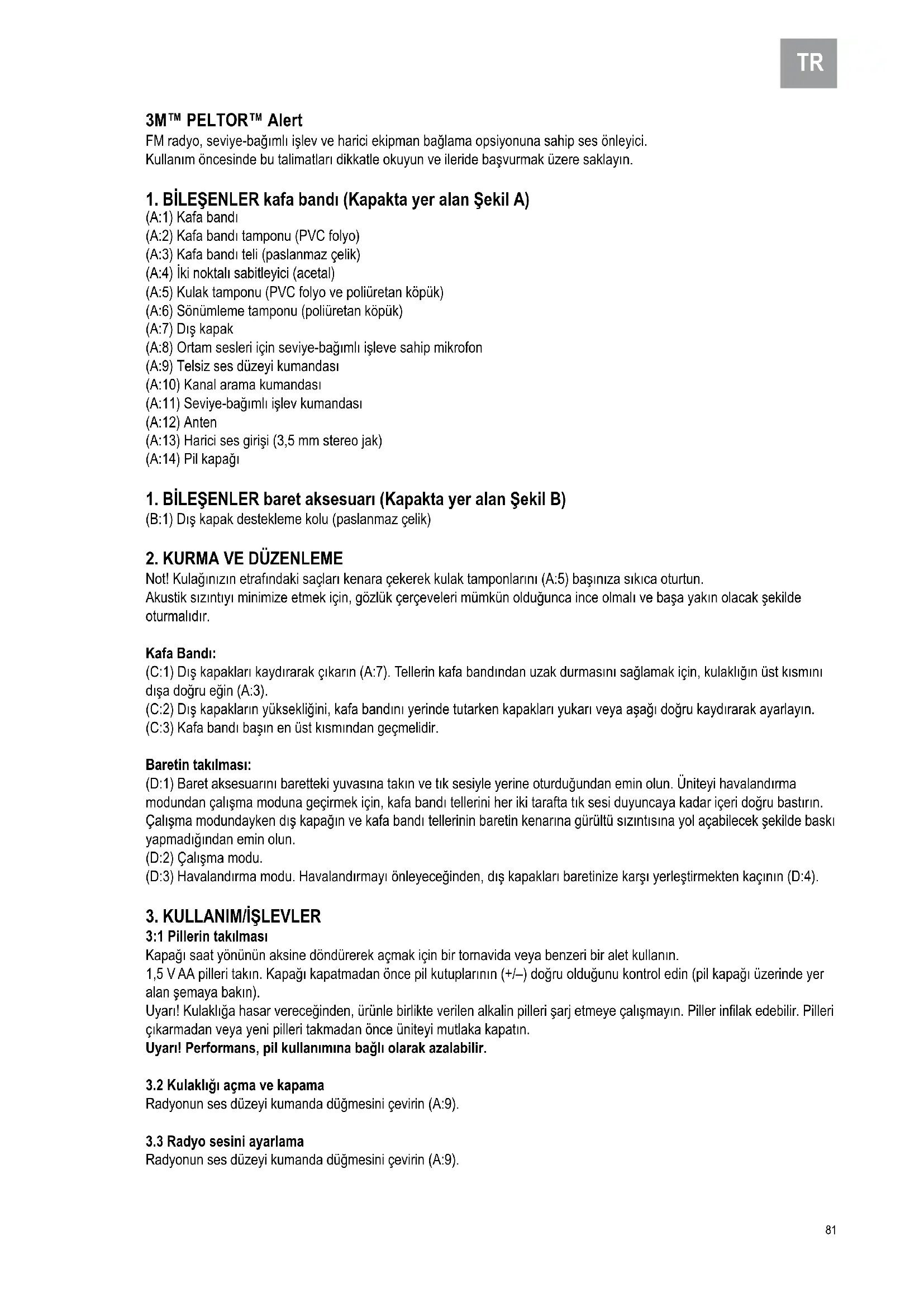 1. BİLEŞENLER kafa bandı (Kapakta yer alan Şekil A)