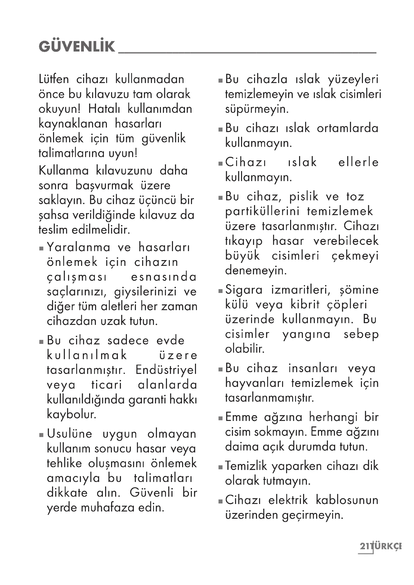 Bu cihaz, pislik ve toz partiküllerini temizlemek üzere tasarlanmıştır. Cihazı tıkayıp hasar verebilecek büyük cisimleri çekmeyi denemeyin.