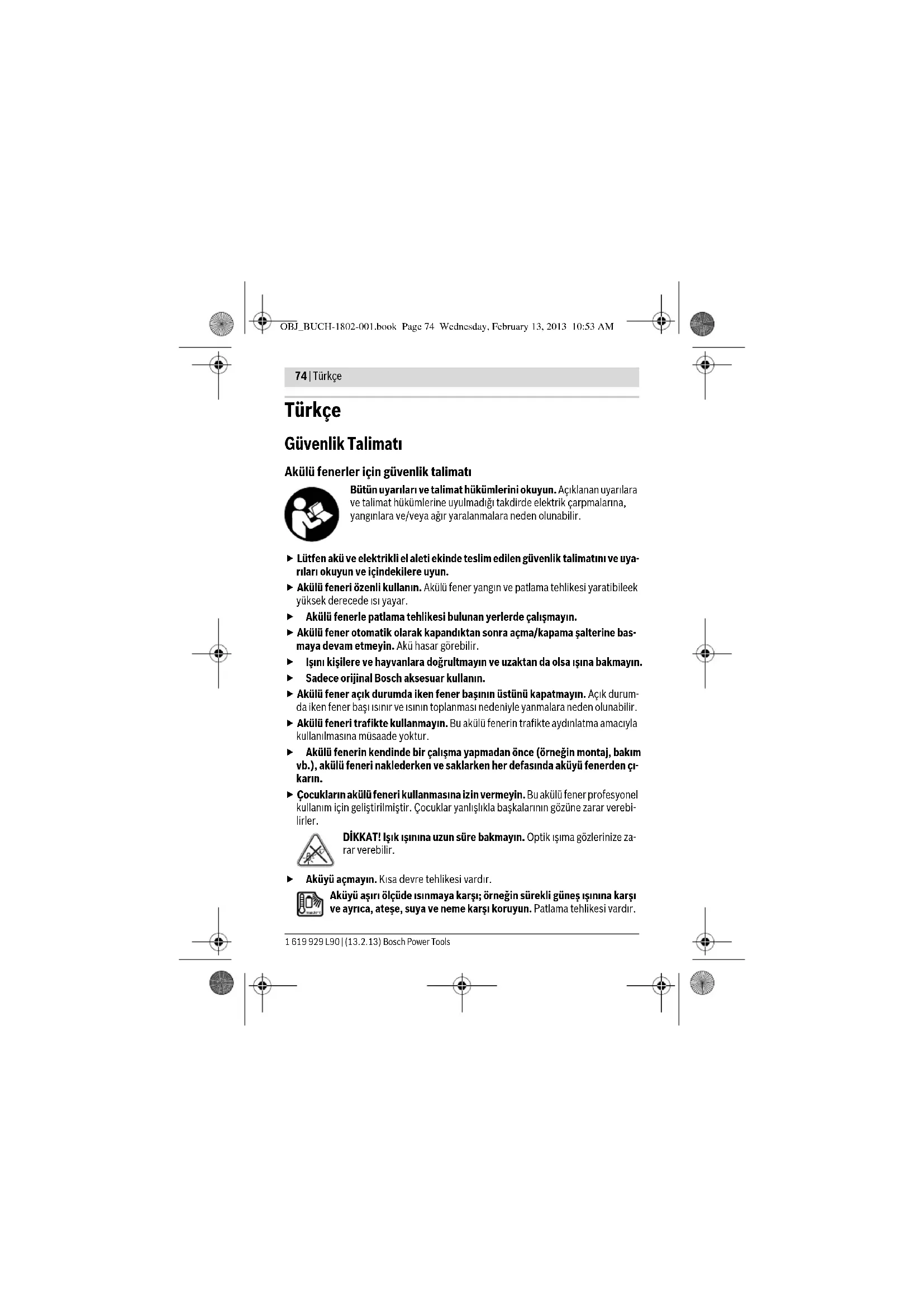 Μπαταρίες/Επαναφορτιζόμενες μπαταρίες: Li-Ion: Παρακαλούμε να δώσετε προσοχή στις υποδείξεις στο κεφάλαιο «Μεταφορά», σελίδα 73. Τηρούμε το δικαίωμα αλλαγών. OBJ_BUCH-1802-001.book Page 73 Wednesday, February 13, 2013 10:53 AM74 | Türkçe 1 619 929 L90 | (13.2.13) Bosch Power Tools Türkçe Güvenlik Talimatı Akülü fenerler için güvenlik talimatı Bütün uyarıları ve talimat hükümlerini okuyun. Açıklanan uyarılara ve talimat hükümlerine uyulmadığı takdirde elektrik çarpmalarına, yangınlara ve/veya ağır yaralanmalara neden olunabilir. Lütfen akü ve elektrikli el aleti ekinde teslim edilen güvenlik talimatını ve uya- rıları okuyun ve içindekilere uyun. Akülü feneri özenli kullanın. Akülü fener yangın ve patlama tehlikesi yaratibileek yüksek derecede ısı yayar. Akülü fenerle patlama tehlikesi bulunan yerlerde çalışmayın. Akülü fener otomatik olarak kapandıktan sonra açma/kapama şalterine bas- maya devam etmeyin. Akü hasar görebilir. Işını kişilere ve hayvanlara doğrultmayın ve uzaktan da olsa ışına bakmayın. Sadece orijinal Bosch aksesuar kullanın. Akülü fener açık durumda iken fener başının üstünü kapatmayın. Açık durum- da iken fener başı ısınır ve ısının toplanması nedeniyle yanmalara neden olunabilir. Akülü feneri trafikte kullanmayın. Bu akülü fenerin trafikte aydınlatma amacıyla kullanılmasına müsaade yoktur. Akülü fenerin kendinde bir çalışma yapmadan önce (örneğin montaj, bakım vb.), akülü feneri naklederken ve saklarken her defasında aküyü fenerden çı- karın. Çocukların akülü feneri kullanmasına izin vermeyin. Bu akülü fener profesyonel kullanım için geliştirilmiştir. Çocuklar yanlışlıkla başkalarının gözüne zarar verebi- lirler. DİKKAT! Işık ışınına uzun süre bakmayın. Optik ışıma gözlerinize za- rar verebilir. Aküyü açmayın. Kısa devre tehlikesi vardır. Aküyü aşırı ölçüde ısınmaya karşı; örneğin sürekli güneş ışınına karşı ve ayrıca, ateşe, suya ve neme karşı koruyun. Patlama tehlikesi vardır. OBJ_BUCH-1802-001.book Page 74 Wednesday, February 13, 2013 10:53 AMTürkçe | 75 Bosch Power Tools 1 619 929 L90 | (13.2.13) Kullanılmayan aküyü büro ataçları, madeni bozuk paralar, anahtarlar, çiviler, vidalar veya metal nesnelerden uzak tutun. Bunlar köprüleme yaparak kon- taklara neden olabilir. Akü kontakları arasındaki bir kısa devre yanmalara veya yangınlara neden olabilir. Yanlış kullanım durumunda aküden sıvı dışarı sızabilir. Bu sıvı ile temasa gel- meyin. Yanlışlıkla temasa gelirseniz su ile iyice yıkayın. Eğer sıvı gözlerinize gelecek olursa hemen bir hekime başvurun. Dışarı sızan akü sıvısı cilt tahrişleri- ne ve yanmalara neden olabilir. Hasar gördüklerinde veya usulüne uygun kullanılmadıklarında aküler buhar çıkarabilir. Çalıştığınız yeri havalandırın ve şikayet olursa hekime başvurun. Akülerden çıkan buharlar nefes yollarını tahriş edebilir. Aküyü sadece üreticinin tavsiye ettiği şarj cihazı ile şarj edin. Bir akünün şarjı- na uygun olarak üretilmiş şarj cihazı başka bir akünün şarjı için kullanılırsa yangın tehlikesi ortaya çıkar. Aküyü sadece Bosch ürününüzle kullanın. Aküyü ancak bu şekilde tehlikeli zor- lanmalardan koruyabilirsiniz. Sadece Bosch akülü fenerinizin tip etiketinde belirtilen gerilime sahip orijinal Bosch aküleri kullanın. Örneğin taklitler, toplamalar veya yabancı markalar gibi başka aküler kullandığınız takdirde, yaralanma ve akünün patlaması sonucu maddi hasar tehlikesi ortaya çıkar. Ürün ve işlev tanımı Usulüne uygun kullanım Bu akülü fener kuru mekanlarda elle aydınlatma işleri için geliştirilmiştir. Şekli gösterilen elemanlar Şekli gösterilen elemanların numaraları, grafik sayfasında bulunan akülü fener şeklin- deki numaralarla aynıdır. 1 Fener başlığı 2 Açma/kapama şalteri 3 Akü* 4 Akü boşa alma düğmesi* *Şekli gösterilen veya tanımlanan aksesuar standart teslimat kapsamında değildir. Aksesu- arın tümünü aksesuar programımızda bulabilirsiniz. OBJ_BUCH-1802-001.book Page 75 Wednesday, February 13, 2013 10:53 AM76 | Türkçe 1 619 929 L90 | (13.2.13) Bosch Power Tools Teknik veriler Montaj Akünün şarjı (aksesuar) (Bakınız: Şekil A) Sadece aksesuar sayfasında belirtilen şarj cihazlarını kullanın. Sadece bu şarj cihazları akülü fenerinizde bulunan Li-Ionen akülerin şarjına uygundur. Not: Akü kısmi şarjlı olarak teslim edilir. Aküden tam performansı elde edebilmek için ilk kullanımdan önce aküyü şarj cihazında tam olarak şarj edin. Li-Ionen aküler kullanım ömürleri kısalmadan istendiği zaman şarj edilebilir. Şarj işle- minin kesilmesi aküye zarar vermez. Li-Ionen aküler “Electronic Cell Protection (ECP)” sistemi ile derin deşarja karşı ko- runmalıdır. Akü boşaldığında akülü fener koruyucu devre yardımı ile kapatılır. Akülü fener otomatik olarak kapandıktan sonra açma/kapama şalterine basma- yın. Aksi takdirde akü hasar görebilir. Aküyü 3 çıkarmak için boşa alma düğmelerine 4 basın ve aküyü arkaya doğru çekerek çıkarın. Bunu yaparken zor kullanmayın. Akü bir NTC sıcaklık kontrol sistemi ile donatılmış olup, bu sistem sadece 0 °C...45 °C sıcaklık aralığında şarj işlemine izin verir. Bu sayede akünün kullanım ömrü önemli ölçüde uzar. Tasfiye konusundaki talimat hükümlerine uyun. Akülü fener PLI 10,8 LI Ürün kodu 3 603 JA1 0.. Anma gerilimi V= 10,8 Aydınlatma süresi, yaklaşık –1,3 Ah –1,5 Ah dak dak