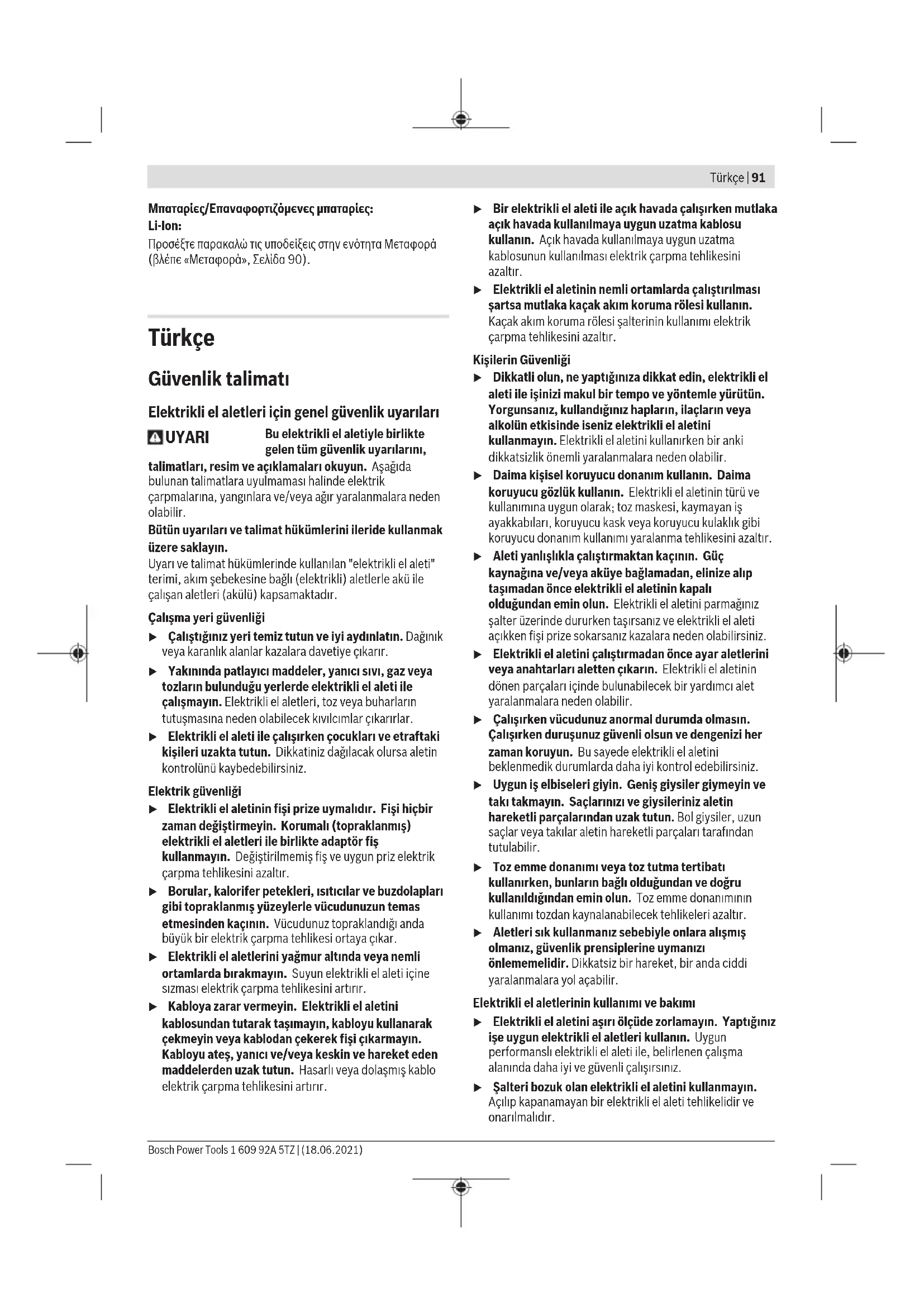 Τα ηλεκτρικά εργαλεία, οι μπαταρίες, τα εξαρτήματα και οι συσκευασίες πρέπει να ανακυκλώνονται με τρόπο φιλικό προς το περιβάλλον. Μην ρίχνετε τα ηλεκτρικά εργαλεία και τις μπαταρίες στα απορρίμματα του σπιτιού σας! Μόνο για χώρες τηςΕΕ: Σύμφωνα με την Ευρωπαϊκή οδηγία 2012/19/ΕΕ τα άχρηστα ηλεκτρικά εργαλεία και σύμφωνα με την Ευρωπαϊκή οδηγία 2006/66/ΕΚ οι χαλασμένες ή χρησιμοποιημένες μπαταρίες πρέπει να συλλέγονται ξεχωριστά για να ανακυκλωθούν με τρόπο φιλικό προς το περιβάλλον. 1 609 92A 5TZ | (18.06.2021) Bosch Power ToolsTürkçe | 91 Μπαταρίες/Επαναφορτιζόμενες μπαταρίες: Li-Ion: Προσέξτε παρακαλώ τις υποδείξεις στην ενότητα Μεταφορά (βλέπε «Μεταφορά», Σελίδα90). Türkçe Güvenlik talimatı Elektrikli el aletleri için genel güvenlik uyarıları UYARI Bu elektrikli el aletiyle birlikte gelen tüm güvenlik uyarılarını, talimatları, resim ve açıklamaları okuyun. Aşağıda bulunan talimatlara uyulmaması halinde elektrik çarpmalarına, yangınlara ve/veya ağır yaralanmalara neden olabilir. Bütün uyarıları ve talimat hükümlerini ileride kullanmak üzere saklayın. Uyarı ve talimat hükümlerinde kullanılan "elektrikli el aleti" terimi, akım şebekesine bağlı (elektrikli) aletlerle akü ile çalışan aletleri (akülü) kapsamaktadır. Çalışma yeri güvenliği u Çalıştığınız yeri temiz tutun ve iyi aydınlatın. Dağınık veya karanlık alanlar kazalara davetiye çıkarır. u Yakınında patlayıcı maddeler, yanıcı sıvı, gaz veya tozların bulunduğu yerlerde elektrikli el aleti ile çalışmayın. Elektrikli el aletleri, toz veya buharların tutuşmasına neden olabilecek kıvılcımlar çıkarırlar. u Elektrikli el aleti ile çalışırken çocukları ve etraftaki kişileri uzakta tutun. Dikkatiniz dağılacak olursa aletin kontrolünü kaybedebilirsiniz. Elektrik güvenliği u Elektrikli el aletinin fişi prize uymalıdır. Fişi hiçbir zaman değiştirmeyin. Korumalı (topraklanmış) elektrikli el aletleri ile birlikte adaptör fiş kullanmayın. Değiştirilmemiş fiş ve uygun priz elektrik çarpma tehlikesini azaltır. u Borular, kalorifer petekleri, ısıtıcılar ve buzdolapları gibi topraklanmış yüzeylerle vücudunuzun temas etmesinden kaçının. Vücudunuz topraklandığı anda büyük bir elektrik çarpma tehlikesi ortaya çıkar. u Elektrikli el aletlerini yağmur altında veya nemli ortamlarda bırakmayın. Suyun elektrikli el aleti içine sızması elektrik çarpma tehlikesini artırır. u Kabloya zarar vermeyin. Elektrikli el aletini kablosundan tutarak taşımayın, kabloyu kullanarak çekmeyin veya kablodan çekerek fişi çıkarmayın. Kabloyu ateş, yanıcı ve/veya keskin ve hareket eden maddelerden uzak tutun. Hasarlı veya dolaşmış kablo elektrik çarpma tehlikesini artırır. u Bir elektrikli el aleti ile açık havada çalışırken mutlaka açık havada kullanılmaya uygun uzatma kablosu kullanın. Açık havada kullanılmaya uygun uzatma kablosunun kullanılması elektrik çarpma tehlikesini azaltır. u Elektrikli el aletinin nemli ortamlarda çalıştırılması şartsa mutlaka kaçak akım koruma rölesi kullanın. Kaçak akım koruma rölesi şalterinin kullanımı elektrik çarpma tehlikesini azaltır. Kişilerin Güvenliği u Dikkatli olun, ne yaptığınıza dikkat edin, elektrikli el aleti ile işinizi makul bir tempo ve yöntemle yürütün. Yorgunsanız, kullandığınız hapların, ilaçların veya alkolün etkisinde iseniz elektrikli el aletini kullanmayın. Elektrikli el aletini kullanırken bir anki dikkatsizlik önemli yaralanmalara neden olabilir. u Daima kişisel koruyucu donanım kullanın. Daima koruyucu gözlük kullanın. Elektrikli el aletinin türü ve kullanımına uygun olarak; toz maskesi, kaymayan iş ayakkabıları, koruyucu kask veya koruyucu kulaklık gibi koruyucu donanım kullanımı yaralanma tehlikesini azaltır. u Aleti yanlışlıkla çalıştırmaktan kaçının. Güç kaynağına ve/veya aküye bağlamadan, elinize alıp taşımadan önce elektrikli el aletinin kapalı olduğundan emin olun. Elektrikli el aletini parmağınız şalter üzerinde dururken taşırsanız ve elektrikli el aleti açıkken fişi prize sokarsanız kazalara neden olabilirsiniz. u Elektrikli el aletini çalıştırmadan önce ayar aletlerini veya anahtarları aletten çıkarın. Elektrikli el aletinin dönen parçaları içinde bulunabilecek bir yardımcı alet yaralanmalara neden olabilir. u Çalışırken vücudunuz anormal durumda olmasın. Çalışırken duruşunuz güvenli olsun ve dengenizi her zaman koruyun. Bu sayede elektrikli el aletini beklenmedik durumlarda daha iyi kontrol edebilirsiniz. u Uygun iş elbiseleri giyin. Geniş giysiler giymeyin ve takı takmayın. Saçlarınızı ve giysileriniz aletin hareketli parçalarından uzak tutun. Bol giysiler, uzun saçlar veya takılar aletin hareketli parçaları tarafından tutulabilir. u Toz emme donanımı veya toz tutma tertibatı kullanırken, bunların bağlı olduğundan ve doğru kullanıldığından emin olun. Toz emme donanımının kullanımı tozdan kaynalanabilecek tehlikeleri azaltır. u Aletleri sık kullanmanız sebebiyle onlara alışmış olmanız, güvenlik prensiplerine uymanızı önlememelidir. Dikkatsiz bir hareket, bir anda ciddi yaralanmalara yol açabilir. Elektrikli el aletlerinin kullanımı ve bakımı u Elektrikli el aletini aşırı ölçüde zorlamayın. Yaptığınız işe uygun elektrikli el aletleri kullanın. Uygun 