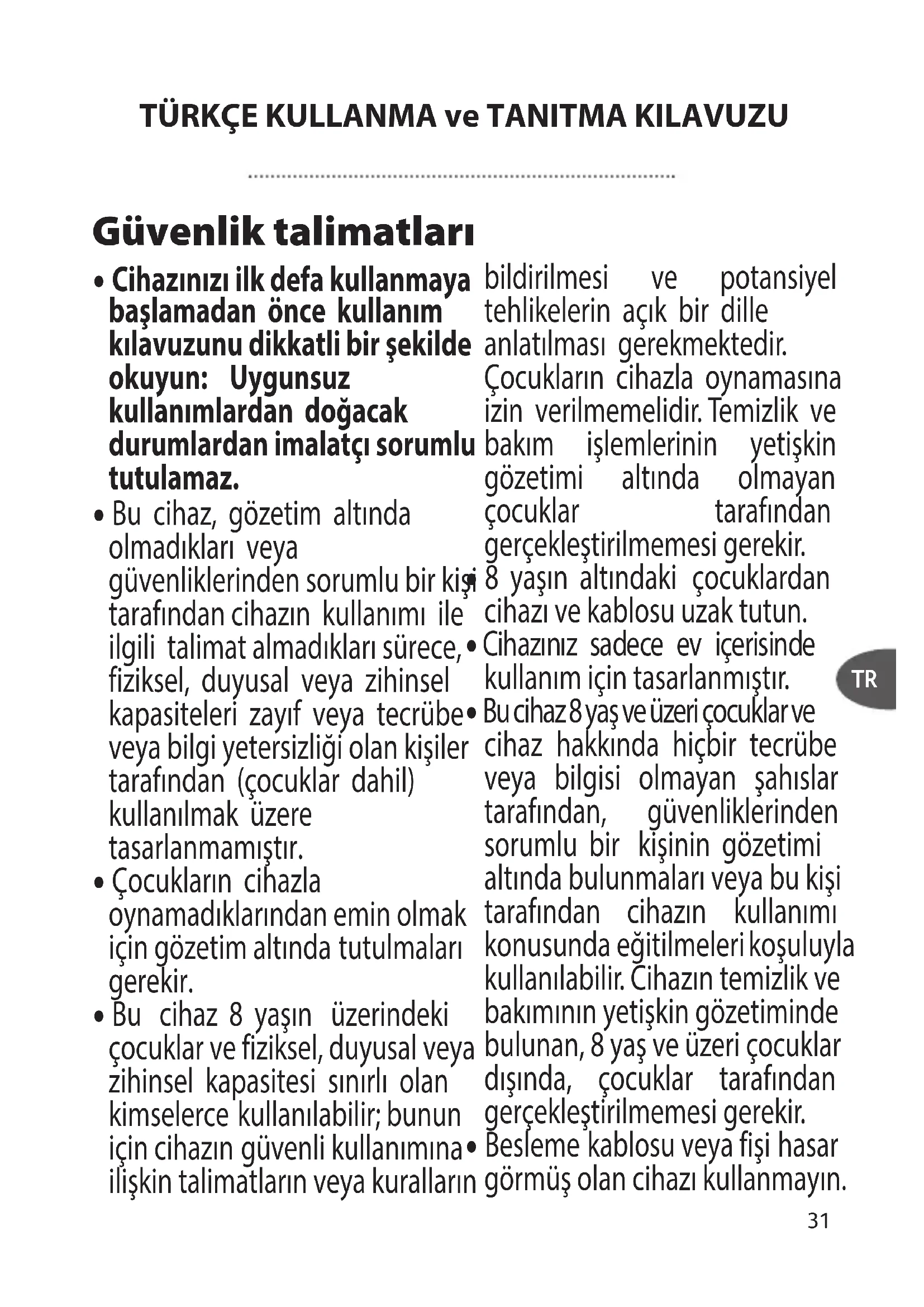 - Bu cihaz 8 yaşın üzerindeki çocuklar ve fiziksel, duyusal veya zihinsel kapasitesi sınırlı olan kimselerce kullanılabilir; bunun için cihazın güvenli kullanımına ilişkin talimatların veya kuralların bildirilmesi ve potansiyel tehlikelerin açık bir dille anlatılması gerekmektedir. Çocukların cihazla oynamasına izin verilmemelidir. Temizlik ve bakım işlemlerinin yetişkin gözetimi altında olmayan çocuklar tarafından gerçekleştirilmemesi gerekir.