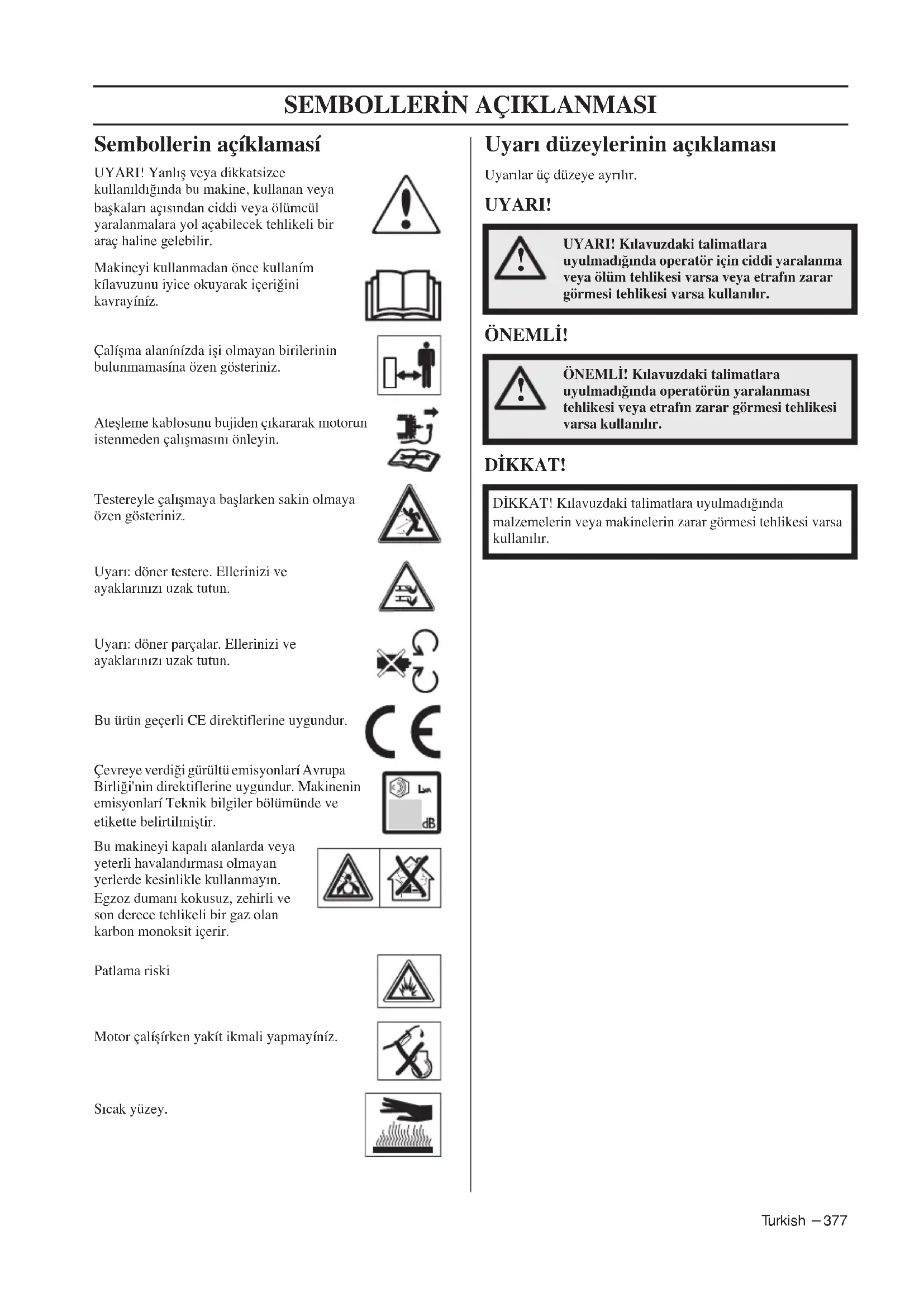 Sembollerin açíklamasí UYARI! Yanlıfl veya dikkatsizce kullanıldı¤ında bu makine, kullanan veya baflkaları açısından ciddi veya ölümcül yaralanmalara yol açabilecek tehlikeli bir araç haline gelebilir.Makineyi kullanmadan önce kullaním kílavuzunu iyice okuyarak içeri¤ini kavrayíníz. Çalíflma alanínízda ifli olmayan birilerinin bulunmamasína özen gösteriniz. Ateflleme kablosunu bujiden çıkararak motorun istenmeden çalıflmasını önleyin. Testereyle çalıflmaya bafllarken sakin olmaya özen gösteriniz. Uyarı: döner testere. Ellerinizi ve ayaklarınızı uzak tutun. Uyarı: döner parçalar. Ellerinizi ve ayaklarınızı uzak tutun. Bu ürün geçerli CE direktiflerine uygundur.Çevreye verdi¤i gürültü emisyonlarí Avrupa Birli¤i'nin direktiflerine uygundur. Makinenin emisyonlarí Teknik bilgiler bölümünde ve etikette belirtilmifltir.Bu makineyi kapalı alanlarda veya yeterli havalandırması olmayan yerlerde kesinlikle kullanmayın. Egzoz dumanı kokusuz, zehirli ve son derece tehlikeli bir gaz olan karbon monoksit içerir. Patlama riski Motor çalíflírken yakít ikmali yapmayíníz. Sıcak yüzey. Uyarı düzeylerinin açıklaması Uyarılar üç düzeye ayrılır. UYARI! ÖNEML‹! D‹KKAT!