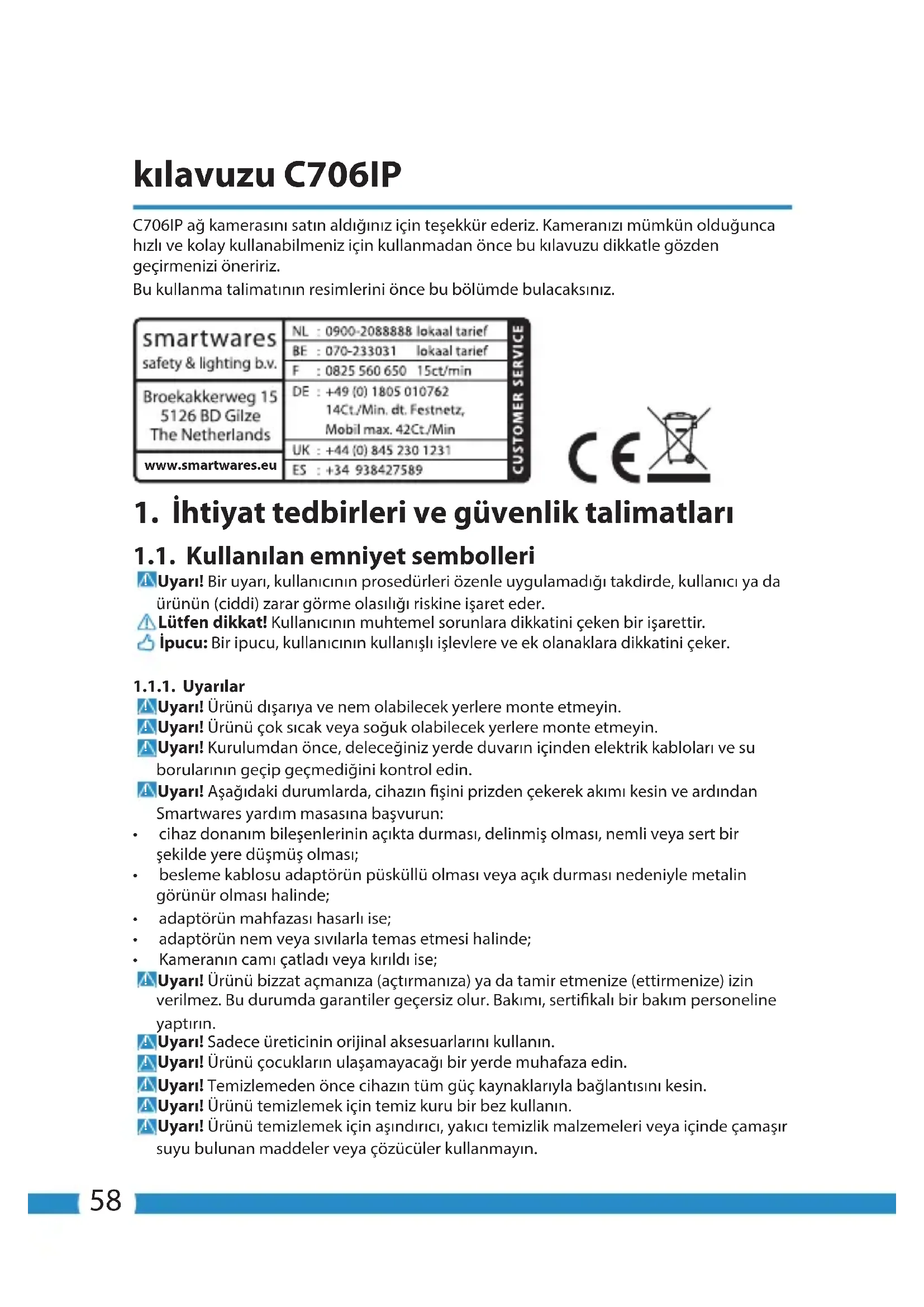 Este dispositivo tiene una garantía limitada de 3 año(s). Consulte las condiciones de la garantía en: www.smartwares.eu.58 kılavuzu C706IP C706IP ağ kamerasını satın aldığınız için teşekkür ederiz. Kameranızı mümkün olduğunca hızlı ve kolay kullanabilmeniz için kullanmadan önce bu kılavuzu dikkatle gözden geçirmenizi öneririz. Bu kullanma talimatının resimlerini önce bu bölümde bulacaksınız. www.smartwares.eu