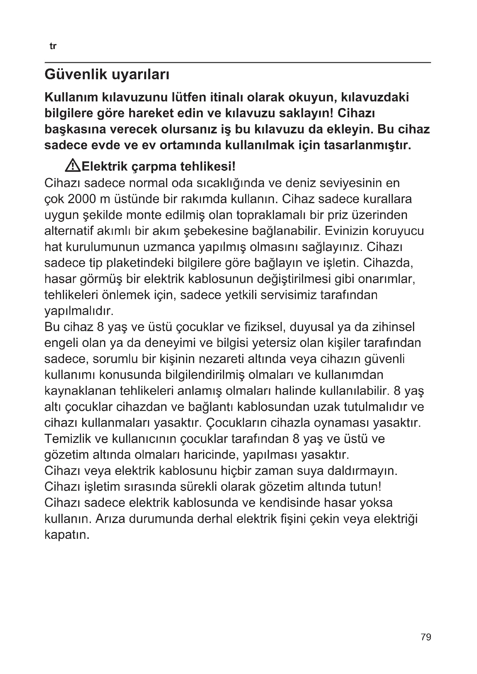 Güvenlik uyarıları Kullanım kılavuzunu lütfen itinalı olarak okuyun, kılavuzdaki bilgilere göre hareket edin ve kılavuzu saklayın! Cihazı başkasına verecek olursanız iş bu kılavuzu da ekleyin. Bu cihaz sadece evde ve ev ortamında kullanılmak için tasarlanmıştır. WElektrik çarpma tehlikesi! Cihazı sadece normal oda sıcaklığında ve deniz seviyesinin en çok 2000 m üstünde bir rakımda kullanın. Cihaz sadece kurallara uygun şekilde monte edilmiş olan topraklamalı bir priz üzerinden alternatif akımlı bir akım şebekesine bağlanabilir. Evinizin koruyucu hat kurulumunun uzmanca yapılmış olmasını sağlayınız. Cihazı sadece tip plaketindeki bilgilere göre bağlayın ve işletin. Cihazda, hasar görmüş bir elektrik kablosunun değiştirilmesi gibi onarımlar, tehlikeleri önlemek için, sadece yetkili servisimiz tarafından yapılmalıdır. Bu cihaz 8 yaş ve üstü çocuklar ve ziksel, duyusal ya da zihinsel engeli olan ya da deneyimi ve bilgisi yetersiz olan kişiler tarafından sadece, sorumlu bir kişinin nezareti altında veya cihazın güvenli kullanımı konusunda bilgilendirilmiş olmaları ve kullanımdan kaynaklanan tehlikeleri anlamış olmaları halinde kullanılabilir. 8 yaş altı çocuklar cihazdan ve bağlantı kablosundan uzak tutulmalıdır ve cihazı kullanmaları yasaktır. Çocukların cihazla oynaması yasaktır. Temizlik ve kullanıcının çocuklar tarafından 8 yaş ve üstü ve gözetim altında olmaları haricinde, yapılması yasaktır. Cihazı veya elektrik kablosunu hiçbir zaman suya daldırmayın. Cihazı işletim sırasında sürekli olarak gözetim altında tutun! Cihazı sadece elektrik kablosunda ve kendisinde hasar yoksa kullanın. Arıza durumunda derhal elektrik şini çekin veya elektriği kapatın.80
