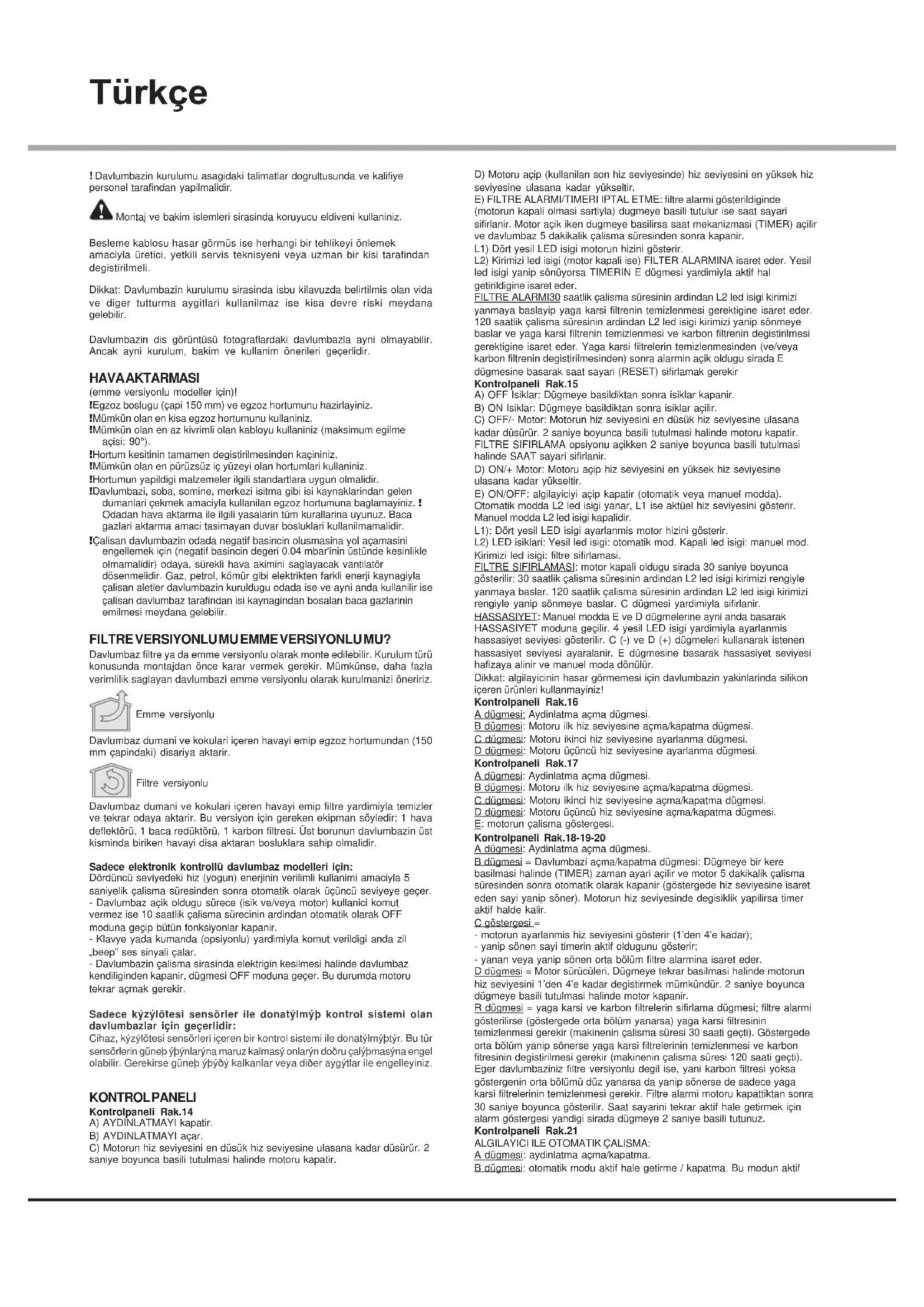 Montaj ve bakim islemleri sirasinda koruyucu eldiveni kullaniniz. Besleme kablosu hasar görmüs ise herhangi bir tehlikeyi önlemek amaciyla üretici, yetkili servis teknisyeni veya uzman bir kisi tarafindan degistirilmeli. Dikkat: Davlumbazin kurulumu sirasinda isbu kilavuzda belirtilmis olan vida ve diger tutturma aygitlari kullanilmaz ise kisa devre riski meydana gelebilir. Davlumbazin dis görüntüsü fotograflardaki davlumbazla ayni olmayabilir. Ancak ayni kurulum, bakim ve kullanim önerileri geçerlidir. HAVA AKTARMASI (emme versiyonlu modeller için)! ! Egzoz boslugu (çapi 150 mm) ve egzoz hortumunu hazirlayiniz. ! Mümkün olan en kisa egzoz hortumunu kullaniniz. ! Mümkün olan en az kivrimli olan kabloyu kullaniniz (maksimum egilme açisi: 90°). ! Hortum kesitinin tamamen degistirilmesinden kaçininiz. ! Mümkün olan en pürüzsüz iç yüzeyi olan hortumlari kullaniniz. ! Hortumun yapildigi malzemeler ilgili standartlara uygun olmalidir. ! Davlumbazi, soba, somine, merkezi isitma gibi isi kaynaklarindan gelen dumanlari çekmek amaciyla kullanilan egzoz hortumuna baglamayiniz. ! Odadan hava aktarma ile ilgili yasalarin tüm kurallarina uyunuz. Baca gazlari aktarma amaci tasimayan duvar bosluklari kullanilmamalidir. ! Çalisan davlumbazin odada negatif basincin olusmasina yol açamasini engellemek için (negatif basincin degeri 0.04 mbar'inin üstünde kesinlikle olmamalidir) odaya, sürekli hava akimini saglayacak vantilatör dösenmelidir. Gaz, petrol, kömür gibi elektrikten farkli enerji kaynagiyla çalisan aletler davlumbazin kuruldugu odada ise ve ayni anda kullanilir ise çalisan davlumbaz tarafindan isi kaynagindan bosalan baca gazlarinin emilmesi meydana gelebilir. FILTRE VERSIYONLU MU EMME VERSIYONLU MU? Davlumbaz filtre ya da emme versiyonlu olarak monte edilebilir. Kurulum türü konusunda montajdan önce karar vermek gerekir. Mümkünse, daha fazla verimlilik saglayan davlumbazi emme versiyonlu olarak kurulmanizi öneririz. Emme versiyonlu Davlumbaz dumani ve kokulari içeren havayi emip egzoz hortumundan (150 mm çapindaki) disariya aktarir. Filtre versiyonlu Davlumbaz dumani ve kokulari içeren havayi emip filtre yardimiyla temizler ve tekrar odaya aktarir. Bu versiyon için gereken ekipman söyledir: 1 hava deflektörü, 1 baca redüktörü, 1 karbon filtresi. Üst borunun davlumbazin üst kisminda biriken havayi disa aktaran bosluklara sahip olmalidir. Sadece elektronik kontrollü davlumbaz modelleri için: Dördüncü seviyedeki hiz (yogun) enerjinin verilimli kullanimi amaciyla 5 saniyelik çalisma süresinden sonra otomatik olarak üçüncü seviyeye geçer. - Davlumbaz açik oldugu sürece (isik ve/veya motor) kullanici komut vermez ise 10 saatlik çalisma sürecinin ardindan otomatik olarak OFF moduna geçip bütün fonksiyonlar kapanir. - Klavye yada kumanda (opsiyonlu) yardimiyla komut verildigi anda zil „beep” ses sinyali çalar. - Davlumbazin çalisma sirasinda elektrigin kesilmesi halinde davlumbaz kendiliginden kapanir, dügmesi OFF moduna geçer. Bu durumda motoru tekrar açmak gerekir. Sadece kýzýlötesi sensörler ile donatýlmýþ kontrol sistemi olan davlumbazlar için geçerlidir: Cihaz, kýzýlötesi sensörleri içeren bir kontrol sistemi ile donatýlmýþtýr. Bu tür sensörlerin güneþ ýþýnlarýna maruz kalmasý onlarýn doðru çalýþmasýna engel olabilir. Gerekirse güneþ ýþýðý kalkanlar veya diðer aygýtlar ile engelleyiniz. KONTROL PANELI Kontrolpaneli Rak.14 A) AYDINLATMAYI kapatir. B) AYDINLATMAYI açar. C) Motorun hiz seviyesini en düsük hiz seviyesine ulasana kadar düsürür. 2 saniye boyunca basili tutulmasi halinde motoru kapatir. D) Motoru açip (kullanilan son hiz seviyesinde) hiz seviyesini en yüksek hiz seviyesine ulasana kadar yükseltir. E) FILTRE ALARMI/TIMERI IPTAL ETME: filtre alarmi gösterildiginde (motorun kapali olmasi sartiyla) dugmeye basili tutulur ise saat sayari sifirlanir. Motor açik iken dugmeye basilirsa saat mekanizmasi (TIMER) açilir ve davlumbaz 5 dakikalik çalisma süresinden sonra kapanir. L1) Dört yesil LED isigi motorun hizini gösterir. L2) Kirimizi led isigi (motor kapali ise) FILTER ALARMINA isaret eder. Yesil led isigi yanip sönüyorsa TIMERIN E dügmesi yardimiyla aktif hal getirildigine isaret eder. FILTRE ALARMI30 saatlik çalisma süresinin ardindan L2 led isigi kirimizi yanmaya baslayip yaga karsi filtrenin temizlenmesi gerektigine isaret eder. 120 saatlik çalisma süresinin ardindan L2 led isigi kirimizi yanip sönmeye baslar ve yaga karsi filtrenin temizlenmesi ve karbon filtrenin degistirilmesi gerektigine isaret eder. Yaga karsi filtrelerin temizlenmesinden (ve/veya karbon filtrenin degistirilmesinden) sonra alarmin açik oldugu sirada E dügmesine basarak saat sayari (RESET) sifirlamak gerekir Kontrolpaneli Rak.15 A) OFF Isiklar: Dügmeye basildiktan sonra isiklar kapanir. B) ON Isiklar: Dügmeye basildiktan sonra isiklar açilir. C) OFF/- Motor: Motorun hiz seviyesini en düsük hiz seviyesine ulasana kadar düsürür. 2 saniye boyunca basili tutulmasi halinde motoru kapatir. FILTRE SIFIRLAMA opsiyonu açikken 2 saniye boyunca basili tutulmasi halinde SAAT sayari sifirlanir. D) ON/+ Motor: Motoru açip hiz seviyesini en yüksek hiz seviyesine ulasana kadar yükseltir. E) ON/OFF: algilayiciyi açip kapatir (otomatik veya manuel modda). Otomatik modda L2 led isigi yanar, L1 ise aktüel hiz seviyesini gösterir. Manuel modda L2 led isigi kapalidir. L1): Dört yesil LED isigi ayarlanmis motor hizini gösterir. L2) LED isiklari: Yesil led isigi: otomatik mod. Kapali led isigi: manuel mod. Kirimizi led isigi: filtre sifirlamasi. FILTRE SIFIRLAMASI: motor kapali oldugu sirada 30 saniye boyunca gösterilir: 30 saatlik çalisma süresinin ardindan L2 led isigi kirimizi rengiyle yanmaya baslar. 120 saatlik çalisma süresinin ardindan L2 led isigi kirimizi rengiyle yanip sönmeye baslar. C dügmesi yardimiyla sifirlanir. HASSASIYET: Manuel modda E ve D dügmeleri