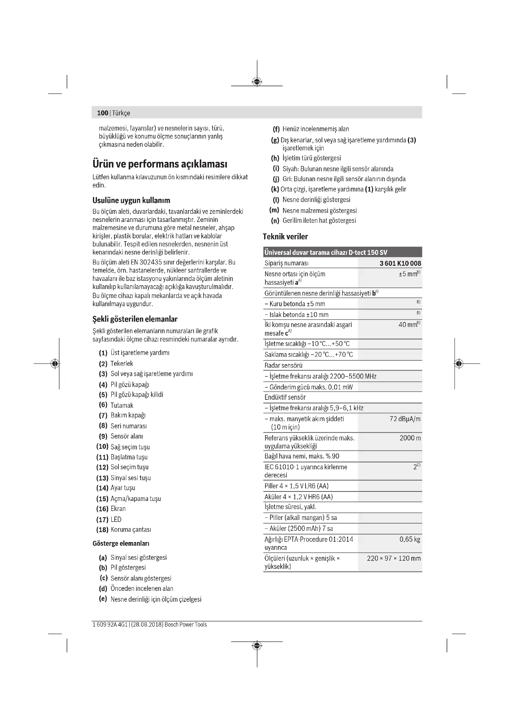 Τα όργανα μέτρησης, οι επαναφορτιζόμενες μπαταρίες/ μπαταρίες, τα εξαρτήματα και οι συσκευασίες πρέπει να ανακυκλώνονται με τρόπο φιλικό προς το περιβάλλον. Μη ρίχνετε τα όργανα μέτρησης και τις επαναφορτιζόμενες μπαταρίες/μπαταρίες στα οικιακά απορρίμματα! Μόνο για χώρες τηςΕΕ: Σύμφωνα με την Ευρωπαϊκή οδηγία 2012/19/ΕΕ τα άχρηστα όργανα μέτρησης και σύμφωνα με την Ευρωπαϊκή οδηγία 2006/66/ΕΚ οι χαλασμένες ή χρησιμοποιημένες μπαταρίες δεν είναι πλέον υποχρεωτικό να συλλέγονται ξεχωριστά για να ανακυκλωθούν με τρόπο φιλικό προς το περιβάλλον. Türkçe Güvenlik talimatı Bütün talimat ve uyarılar okunmalı ve bunlara uyulmalıdır. Ölçme cihazı bu güvenlik talimatına uygun olarak kullanılmazsa, ölçme cihazına entegre koruyucu donanımların işlevi kısıtlanabilir. BU TALİMATI İYİ VE GÜVENLİ BİR YERDE SAKLAYIN. u Ölçme cihazının sadece kalifiye uzman personel tarafından ve orijinal yedek parçalarla onarılmasını sağlayın. Bu sayede ölçme cihazının güvenliğini sağlarsınız. u Ölçme cihazı ile içinde yanıcı sıvılar, gazlar veya tozlar bulunan patlama riski bulunan ortamlarda çalışmayın. Ölçme cihazı içinde tozu veya buharları tutuşturabilecek kıvılcımlar oluşabilir. u Bu ölçüm aleti teknolojik açıdan yüzde yüzlük bir güvenlik sağlayamaz. Bu nedenle, tehlikeleri önlemek için, duvarda, tavanda veya zeminde yapılacak her delme, kesme veya frezeleme işleminden önce yapı planları, yapım esnasındaki fotoğraflar gibi diğer bilgi kaynaklarına da başvurun. Havadaki nem oranı, diğer elektrikli aletlerin yakınında bulunma gibi çevresel etkiler ölçüm aletinin hassasiyetini olumsuz yönde etkileyebilir. Duvarların niteliği ve durumu (örneğin nem, metal içeren yapı malzemeleri, iletken duvar kağıtları, yalıtım Türkçe | 99 Bosch Power Tools 1 609 92A 4G1 | (28.08.2018)100 | Türkçe 1 609 92A 4G1 | (28.08.2018) Bosch Power Tools malzemesi, fayanslar) ve nesnelerin sayısı, türü, büyüklüğü ve konumu ölçme sonuçlarının yanlış çıkmasına neden olabilir. Ürün ve performans açıklaması Lütfen kullanma kılavuzunun ön kısmındaki resimlere dikkat edin. Usulüne uygun kullanım Bu ölçüm aleti, duvarlardaki, tavanlardaki ve zeminlerdeki nesnelerin aranması için tasarlanmıştır. Zeminin malzemesine ve durumuna göre metal nesneler, ahşap kirişler, plastik borular, elektrik hatları ve kablolar bulunabilir. Tespit edilen nesnelerden, nesnenin üst kenarındaki nesne derinliği belirlenir. Bu ölçüm aleti EN302435 sınır değerlerini karşılar. Bu temelde, örn. hastanelerde, nükleer santrallerde ve havaalanı ile baz istasyonu yakınlarında ölçüm aletinin kullanılıp kullanılamayacağı açıklığa kavuşturulmalıdır. Bu ölçme cihazı kapalı mekanlarda ve açık havada kullanılmaya uygundur. Şekli gösterilen elemanlar Şekli gösterilen elemanların numaraları ile grafik sayfasındaki ölçme cihazı resmindeki numaralar aynıdır. (1) Üst işaretleme yardımı (2) Tekerlek (3) Sol veya sağ işaretleme yardımı (4) Pil gözü kapağı (5) Pil gözü kapağı kilidi (6) Tutamak (7) Bakım kapağı (8) Seri numarası (9) Sensör alanı (10) Sağ seçim tuşu (11) Başlatma tuşu (12) Sol seçim tuşu (13) Sinyal sesi tuşu (14) Ayar tuşu (15) Açma/kapama tuşu (16) Ekran (17) LED (18) Koruma çantası Gösterge elemanları (a) Sinyal sesi göstergesi (b) Pil göstergesi (c) Sensör alanı göstergesi (d) Önceden incelenen alan (e) Nesne derinliği için ölçüm çizelgesi (f) Henüz incelenmemiş alan (g) Dış kenarlar, sol veya sağ işaretleme yardımında(3) işaretlemek için (h) İşletim türü göstergesi (i) Siyah: Bulunan nesne ilgili sensör alanında (j) Gri: Bulunan nesne ilgili sensör alanının dışında (k) Orta çizgi, işaretleme yardımına(1) karşılık gelir (l) Nesne derinliği göstergesi (m) Nesne malzemesi göstergesi (n) Gerilim ileten hat göstergesi Teknik veriler Üniversal duvar tarama cihazı D-tect 150 SV Sipariş numarası 3 601 K10 008 Nesne ortası için ölçüm hassasiyetia