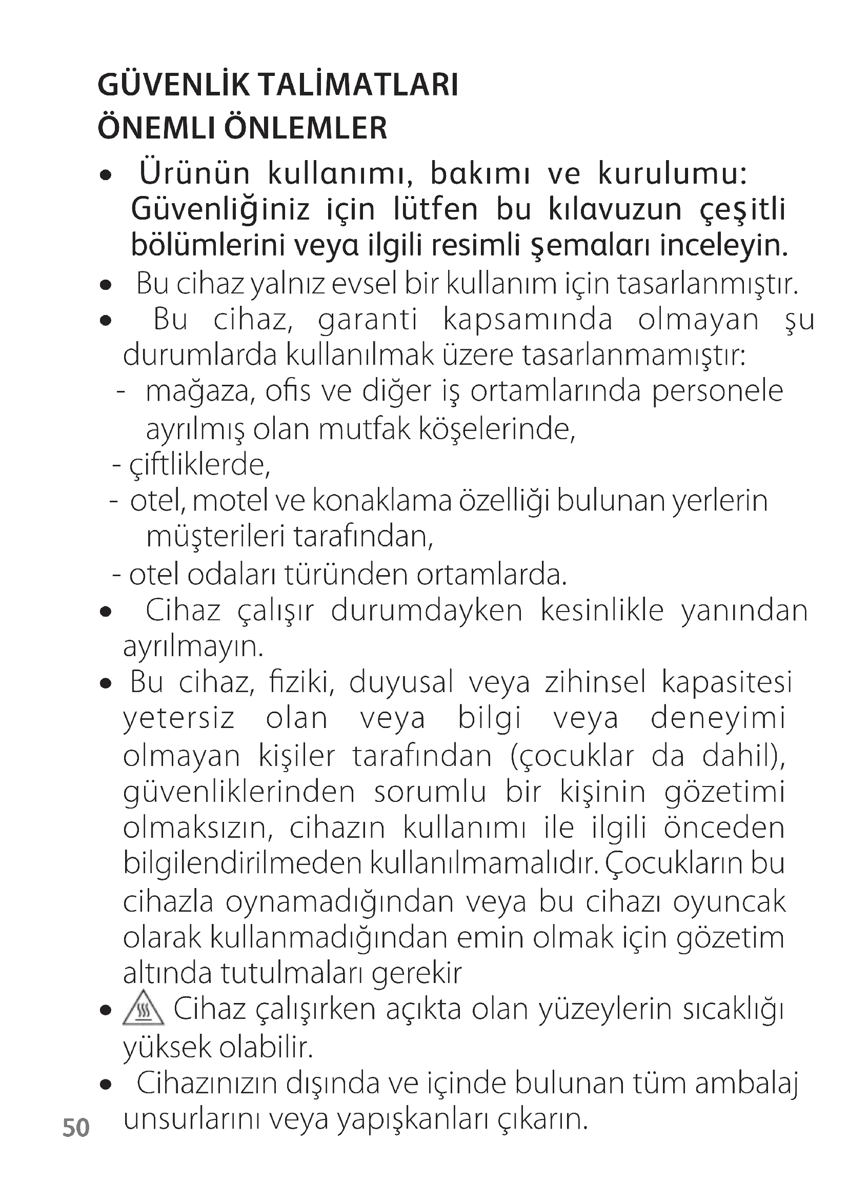 - Cihaz soğuyana kadar çocukların erişiminden uzak tutun. YAPILMAMASI GEREKEN