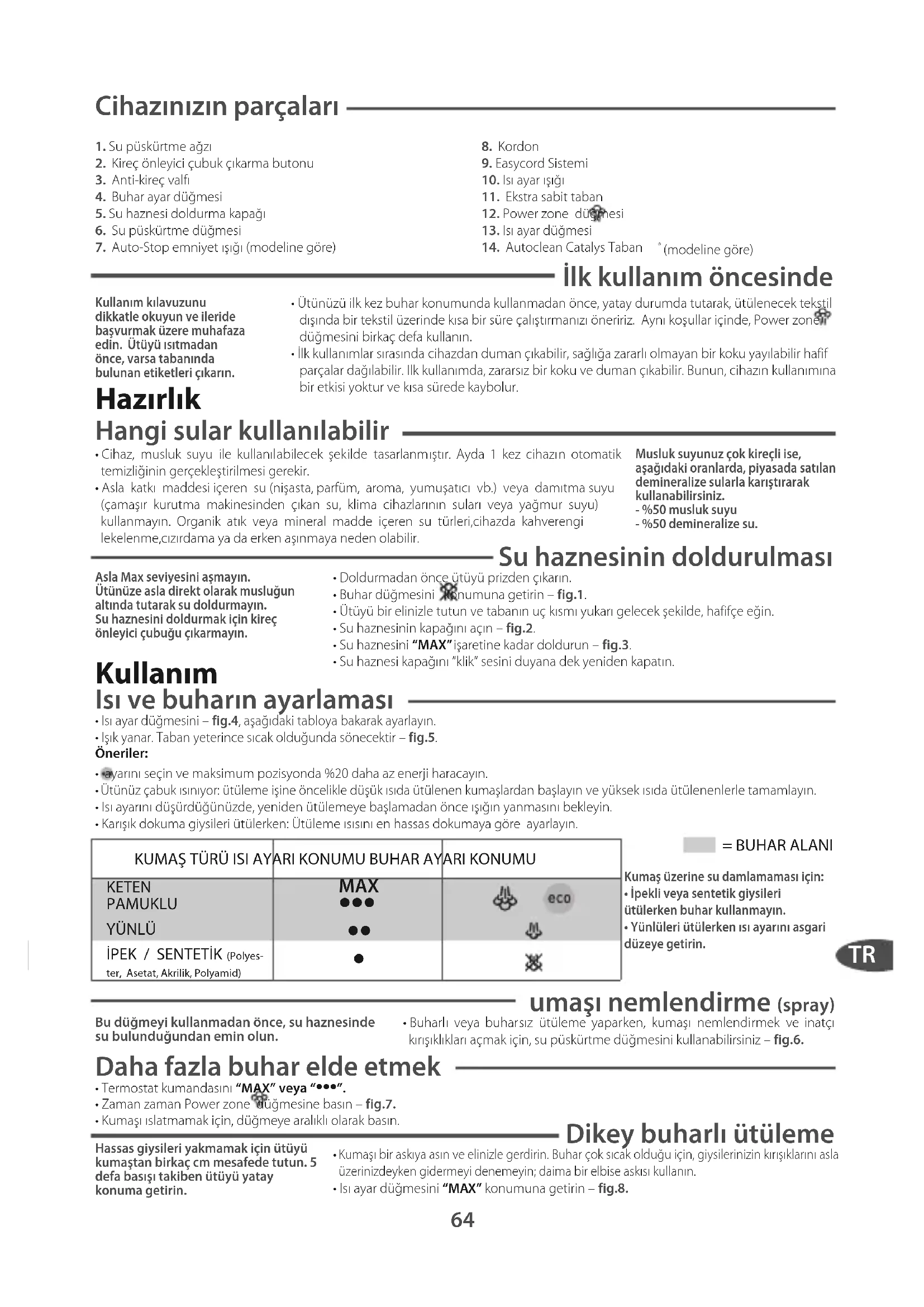 - Isı ayar düğmesini “MAX” konumuna getirin – fig.8. Asla Max seviyesini aşmayın. Ütünüze asla direkt olarak musluğunaltında tutarak su doldurmayın.Su haznesini doldurmak için kireçönleyici çubuğu çıkarmayın.= BUHAR ALANIKumaş üzerine su damlamaması için: • İpekli veya sentetik giysileriütülerken buhar kullanmayın. • Yünlüleri ütülerken ısı ayarını asgaridüzeye getirin. Hassas giysileri yakmamak için ütüyükumaştan birkaç cm mesafede tutun. 5defa basışı takiben ütüyü yataykonuma getirin.KUMAŞ TÜRÜ ISI AYARI KONUMU BUHAR AYARI KONUMUKETENPAMUKLUYÜNLÜİPEK / SENTETİK (Polyes-ter, Asetat, Akrilik, Polyamid) MAX