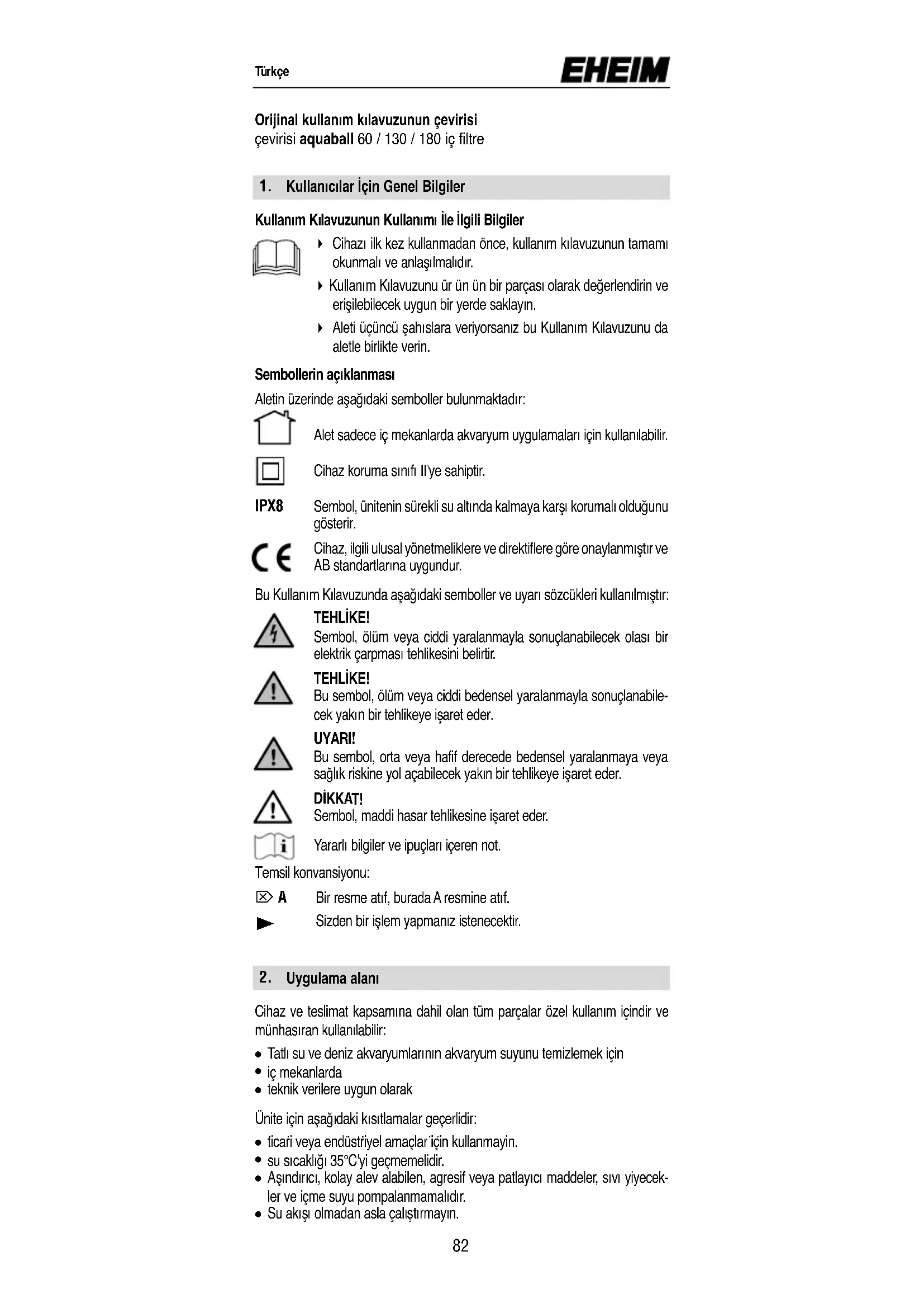 Scoaterea din funcţiune1. Kullanıcılar İçin Genel Bilgiler Kullanım Kılavuzunun Kullanımı İle İlgili Bilgiler 4 Cihazı ilk kez kullanmadan önce, kullanım kılavuzunun tamamı okunmalı ve anlaşılmalıdır. 4 Kullanım Kılavuzunu ur un un bir parçası olarak değerlendirin ve erişilebilecek uygun bir yerde saklayın. 4 Aleti uçuncu şahıslara veriyorsanız bu Kullanım Kılavuzunu da aletle birlikte verin. Sembollerin açıklanması Aletin uzerinde aşağıdaki semboller bulunmaktadır: Alet sadece iç mekanlarda akvaryum uygulamaları için kullanılabilir