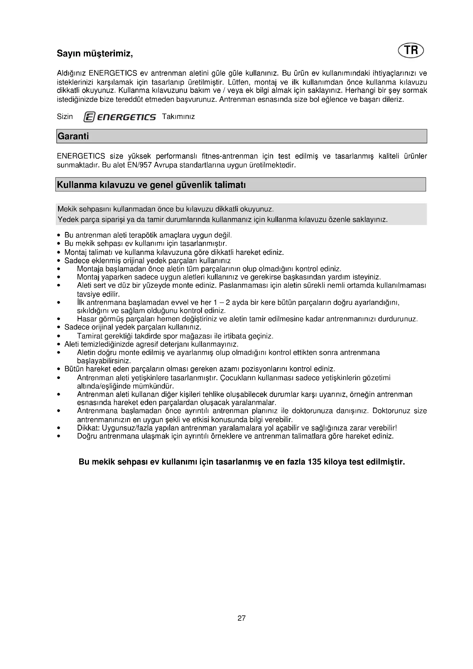 Sayın müşterimiz, Aldığınız ENERGETICS ev antrenman aletini güle güle kullanınız. Bu ürün ev kullanımındaki ihtiyaçlarınızı ve isteklerinizi karşılamak için tasarlanıp üretilmiştir. Lütfen, montaj ve ilk kullanımdan önce kullanma kılavuzu dikkatli okuyunuz. Kullanma kılavuzunu bakım ve / veya ek bilgi almak için saklayınız. Herhangi bir şey sormak istediğinizde bize tereddüt etmeden başvurunuz. Antrenman esnasında size bol eğlence ve başarı dileriz. Sizin Takımınız Garanti ENERGETICS size yüksek performanslı fitnes-antrenman için test edilmiş ve tasarlanmış kaliteli ürünler sunmaktadır. Bu alet EN/957 Avrupa standartlarına uygun üretilmektedir. Kullanma kılavuzu ve genel güvenlik talimatı
