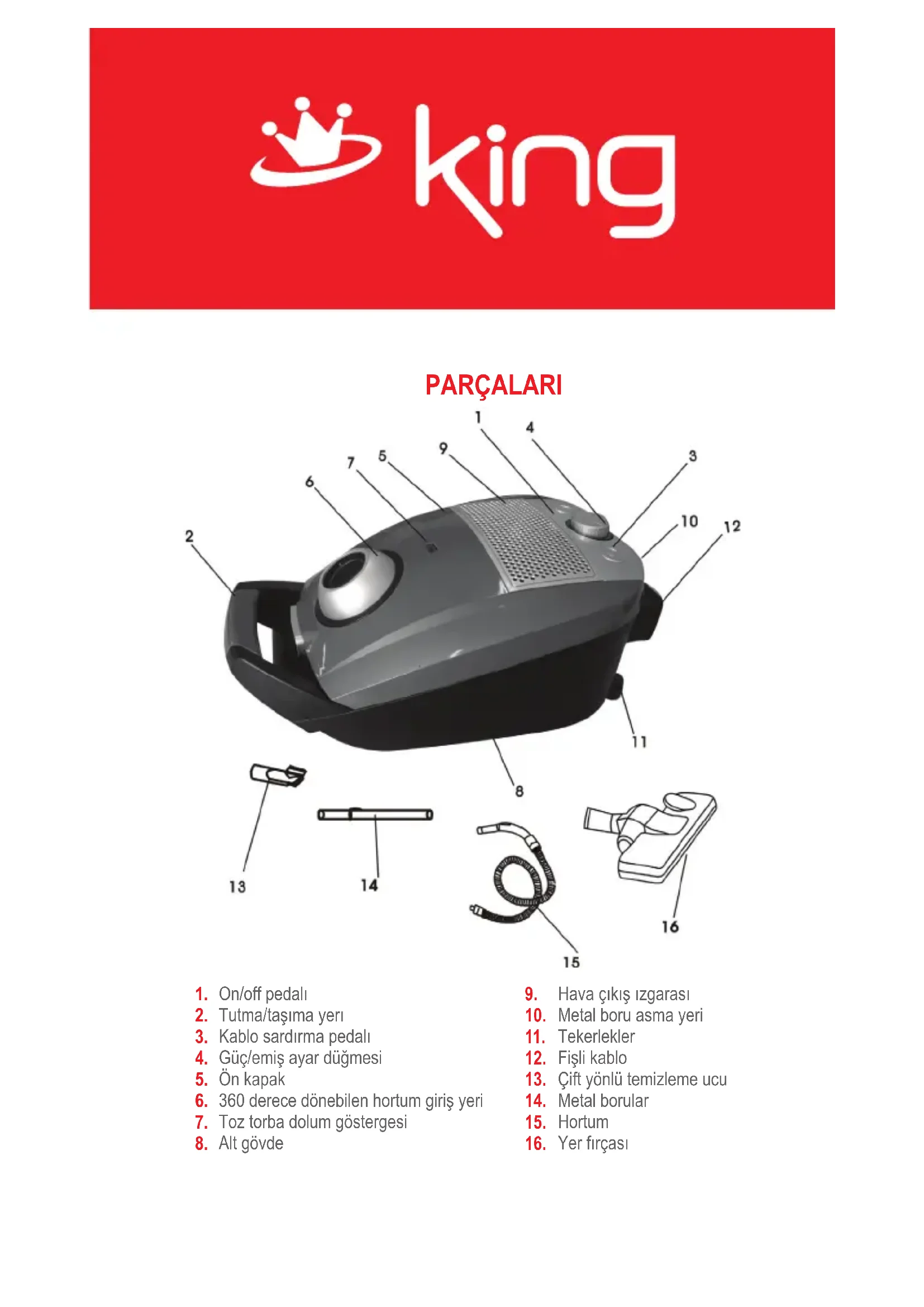 UYARI: Bu cihazla ilgili her turlu tamir ve onarim yaliniz King Yetkili Servisleri tarafindan yapilir. Yetkili Servislerimiz disindaki kisilerce yapilan herhangi bir tamir ve onarimi girisimi tuketici haklarinin tamamen ortadan kalkmasina neden olacaktir. Bu cihazla ilgili tum yedek parcalar yaliniz bu kilavuz kitapciinda sunulan King Yetkili Servisleri'nden temin edilmek zorundadir. King Servislerinden temin edilmemi King harici yedek parcalar ile yapilan tamiratlardan sirketimiz sorumlu degildir. Bir sorun ile karstilaastiginizda luffen bizi arayiniz.