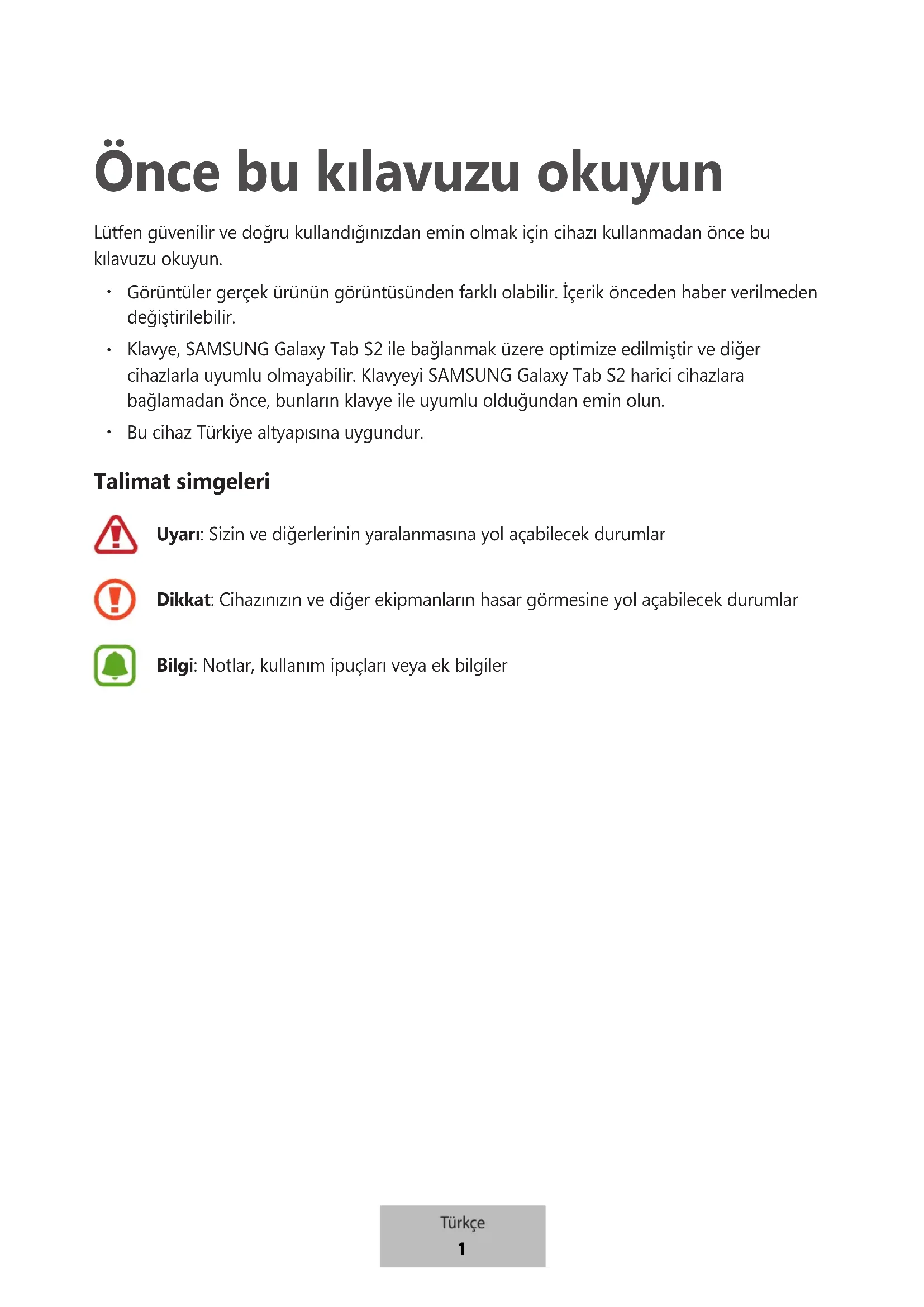 Klavye, SAMSUNG Galaxy Tab S2 ile bağlanmak üzere optimize edilmiştir ve diğer cihazlarla uyumlu olmayabilir. Klavyeyi SAMSUNG Galaxy Tab S2 harici cihazlara bağlamadan önce, bunların klavye ile uyumlu olduğundan emin olun.