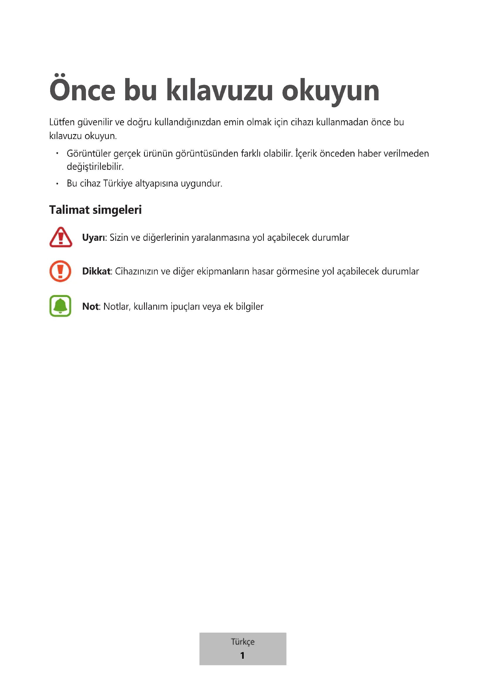 Bu cihaz Türkiye altyapısına uygundur. Talimat simgeleri Uyarı: Sizin ve diğerlerinin yaralanmasına yol açabilecek durumlar Dikkat: Cihazınızın ve diğer ekipmanların hasar görmesine yol açabilecek durumlar Not: Notlar, kullanım ipuçları veya ek bilgiler Türkçe