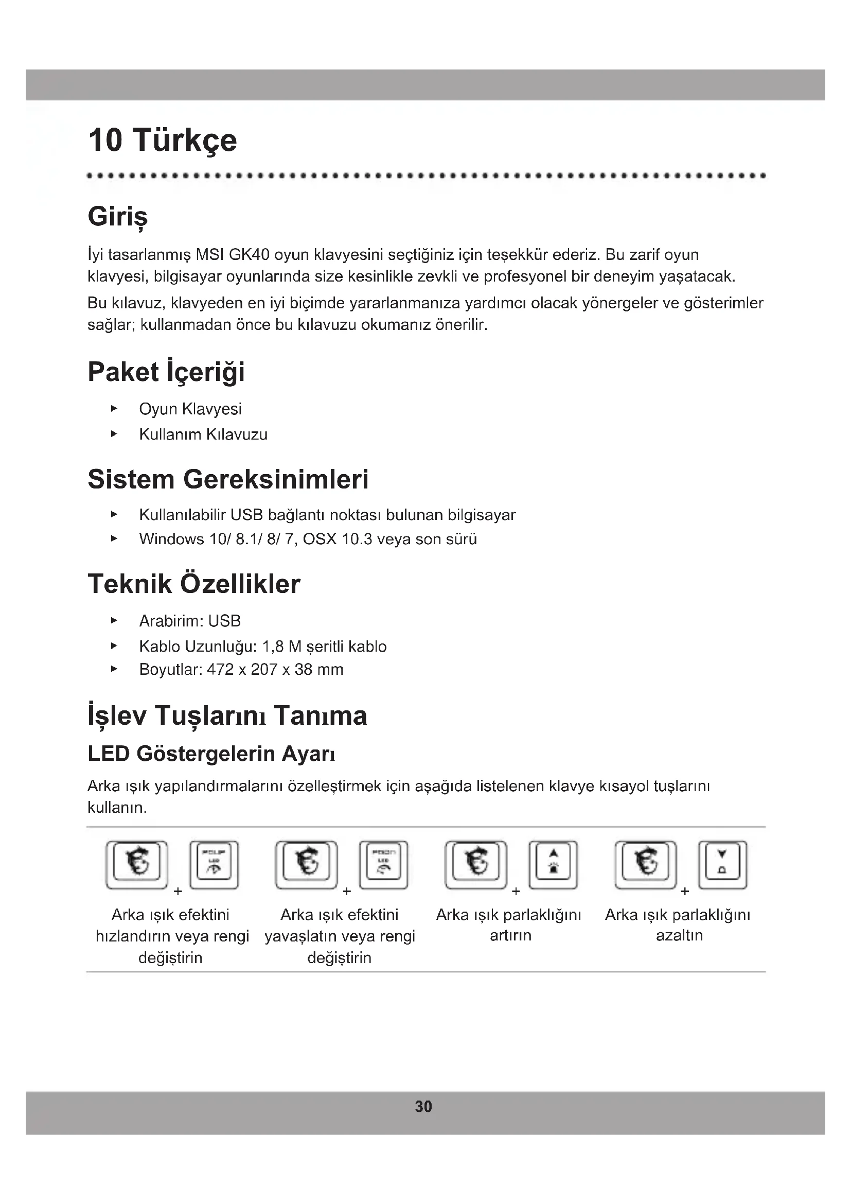 - Pulsa + o para ajustar el color. Referencia: Anti-ghosting Tab+Caps+Shift+Ctrl+Q+W+E+R+T+A+S+D+F+G+Z+X+C+V+B+Space 20 keys Q+W+E+R+T+Y+U+I+O+P+Space 11 keys A+S+D+F+G+H+J+K+L+; +Space 11 keys Z+X+C+V+B+N+M+,+.+/+Backspace 11 keys TAB+CAPS+Shift+Ctrl+Alt+Q+W+E+A+S+D+Z+X+C 14 keys TAB+CAPS+Shift+Ctrl+Space+Q+W+E+A+S+D+F+G+Z+X+C+↑+←+↓+→ 20 keys Shift-L+Shift-R+Ctrl-L+Ctrl-R+Alt-L+Alt-R+Space+↑+←+↓+→ 11 keys A+S+D+F+J+K+L+;+Backspace 9 keys30 10 Türkçe Giriş İyitasarlanmışMSIGK40oyunklavyesiniseçtiğiniziçinteşekkürederiz.Buzarifoyun klavyesi,bilgisayaroyunlarındasizekesinliklezevkliveprofesyonelbirdeneyimyaşatacak. Bukılavuz,klavyedeneniyibiçimdeyararlanmanızayardımcıolacakyönergelervegösterimler sağlar;kullanmadanöncebukılavuzuokumanızönerilir. Paket İçeriği ▶ Oyun Klavyesi ▶ KullanımKılavuzu Sistem Gereksinimleri ▶ KullanılabilirUSBbağlantınoktasıbulunanbilgisayar ▶ Windows10/8.1/8/7,OSX10.3veyasonsürü Teknik Özellikler ▶ Arabirim: USB ▶ KabloUzunluğu:1,8Mşeritlikablo ▶ Boyutlar: 472 x 207 x 38 mm İşlev Tuşlarını Tanıma LED Göstergelerin Ayarı Arkaışıkyapılandırmalarınıözelleştirmekiçinaşağıdalistelenenklavyekısayoltuşlarını kullanın.