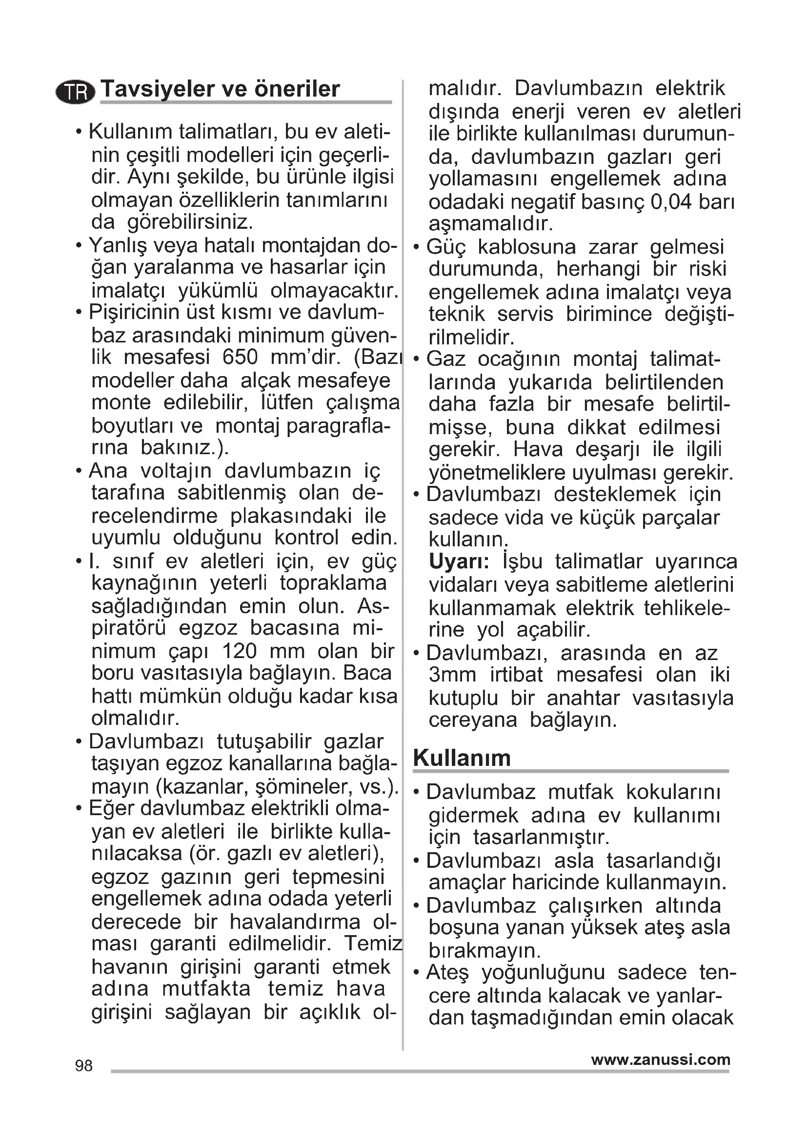 - Davlumbazı asla tasarlandığı amaçlar haricinde kullanmayın.