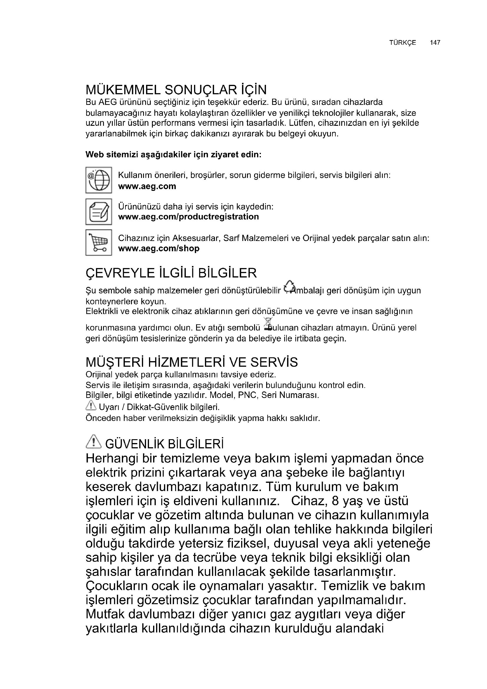 Bu AEG ürününü seçtiğiniz için teşekkür ederiz. Bu ürünü, sıradan cihazlarda bulamayacağınız hayatı kolaylaştıran özellikler ve yenilikçi teknolojiler kullanarak, size uzun yıllar üstün performans vermesi için tasarladık. Lütfen, cihazınızdan en iyi şekilde yararlanabilmek için birkaç dakikanızı ayırarak bu belgeyi okuyun. Web sitemizi aşağıdakiler için ziyaret edin: Kullanım önerileri, broşürler, sorun giderme bilgileri, servis bilgileri alın: www.aeg.com Ürününüzü daha iyi servis için kaydedin: www.aeg.com/productregistration Cihazınız için Aksesuarlar, Sarf Malzemeleri ve Orijinal yedek parçalar satın alın: www.aeg.com/shop