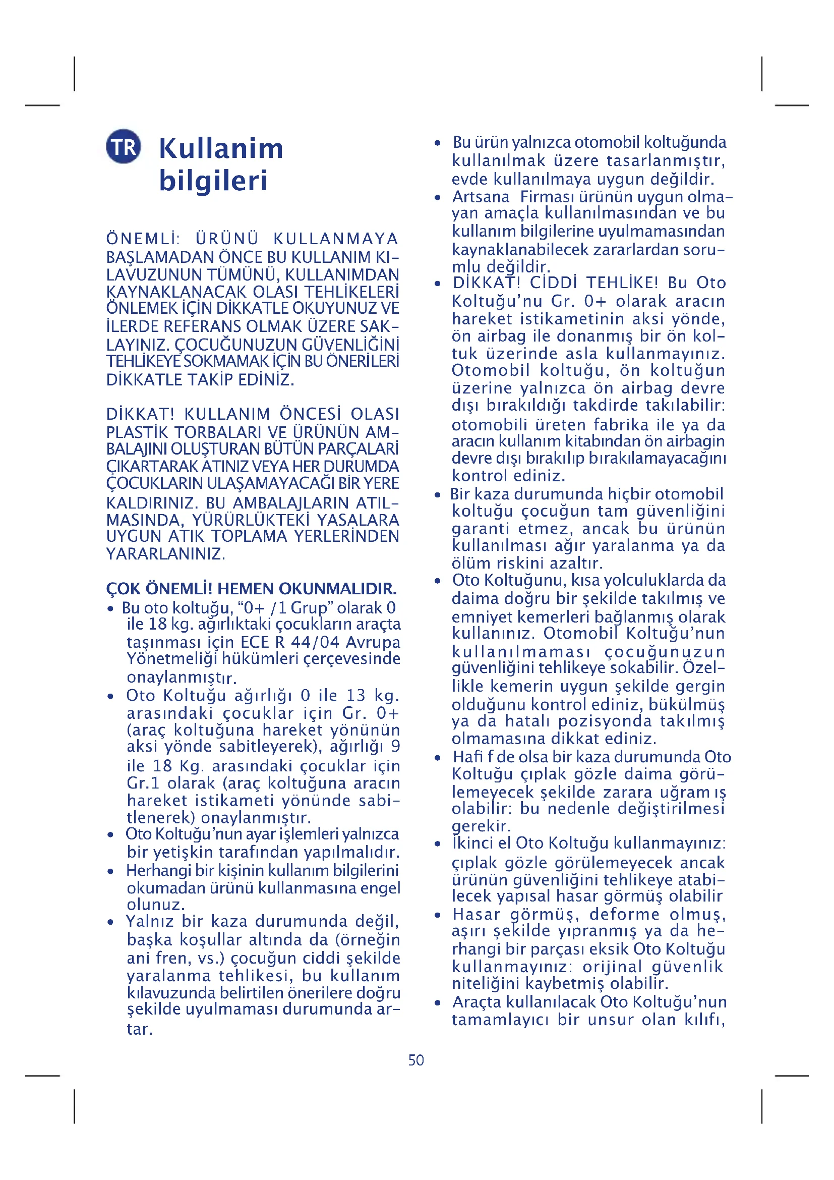 - DİKKAT! CİDDİ TEHLİKE! Bu Oto Koltuğuʼnu Gr. 0+ olarak aracın hareket istikametinin aksi yönde, ön airbag ile donanmış bir ön kol- tuk üzerinde asla kullanmayınız. Otomobil koltuğu, ön koltuğun üzerine yalnızca ön airbag devre dışı bırakıldığı takdirde takılabilir: otomobili üreten fabrika ile ya da aracın kullanım kitabından ön airbagin devre dışı bırakılıp b ırakılamayacağını kontrol ediniz.