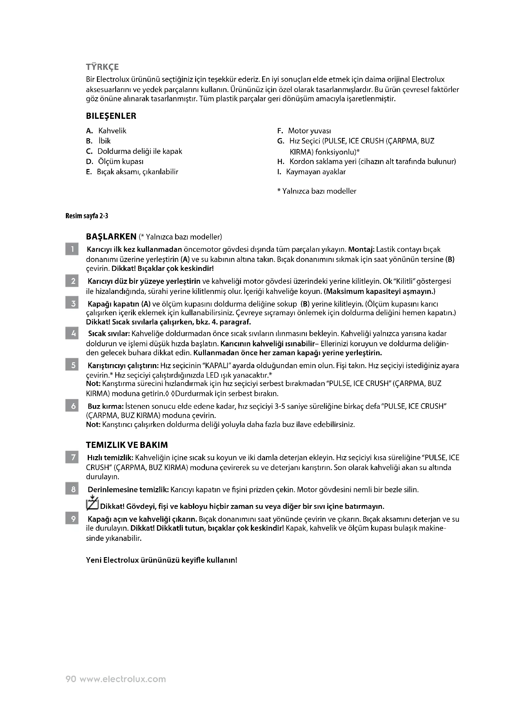 Bir Electrolux ürününü seçtiğiniz için teşekkür ederiz. En iyi sonuçları elde etmek için daima orijinal Electrolux aksesuarlarını ve yedek parçalarını kullanın. Ürününüz için özel olarak tasarlanmışlardır. Bu ürün çevresel faktörler göz önüne alınarak tasarlanmıştır. Tüm plastik parçalar geri dönüşüm amacıyla işaretlenmiştir. BILEŞENLER A. Kahvelik B. İbik C. Doldurma deliği ile kapak D. Ölçüm kupası E. Bıçak aksamı, çıkarılabilir F. Motor yuvası G. Hız Seçici (PULSE, ICE CRUSH (ÇARPMA, BUZ KIRMA) fonksiyonlu)* H. Kordon saklama yeri (cihazın alt tarafında bulunur)