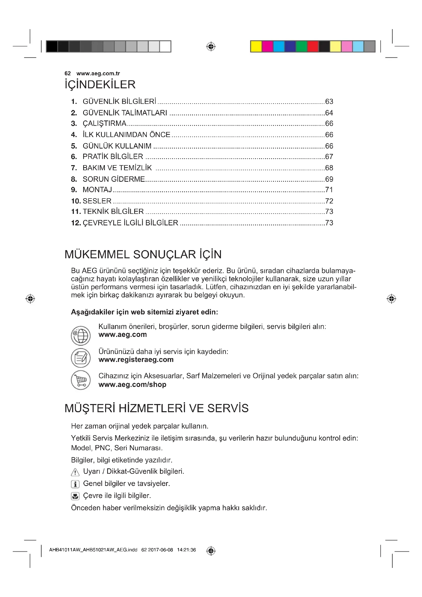 Bu AEG ürününü seçtiğiniz için teşekkür ederiz. Bu ürünü, sıradan cihazlarda bulamaya- cağınız hayatı kolaylaştıran özellikler ve yenilikçi teknolojiler kullanarak, size uzun yıllar üstün performans vermesi için tasarladık. Lütfen, cihazınızdan en iyi şekilde yararlanabil- mek için birkaç dakikanızı ayırarak bu belgeyi okuyun. Aşağıdakiler için web sitemizi ziyaret edin: Kullanım önerileri, broşürler, sorun giderme bilgileri, servis bilgileri alın: www.aeg.com Ürününüzü daha iyi servis için kaydedin: www.registeraeg.com Cihazınız için Aksesuarlar, Sarf Malzemeleri ve Orijinal yedek parçalar satın alın: www.aeg.com/shop MÜŞTERİ HİZMETLERİ VE SERVİS Her zaman orijinal yedek parçalar kullanın. Yetkili Servis Merkeziniz ile iletişim sırasında, şu verilerin hazır bulunduğunu kontrol edin: Model, PNC, Seri Numarası. Bilgiler, bilgi etiketinde yazılıdır. Uyarı / Dikkat-Güvenlik bilgileri. Genel bilgiler ve tavsiyeler. Çevre ile ilgili bilgiler. Önceden haber verilmeksizin değişiklik yapma hakkı saklıdır. İÇİNDEKİLER