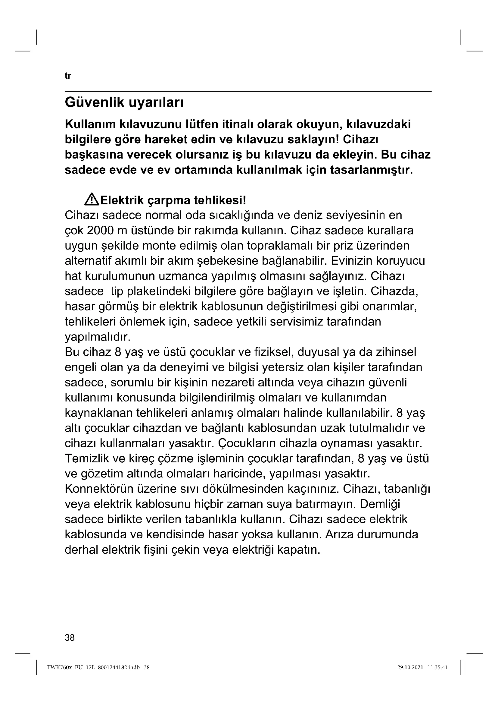 Güvenlik uyarıları Kullanım kılavuzunu lütfen itinalı olarak okuyun, kılavuzdaki bilgilere göre hareket edin ve kılavuzu saklayın! Cihazı başkasına verecek olursanız iş bu kılavuzu da ekleyin. Bu cihaz sadece evde ve ev ortamında kullanılmak için tasarlanmıştır. WElektrik çarpma tehlikesi! Cihazı sadece normal oda sıcaklığında ve deniz seviyesinin en çok 2000 m üstünde bir rakımda kullanın. Cihaz sadece kurallara uygun şekilde monte edilmiş olan topraklamalı bir priz üzerinden alternatif akımlı bir akım şebekesine bağlanabilir. Evinizin koruyucu hat kurulumunun uzmanca yapılmış olmasını sağlayınız. Cihazı sadece tip plaketindeki bilgilere göre bağlayın ve işletin. Cihazda, hasar görmüş bir elektrik kablosunun değiştirilmesi gibi onarımlar, tehlikeleri önlemek için, sadece yetkili servisimiz tarafından yapılmalıdır. Bu cihaz 8 yaş ve üstü çocuklar ve fiziksel, duyusal ya da zihinsel engeli olan ya da deneyimi ve bilgisi yetersiz olan kişiler tarafından sadece, sorumlu bir kişinin nezareti altında veya cihazın güvenli kullanımı konusunda bilgilendirilmiş olmaları ve kullanımdan kaynaklanan tehlikeleri anlamış olmaları halinde kullanılabilir. 8 yaş altı çocuklar cihazdan ve bağlantı kablosundan uzak tutulmalıdır ve cihazı kullanmaları yasaktır. Çocukların cihazla oynaması yasaktır. Temizlik ve kireç çözme işleminin çocuklar tarafından, 8 yaş ve üstü ve gözetim altında olmaları haricinde, yapılması yasaktır. Konnektörün üzerine sıvı dökülmesinden kaçınınız. Cihazı, tabanlığı veya elektrik kablosunu hiçbir zaman suya batırmayın. Demliği sadece birlikte verilen tabanlıkla kullanın. Cihazı sadece elektrik kablosunda ve kendisinde hasar yoksa kullanın. Arıza durumunda derhal elektrik fişini çekin veya elektriği kapatın.