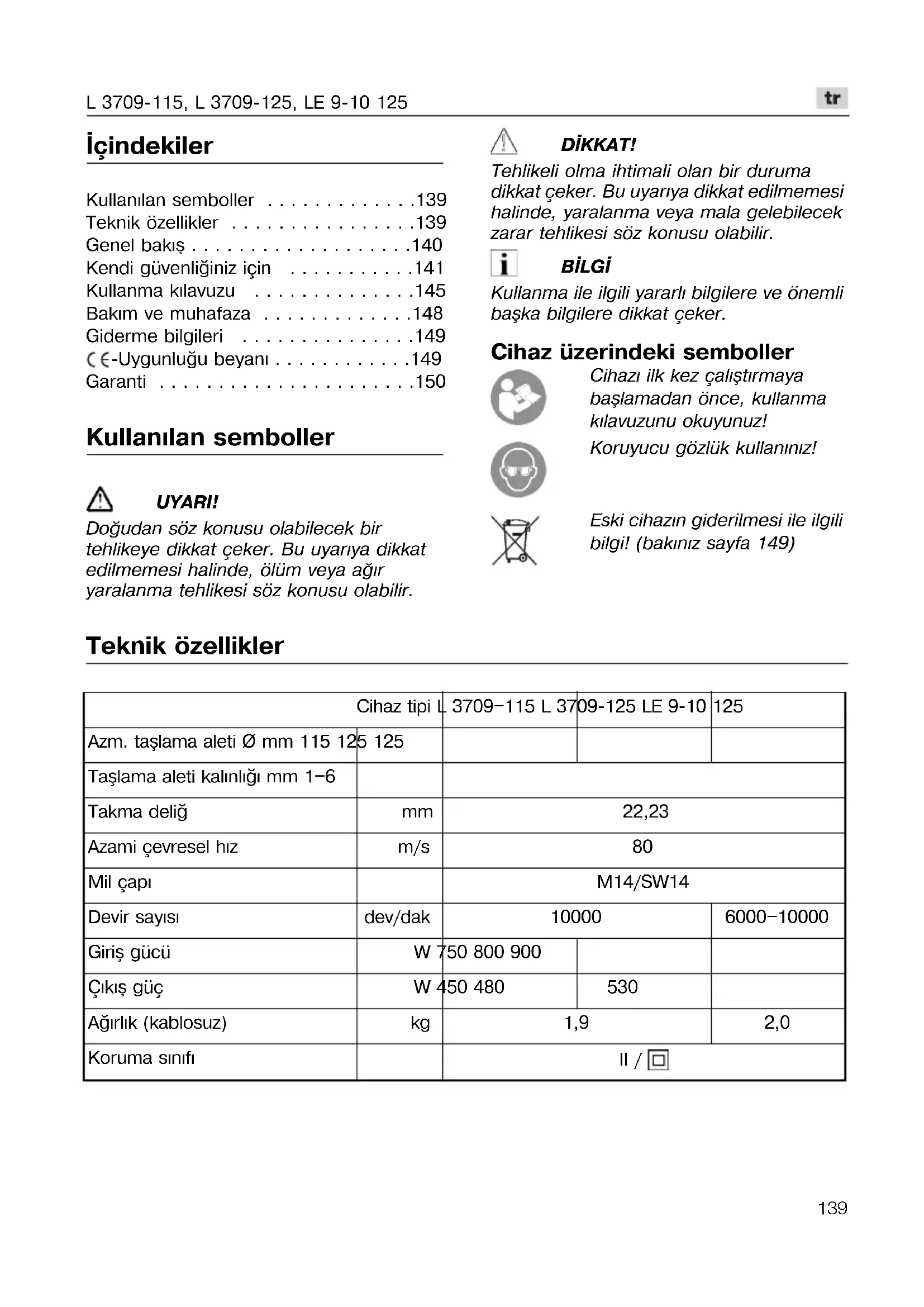 - Garanti Kullanýlan semboller UYARI! Doðudan söz konusu olabilecek bir tehlikeye dikkat çeker. Bu uyarýya dikkat edilmemesi halinde, ölüm veya aðýr yaralanma tehlikesi söz konusu olabilir. DÝKKAT! Tehlikeli olma ihtimali olan bir duruma dikkat çeker. Bu uyarýya dikkat edilmemesi halinde, yaralanma veya mala gelebilecek zarar tehlikesi söz konusu olabilir. BÝLGÝ Kullanma ile ilgili yararlý bilgilere ve önemli baþka bilgilere dikkat çeker. Cihaz üzerindeki semboller Cihazý ilk kez çalýþtýrmaya baþlamadan önce, kullanma kýlavuzunu okuyunuz! Koruyucu gözlük kullanýnýz! Eski cihazýn giderilmesi ile ilgili bilgi! (bakýnýz sayfa 149) Teknik özellikler Cihaz tipi L 3709—115 L 3709-125 LE 9-10 125 Azm. taþlama aleti Ø mm 115 125 125 Taþlama aleti kalýnlýðý mm 1—6 Takma delið mm 22,23 Azami çevresel hýz m/s 80 Mil çapý M14/SW14 Devir sayýsý dev/dak 10000 6000—10000 Giriþ gücü W 750 800 900 Çýkýþ güç W 450 480 530 Aðýrlýk (kablosuz) kg 1,9 2,0 Koruma sýnýfý II /L 3709-115, L 3709-125, LE 9-10 125 p. 150