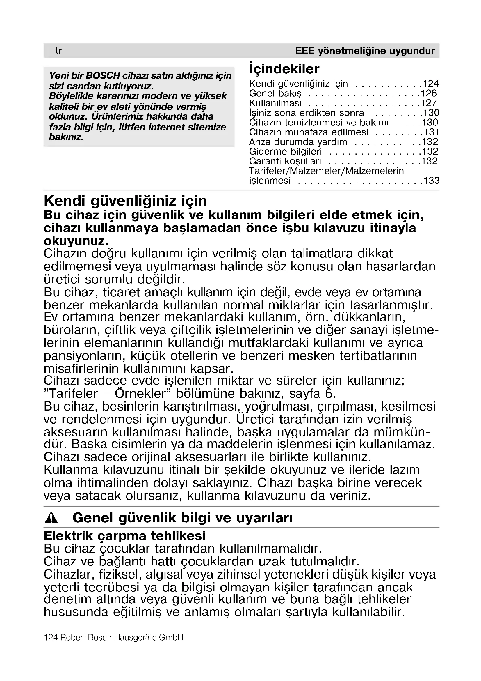- Tarifeler/Malzemeler/Malzemelerin iþlenmesi Kendi güvenliðiniz için Bu cihaz için güvenlik ve kullaným bilgileri elde etmek için, cihazý kullanmaya baþlamadan önce iþbu kýlavuzu itinayla okuyunuz. Cihazýn doðru kullanýmý için verilmiþ olan talimatlara dikkat edilmemesi veya uyulmamasý halinde söz konusu olan hasarlardan üretici sorumlu deðildir. Bu cihaz, ticaret amaçlý kullaným için deðil, evde veya ev ortamýna benzer mekanlarda kullanýlan normal miktarlar için tasarlanmýþtýr. Ev ortamýna benzer mekanlardaki kullaným, örn. dükkanlarýn, bürolarýn, çiftlik veya çiftçilik iþletmelerinin ve diðer sanayi iþletme- lerinin elemanlarýnýn kullandýðý mutfaklardaki kullanýmý ve ayrýca pansiyonlarýn, küçük otellerin ve benzeri mesken tertibatlarýnýn misafirlerinin kullanýmýný kapsar. Cihazý sadece evde iþlenilen miktar ve süreler için kullanýnýz; ”Tarifeler — Örnekler” bölümüne bakýnýz, sayfa 6. Bu cihaz, besinlerin karýþtýrýlmasý, yoðrulmasý, çýrpýlmasý, kesilmesi ve rendelenmesi için uygundur. Üretici tarafýndan izin verilmiþ aksesuarýn kullanýlmasý halinde, baþka uygulamalar da mümkün- dür. Baþka cisimlerin ya da maddelerin iþlenmesi için kullanýlamaz. Cihazý sadece orijinal aksesuarlarý ile birlikte kullanýnýz. Kullanma kýlavuzunu itinalý bir þekilde okuyunuz ve ileride lazým olma ihtimalinden dolayý saklayýnýz. Cihazý baþka birine verecek veya satacak olursanýz, kullanma kýlavuzunu da veriniz. , Genel güvenlik bilgi ve uyarýlarý Elektrik çarpma tehlikesi Bu cihaz çocuklar tarafýndan kullanýlmamalýdýr. Cihaz ve baðlantý hattý çocuklardan uzak tutulmalýdýr. Cihazlar, fiziksel, algýsal veya zihinsel yetenekleri düþük kiþiler veya yeterli tecrübesi ya da bilgisi olmayan kiþiler tarafýndan ancak denetim altýnda veya güvenli kullaným ve buna baðlý tehlikeler hususunda eðitilmiþ ve anlamýþ olmalarý þartýyla kullanýlabilir. p. 133